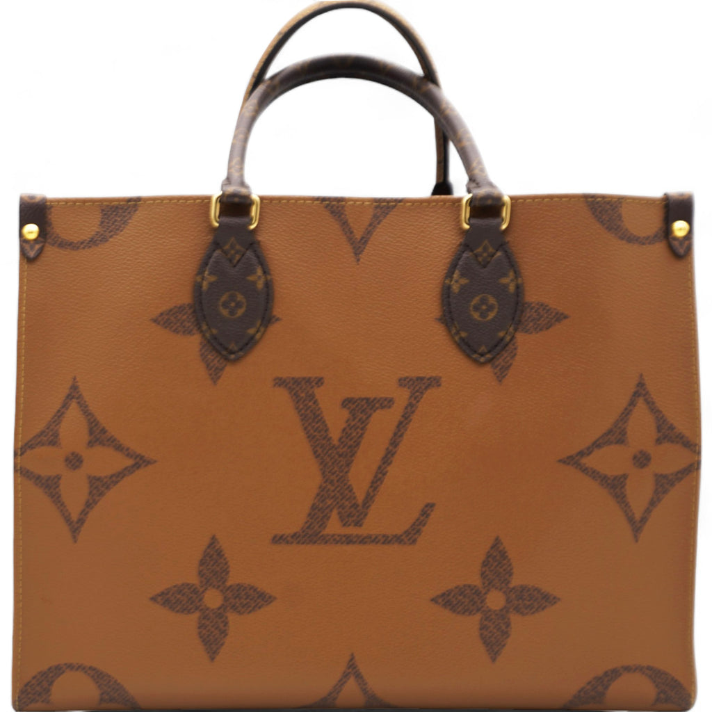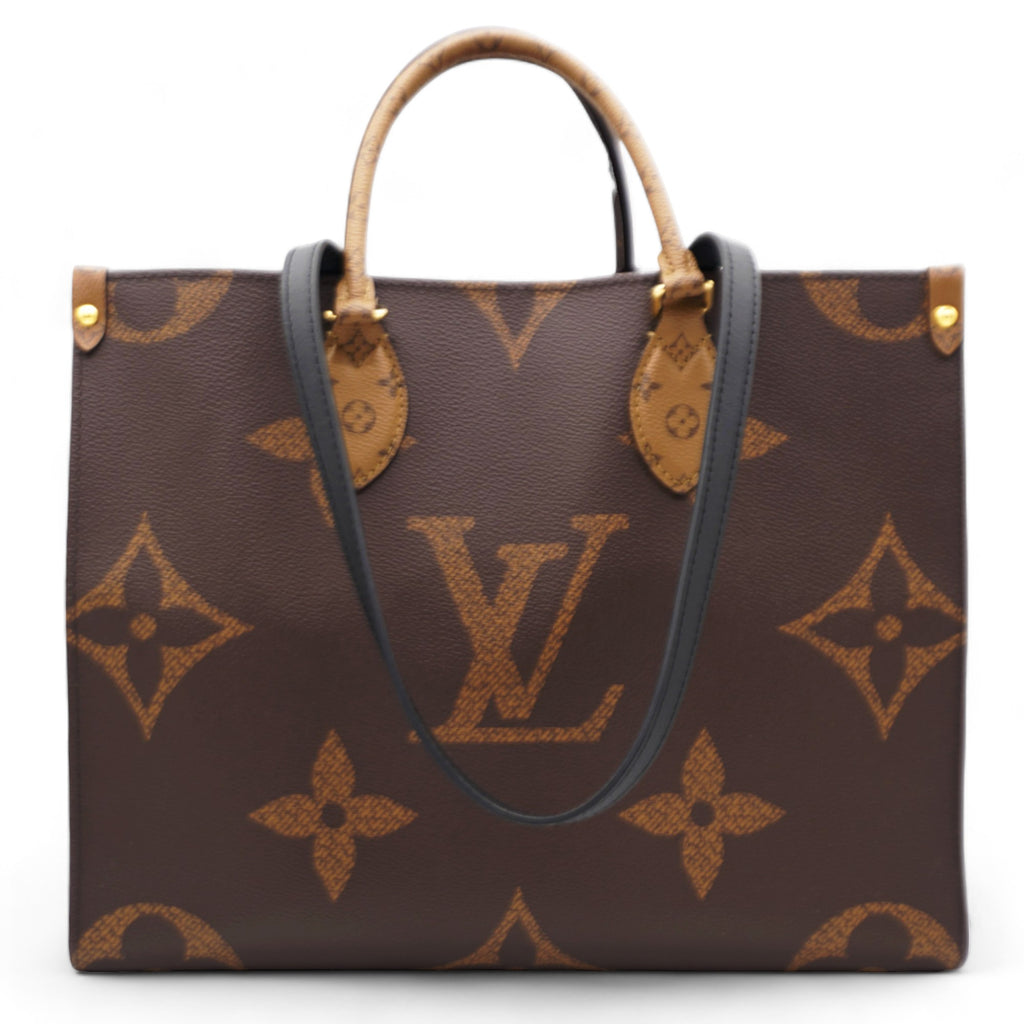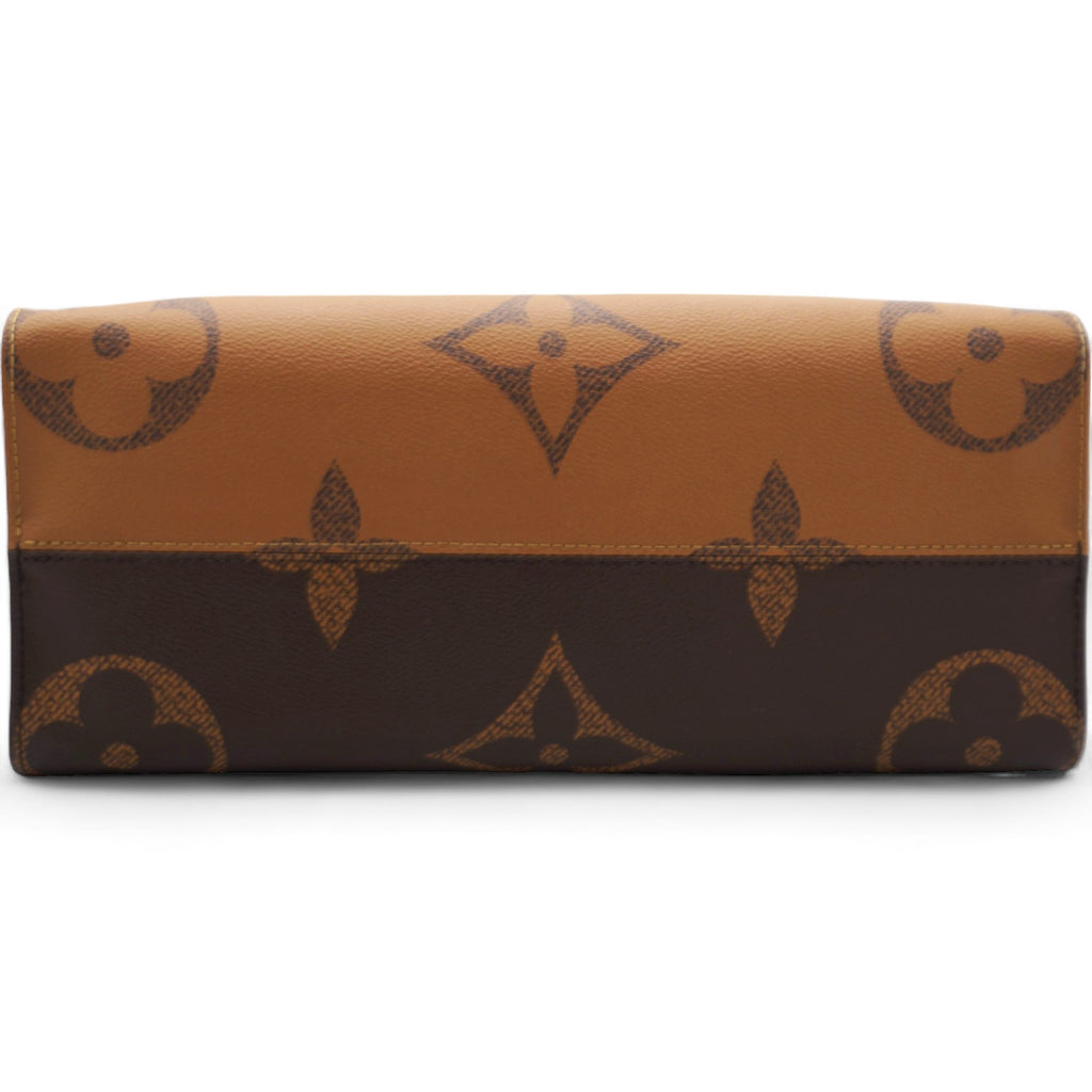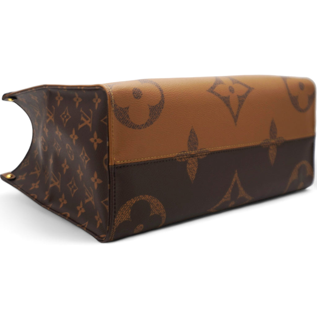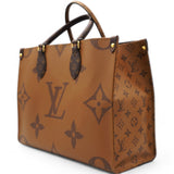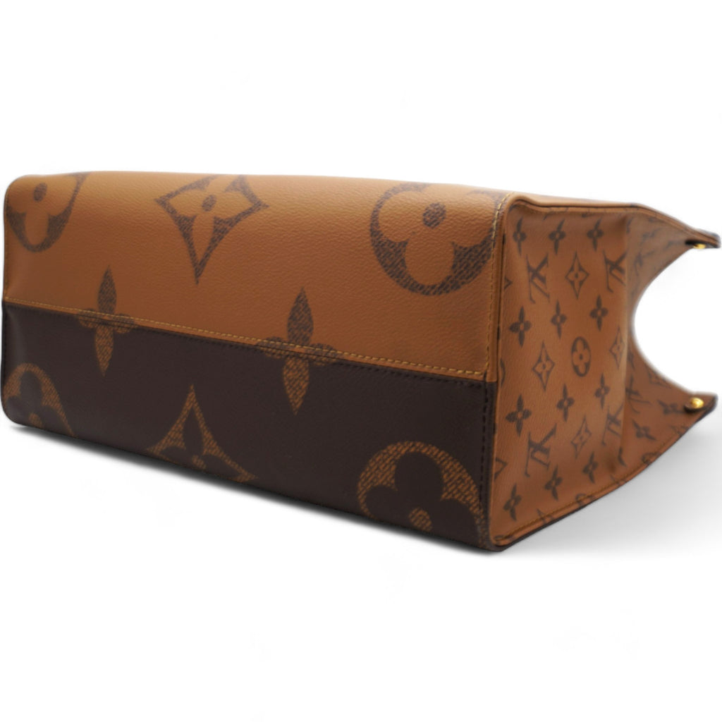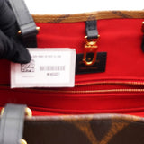 | This tote features oversized and smaller sized versions of the classic Louis Vuitton monogram printed in light and dark brown on coated canvas. The bag features rolled top handles and long shoulder straps that can be tucked away inside the bag, accented with polished gold hardware. The top is open to a red fabric interior with zipper and patch pockets. |