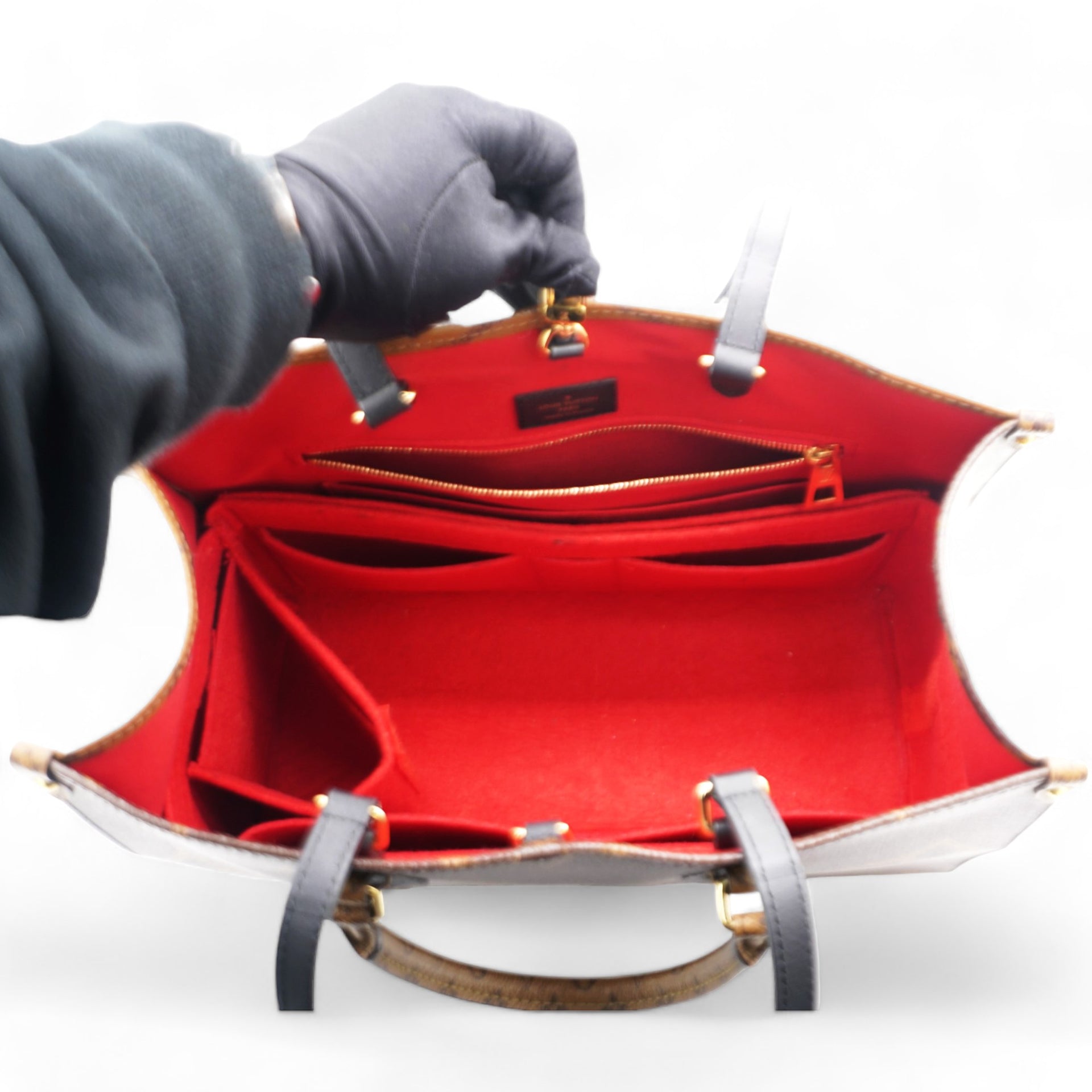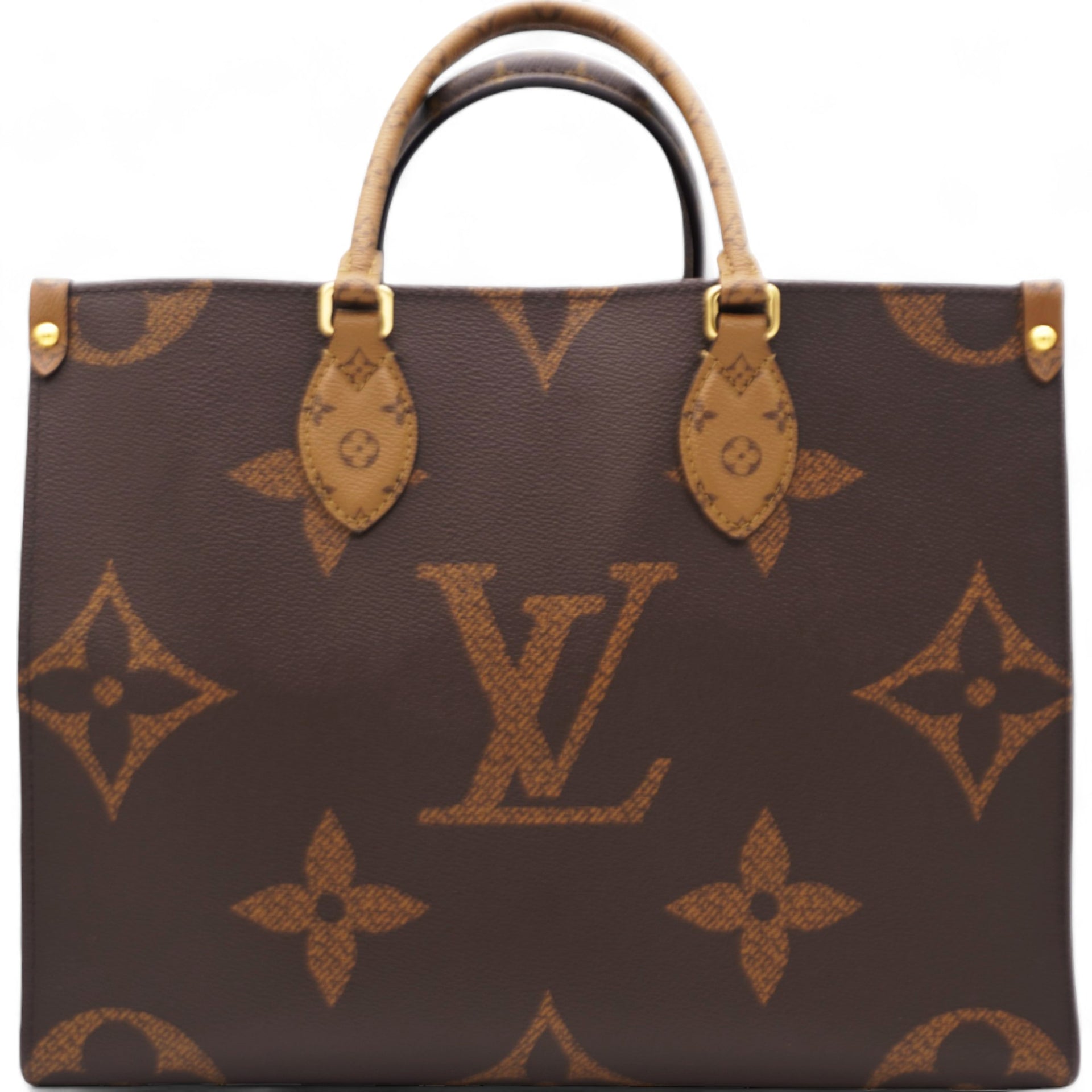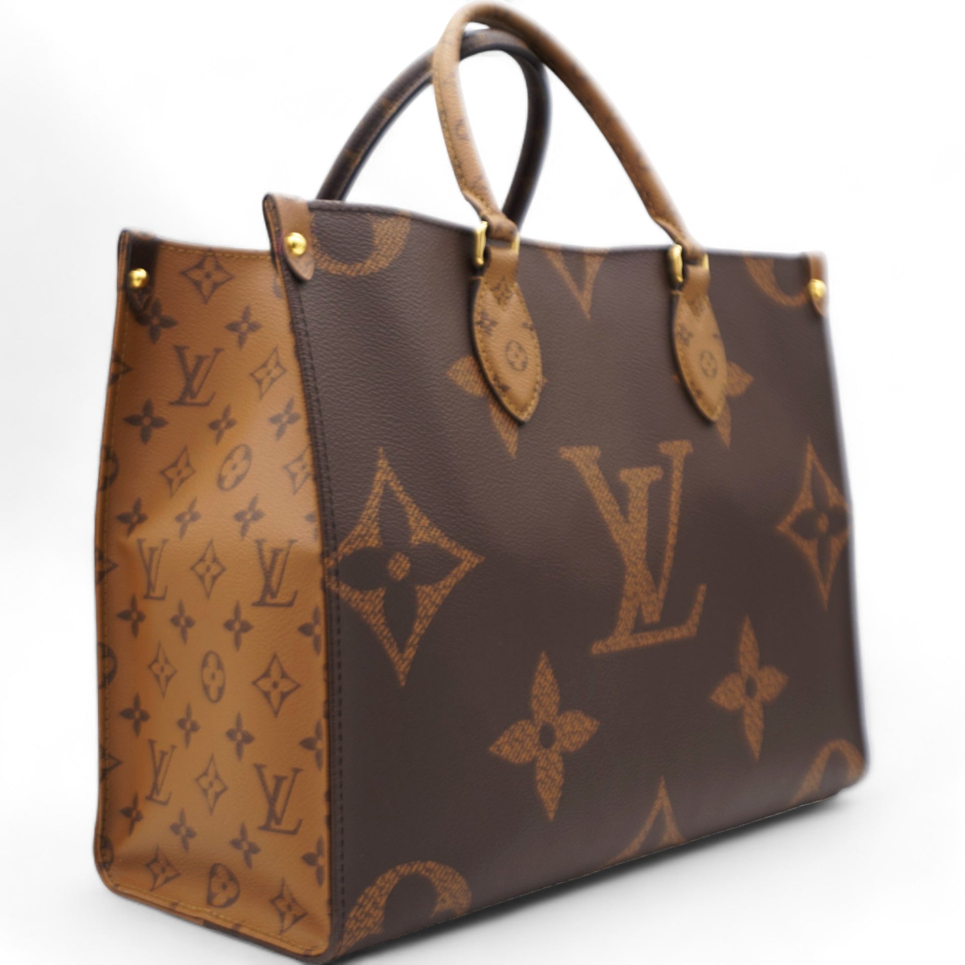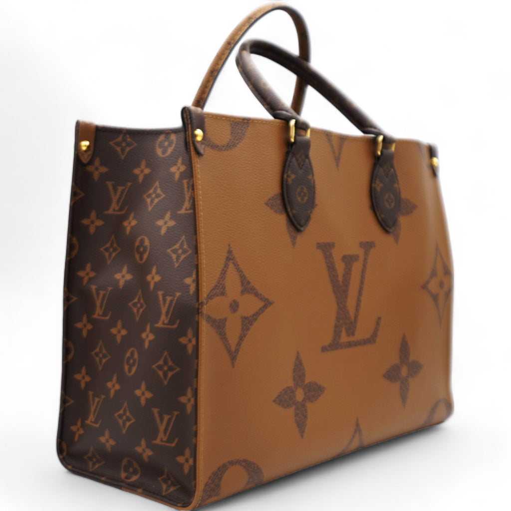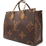 | This tote features oversized and smaller sized versions of the classic Louis Vuitton monogram printed in light and dark brown on coated canvas. The bag features rolled top handles and long shoulder straps that can be tucked away inside the bag, accented with polished gold hardware. The top is open to a red fabric interior with zipper and patch pockets. |