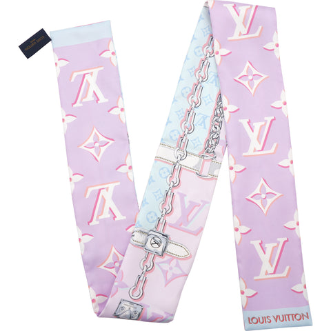 | This very chic 100% silk scarf features an attractive design of the Louis Vuitton monogram printed with classic vachetta straps and chains. This is an excellent scarf with a one of a kind look from Louis Vuitton! |