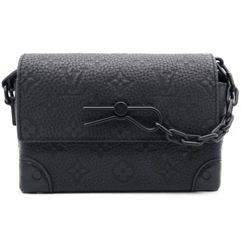 | This compact crossbody is crafted of signature in Louis Vuitton monogram embossed leather in matte black. It features an adjustable black leather shoulder strap, matte black hardware, and chain-and-pin closure. The flap opens a black fabric interior with a zippered compartment. |