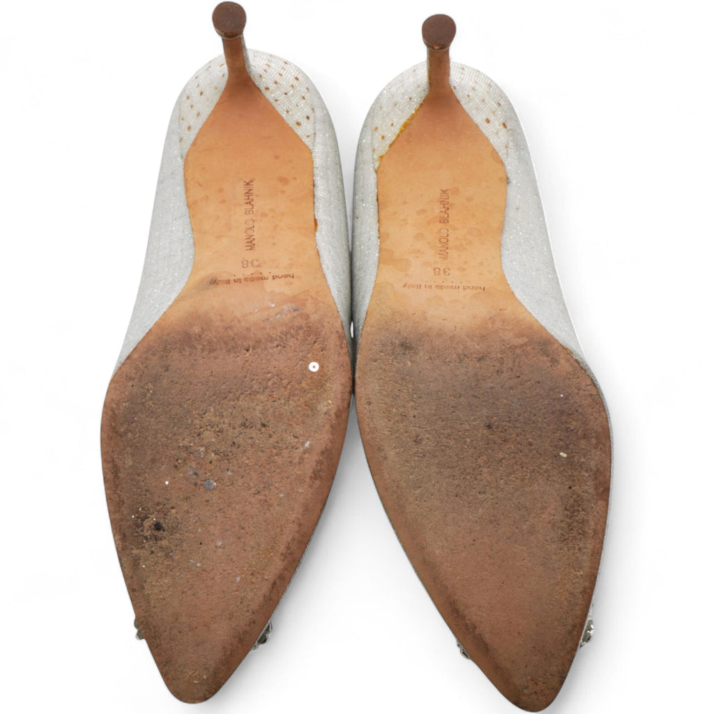 | Silver glitter fabric pumps from Manolo Blahnik. The Hangisi pumps have a 70mm heel, a pointed toe and a clear jewel buckle at the toe and cream leather lining. |