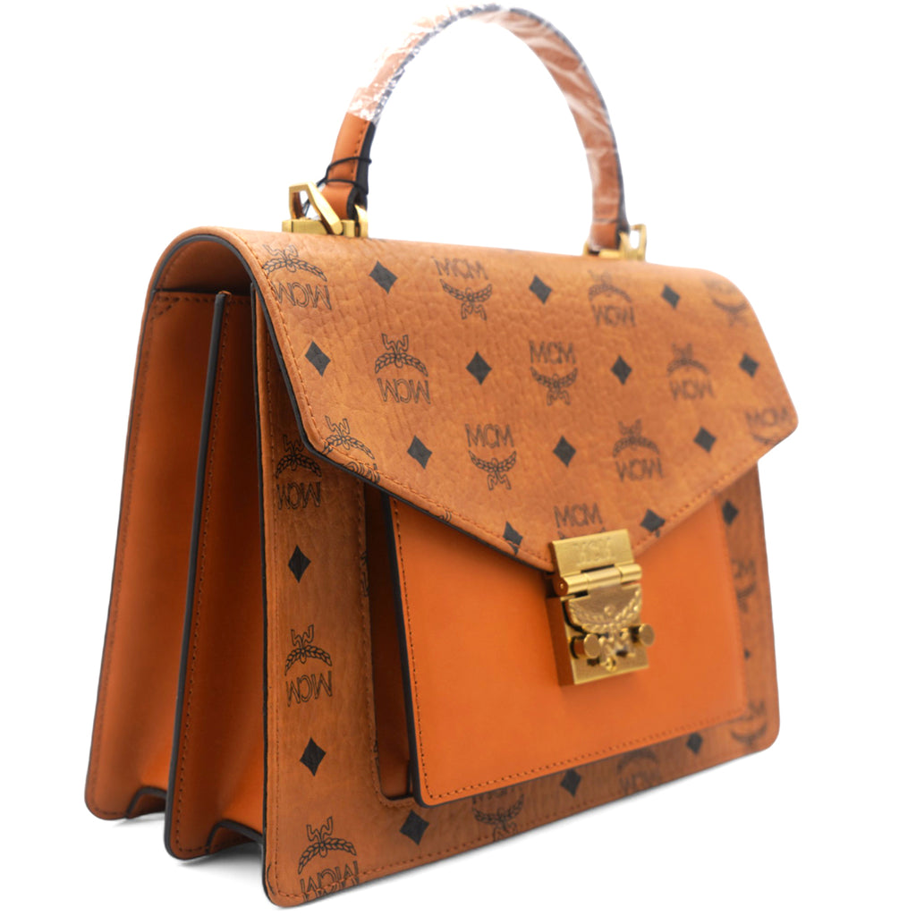 | This is an authentic MCM Visetos Medium Patricia Satchel in Cognac. This chic handbag is finely crafted of visetos print coated canvas and leather trim in brown. The shoulder bag features a leather handle, an optional adjustable leather shoulder strap, a rear exterior zipper pocket and a V-shaped front flap with a polished brass press lock. The flap opens to a partitioned orange microfiber interior with a zipper and patch pocket. This is the perfect messenger bag for everyday essentials with style and luxury, from MCM! |