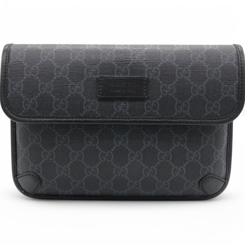 | This chic belt bag is finely crafted of black Gucci GG monogram coated canvas. The bag features an adjustable red and blue web striped canvas strap with silver hardware. The crossover flap opens to a compact black fabric interior. |
