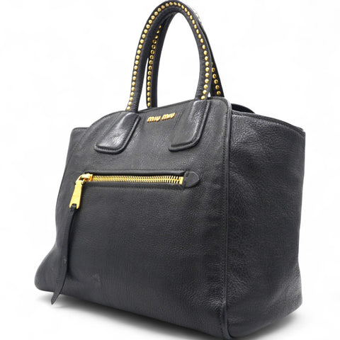 | Timeless yet immediately distinctive, this Miu Miu tote will be a reliable accessory. It comes made from leather, and it is eye-catching with studded dual handles at the top. To enhance its practical utility, it is added with a shoulder strap, exterior zipper pockets on both sides, and a spacious interior. |