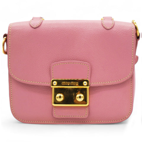 | This chic bag is crafted of luxurious goatskin leather in pink and features an adjustable shoulder strap. The bag has a front half flap with a brass press lock that opens to a partitioned interior with three storage compartments with zipper and patch pockets. |
