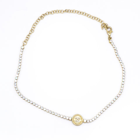 | This lovely necklace is crafted with faux crystals and a crystal gold Chanel CC pendant. |