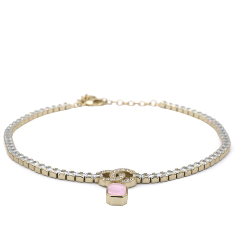 | This elegant and stylish choker necklace showcases a delicate silver crystal chain, adorned with sparkling, crystal-encrusted gold CC logos. Adding a touch of charm and sophistication, the design is further enhanced with beautiful pink crystal pendants, creating a perfect blend of luxury and femininity. |