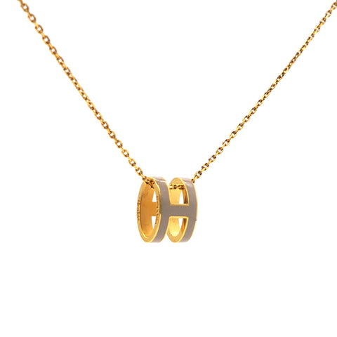 | This is an authentic HERMES Lacquered Gold Pop H Pendant Necklace in Grey. This is a simple and very chic necklace from Hermes. It features a ring shape that is an elongated lacquered Pink “H", which hangs on a short, thin gold band. |
