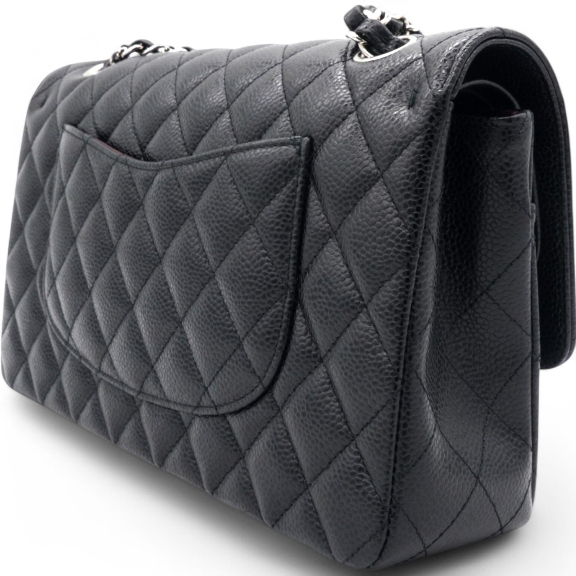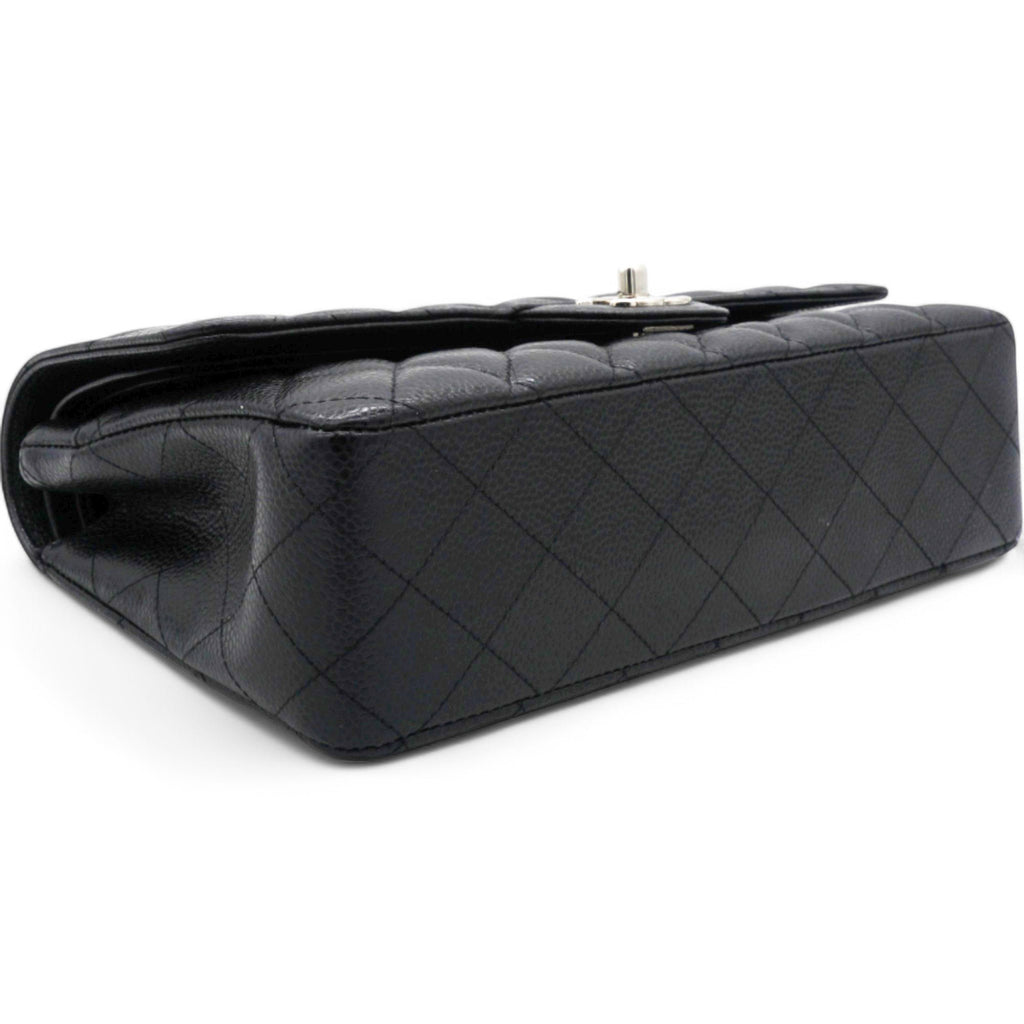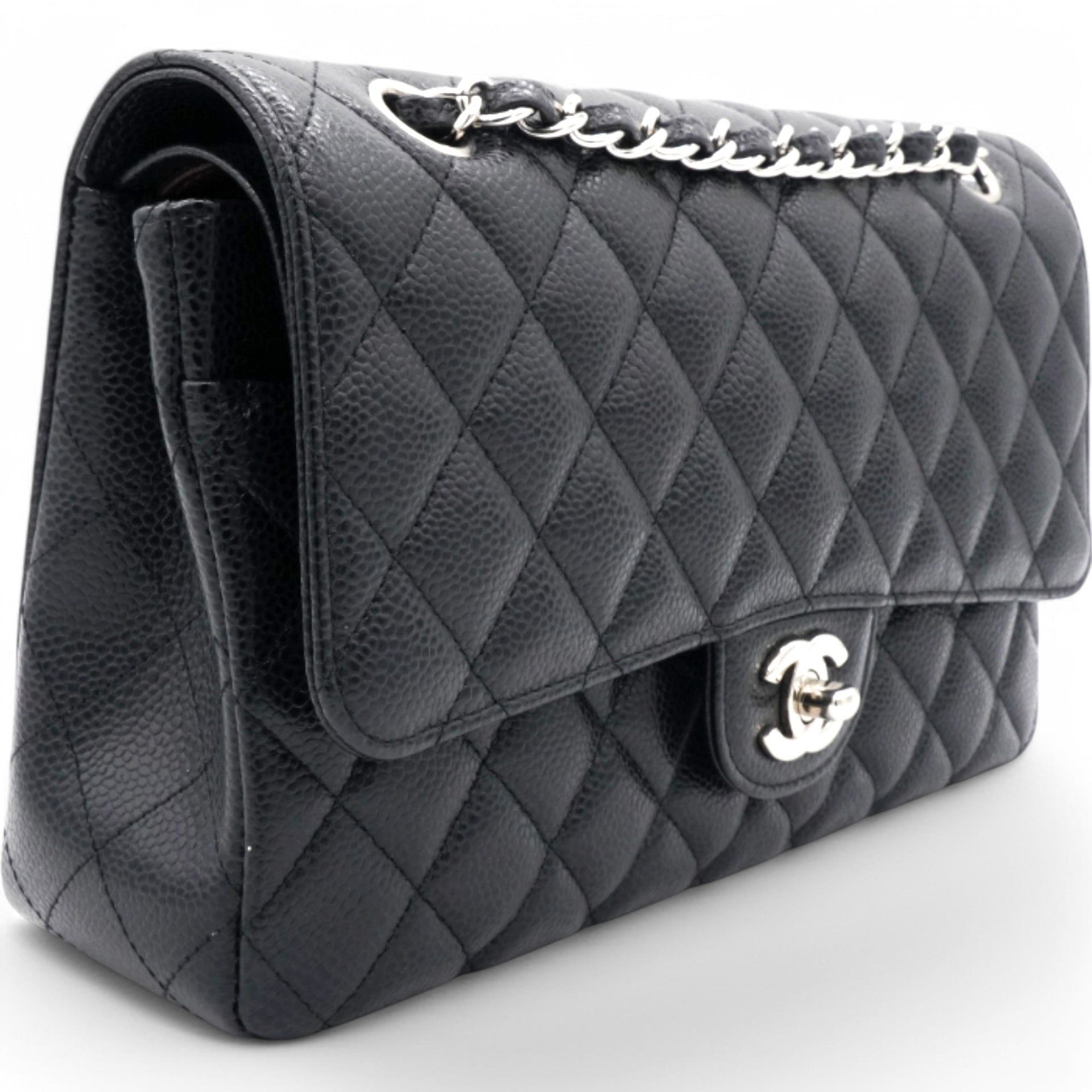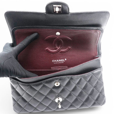 | This elegant shoulder bag is crafted of luxurious caviar textured leather in black. The bag features a leather threaded silver chain-link shoulder strap, a rear patch pocket, and a crossover flap with a silver classic CC turn lock. The flap opens to reveal an inner flap and a red leather interior with patch pockets |