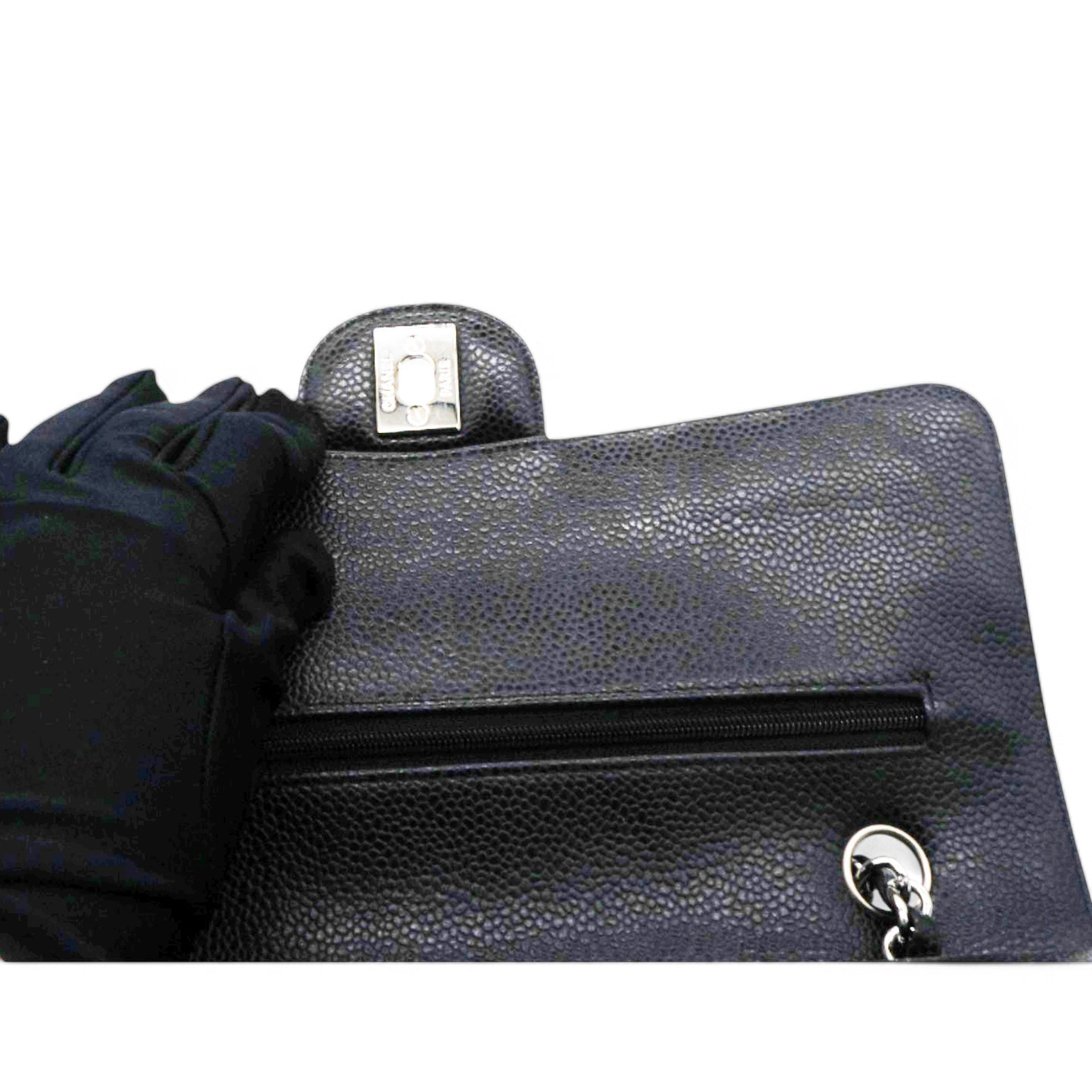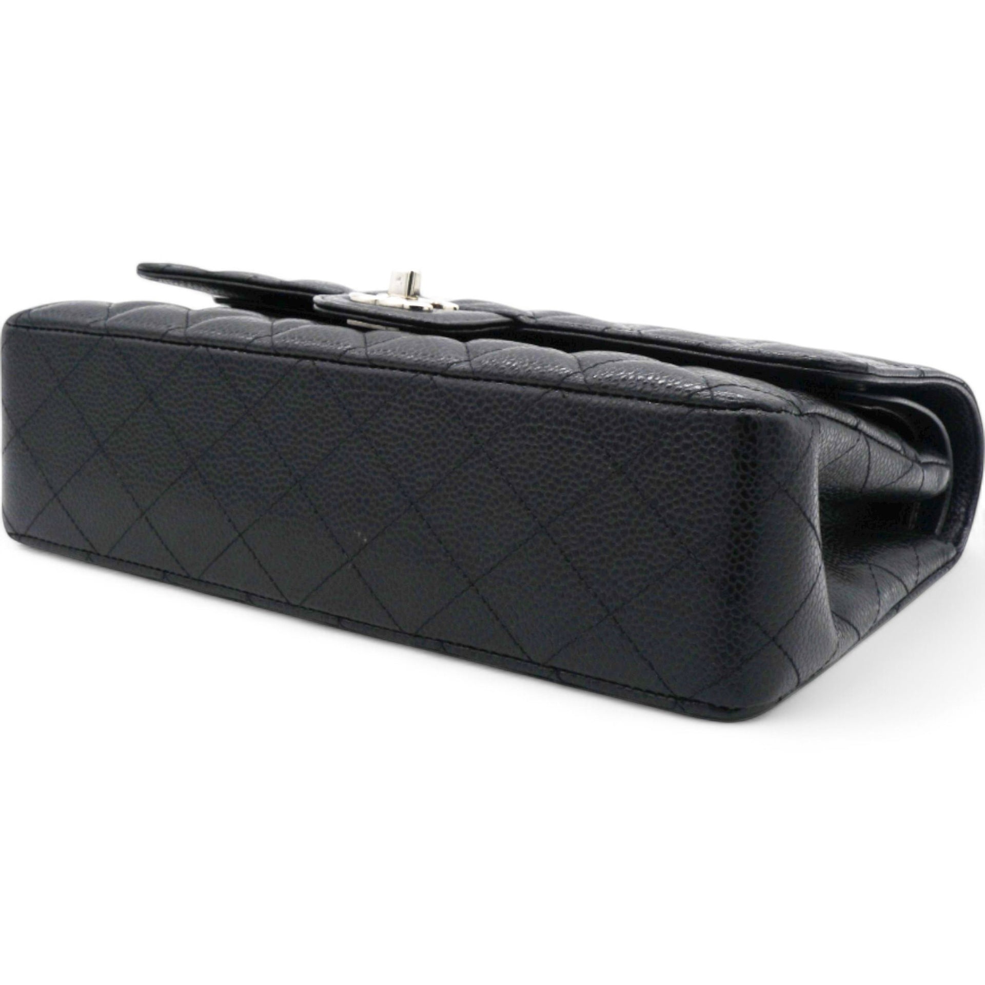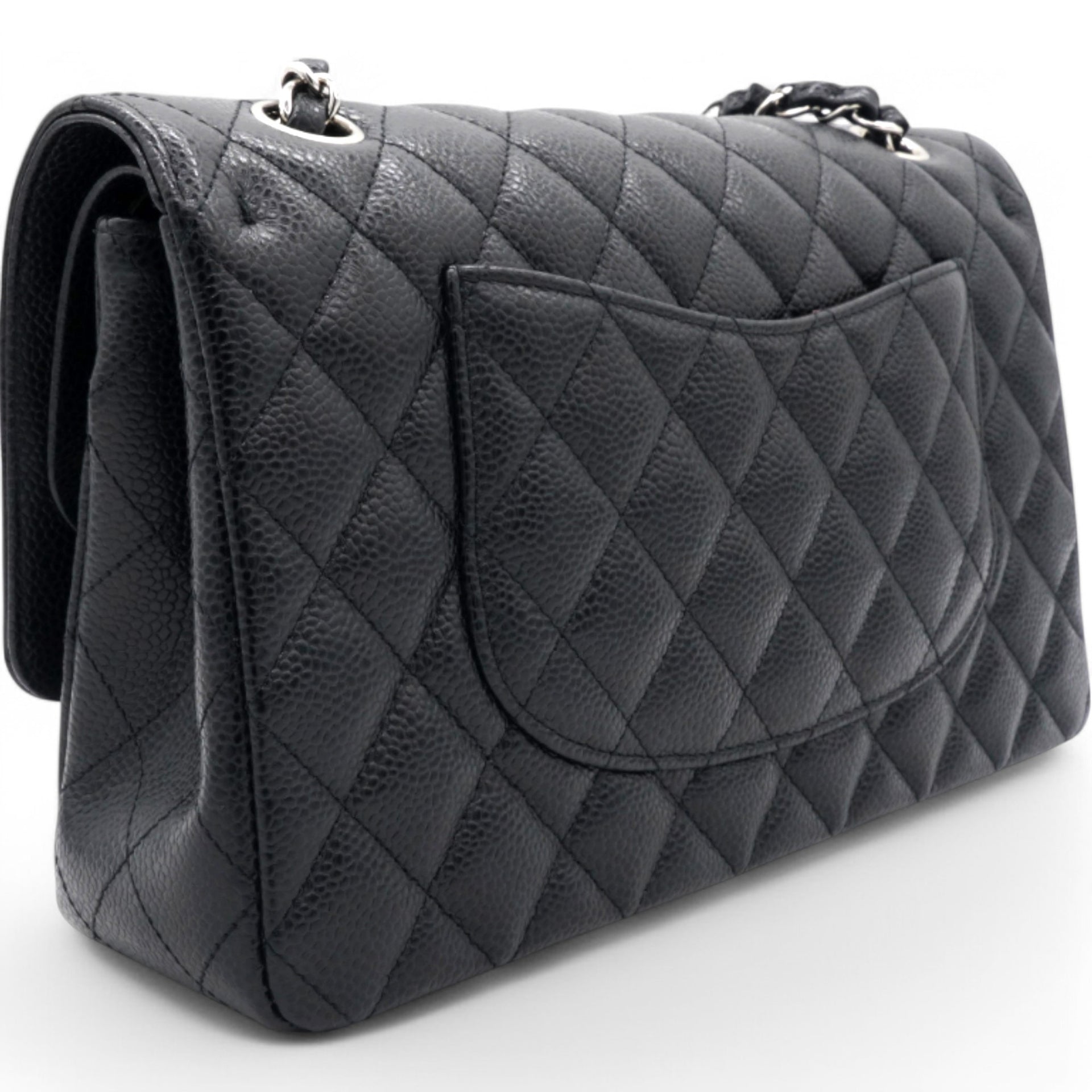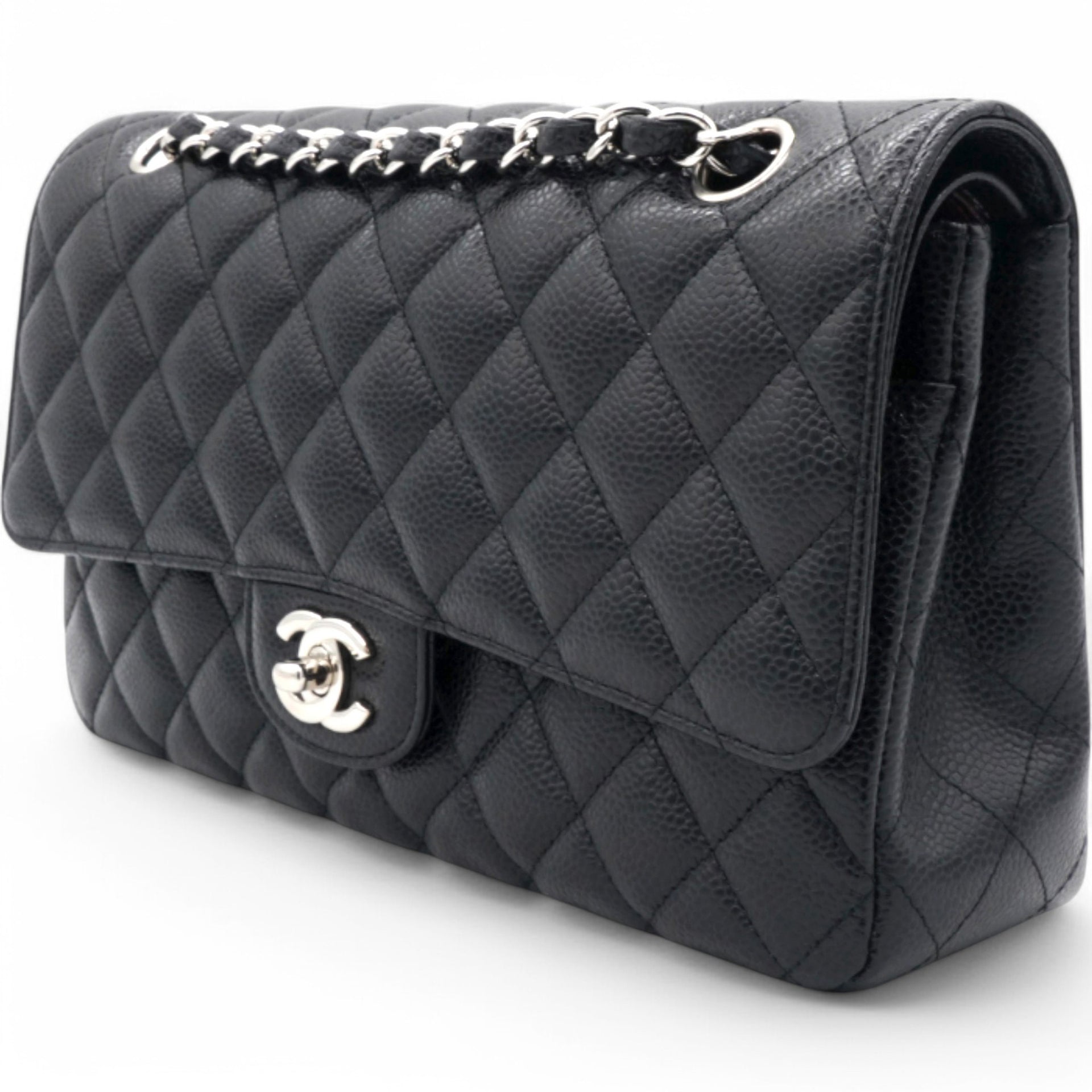 | This elegant shoulder bag is crafted of luxurious caviar textured leather in black. The bag features a leather threaded silver chain-link shoulder strap, a rear patch pocket, and a crossover flap with a silver classic CC turn lock. The flap opens to reveal an inner flap and a red leather interior with patch pockets |