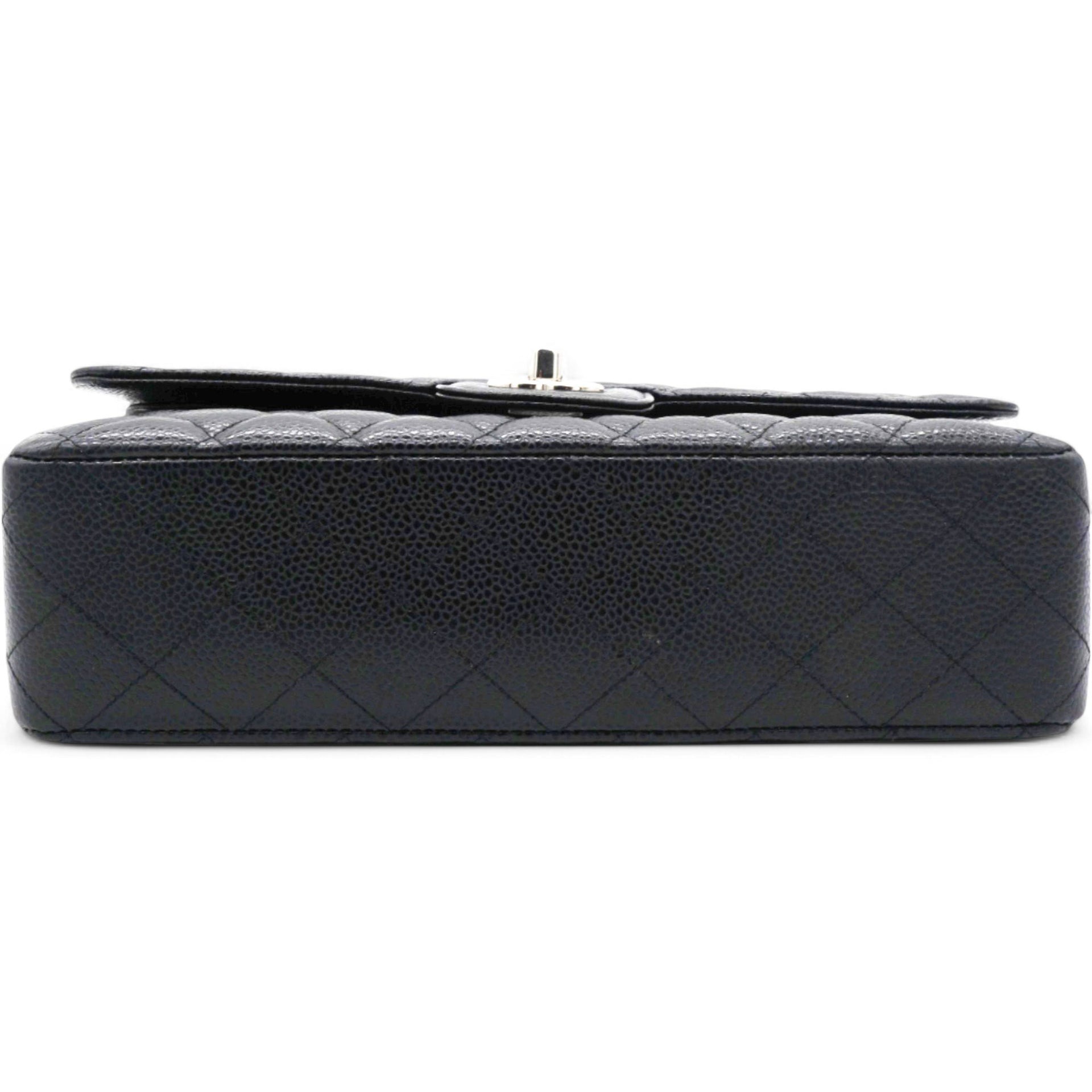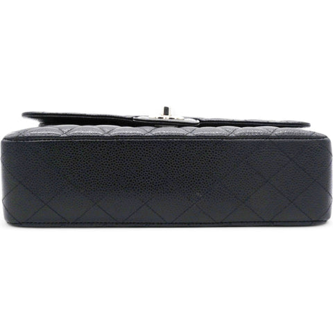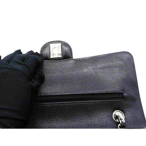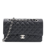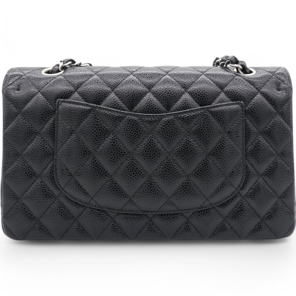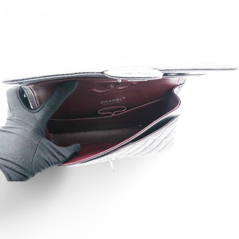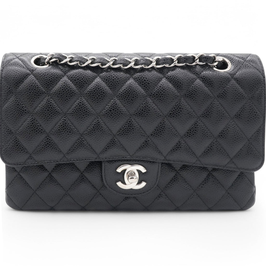 | This elegant shoulder bag is crafted of luxurious caviar textured leather in black. The bag features a leather threaded silver chain-link shoulder strap, a rear patch pocket, and a crossover flap with a silver classic CC turn lock. The flap opens to reveal an inner flap and a red leather interior with patch pockets |