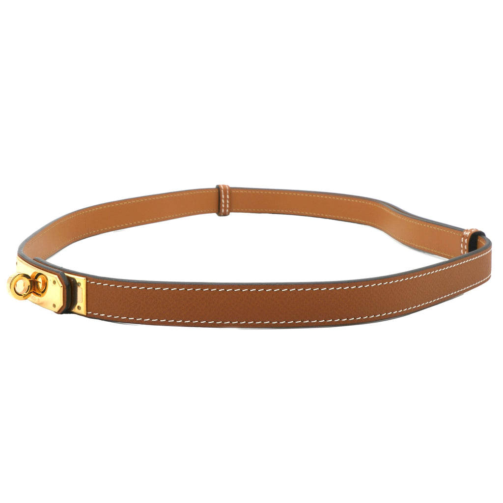 | This stylish belt is crafted of Epsom calfskin leather in golden brown. This belt features a polished gold plated Kelly turn lock plate and a discreet sliding system that allows the belt to be worn low at the hips or on the waist. |