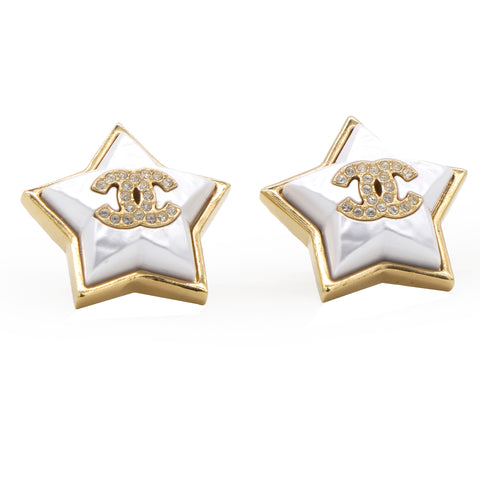 | This is an authentic pair of CHANEL Pearl Crystal CC Star Earrings in Gold. These elegant earrings feature a polished gold Chanel CC logo encrusted with small crystals and faux pearls on each earring. |