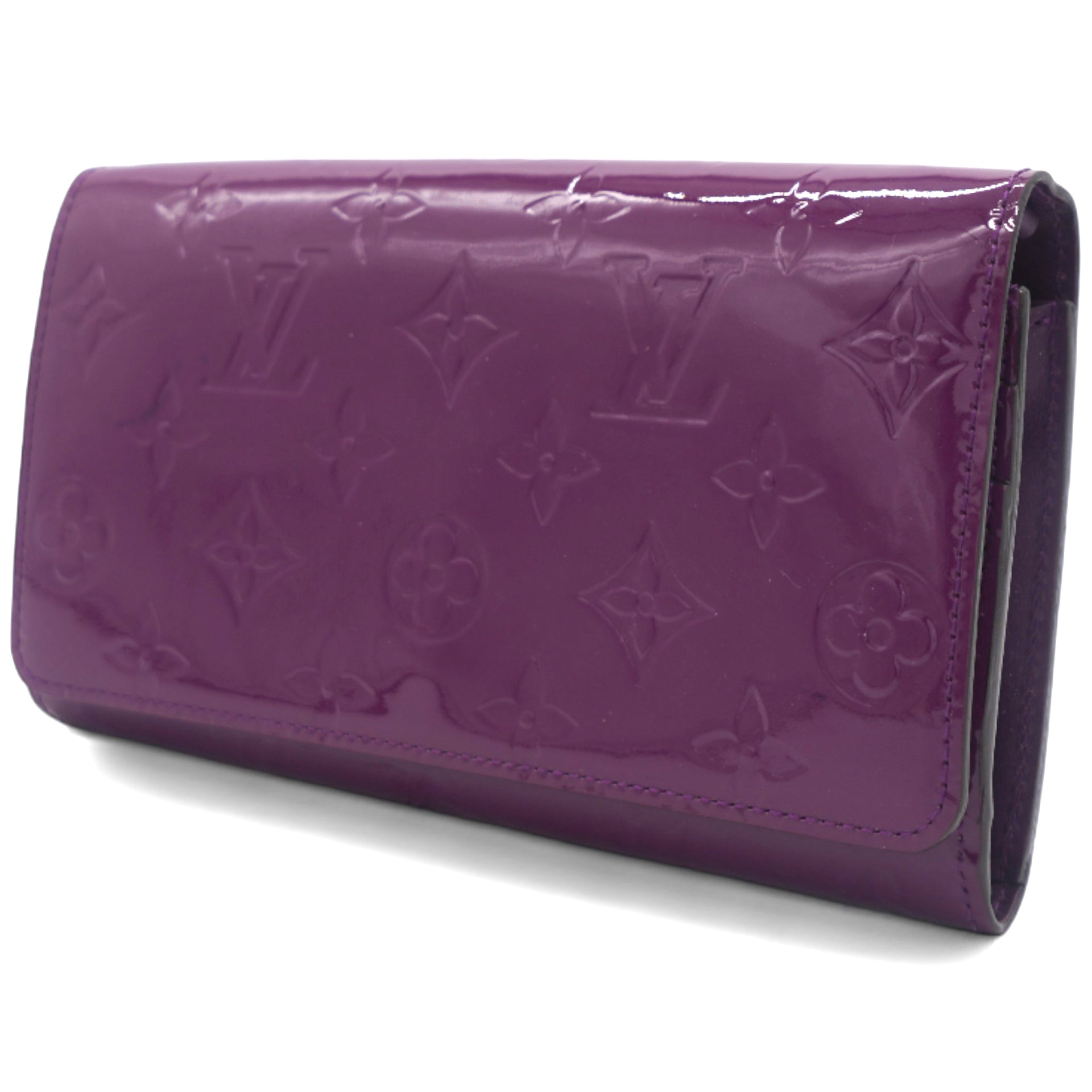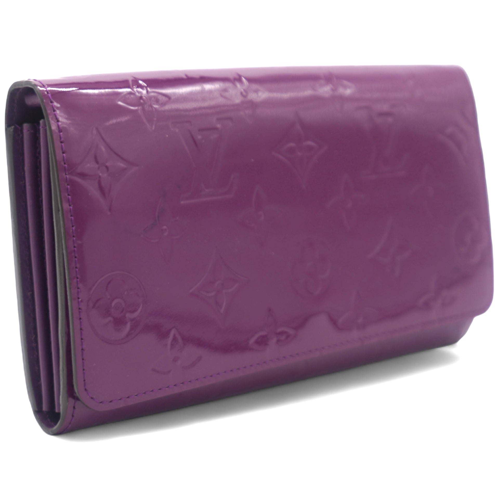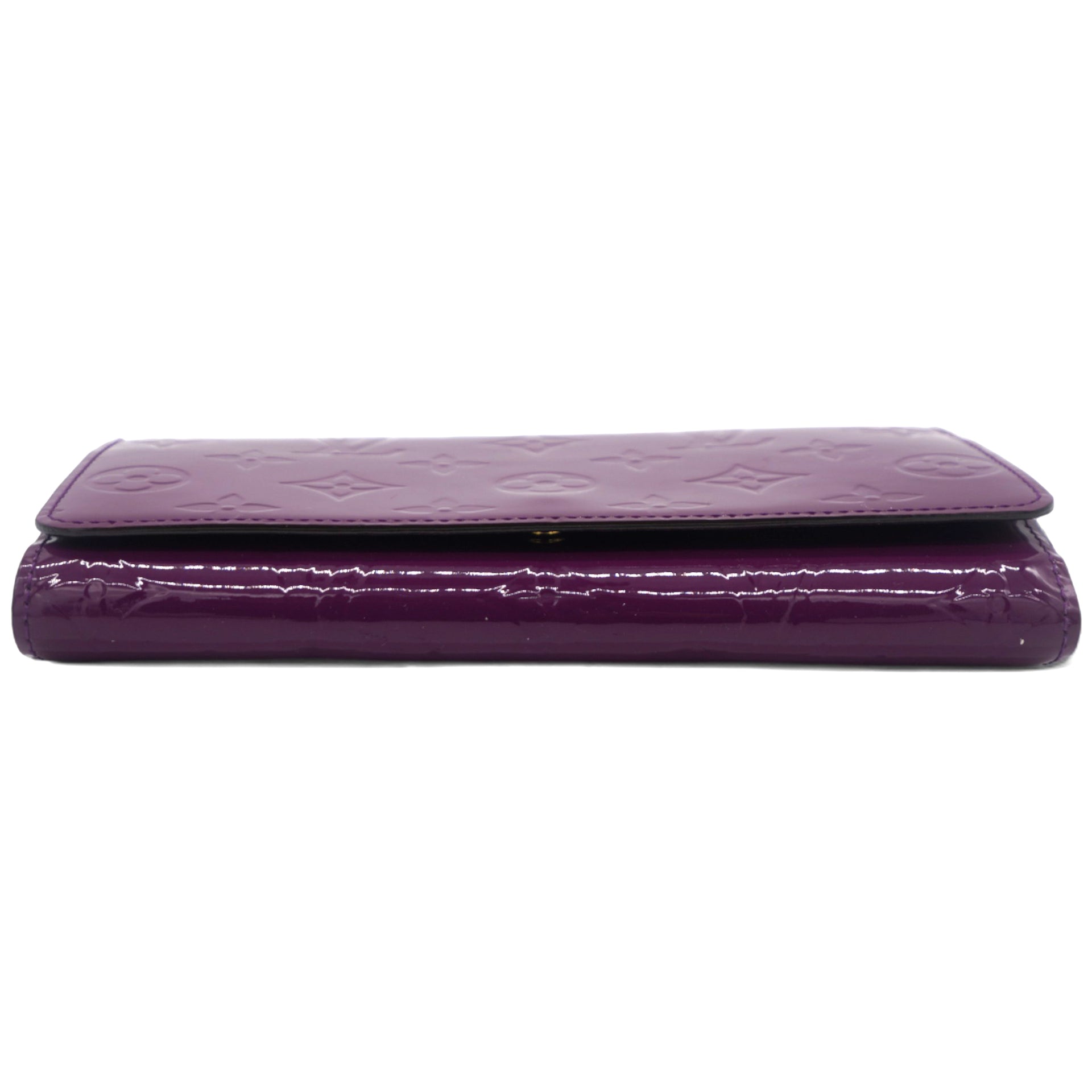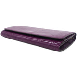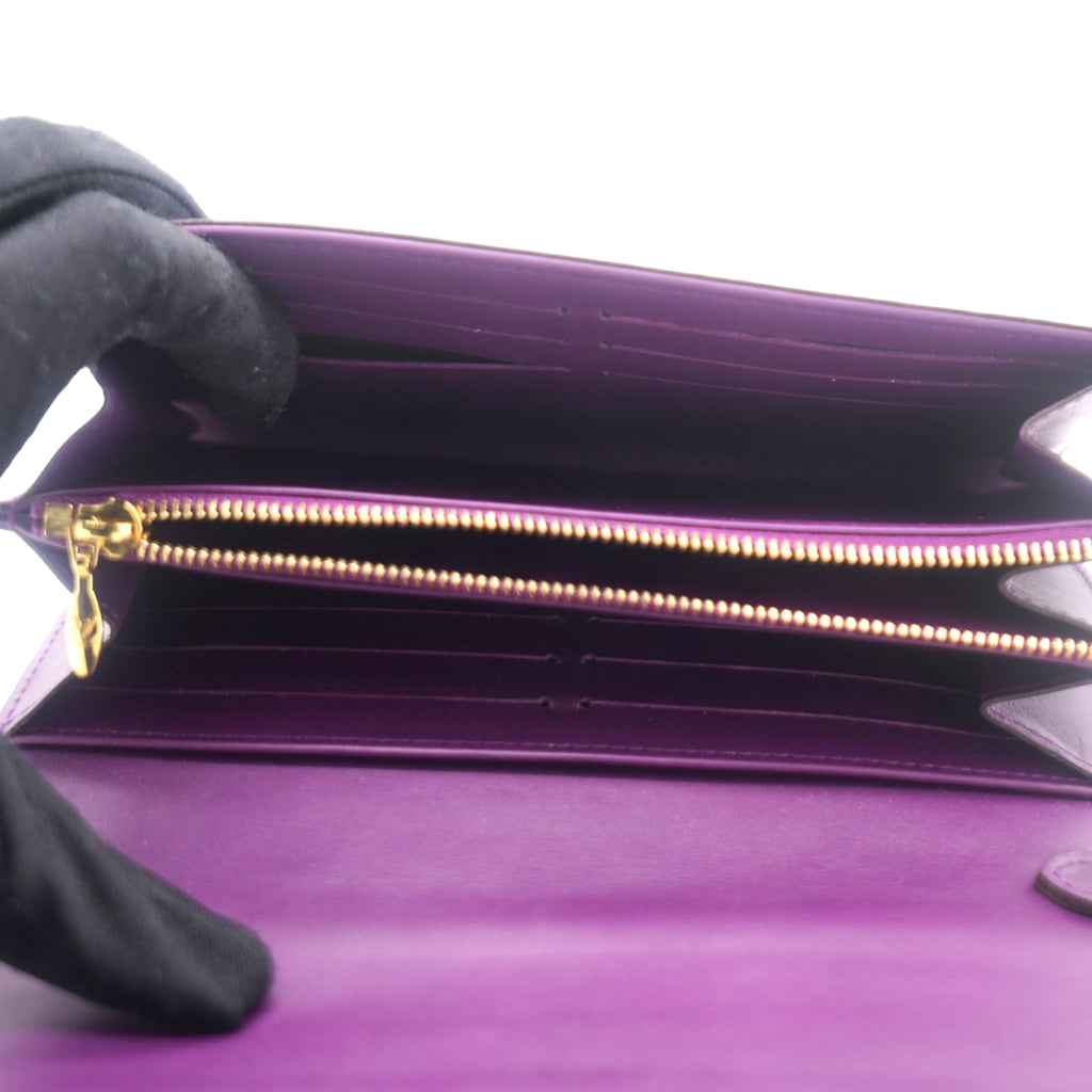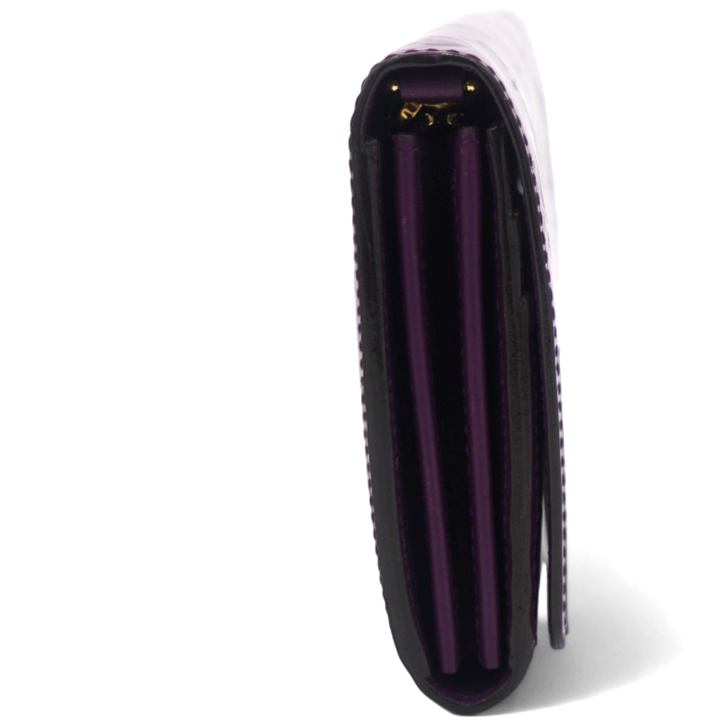 | The amethyst colour goes perfectly the gold tone hardware. Crafted from calfskin leather it has a snap lock closure. It has two bill slots, sixteen card slots and an open pocket, and coin purse. |