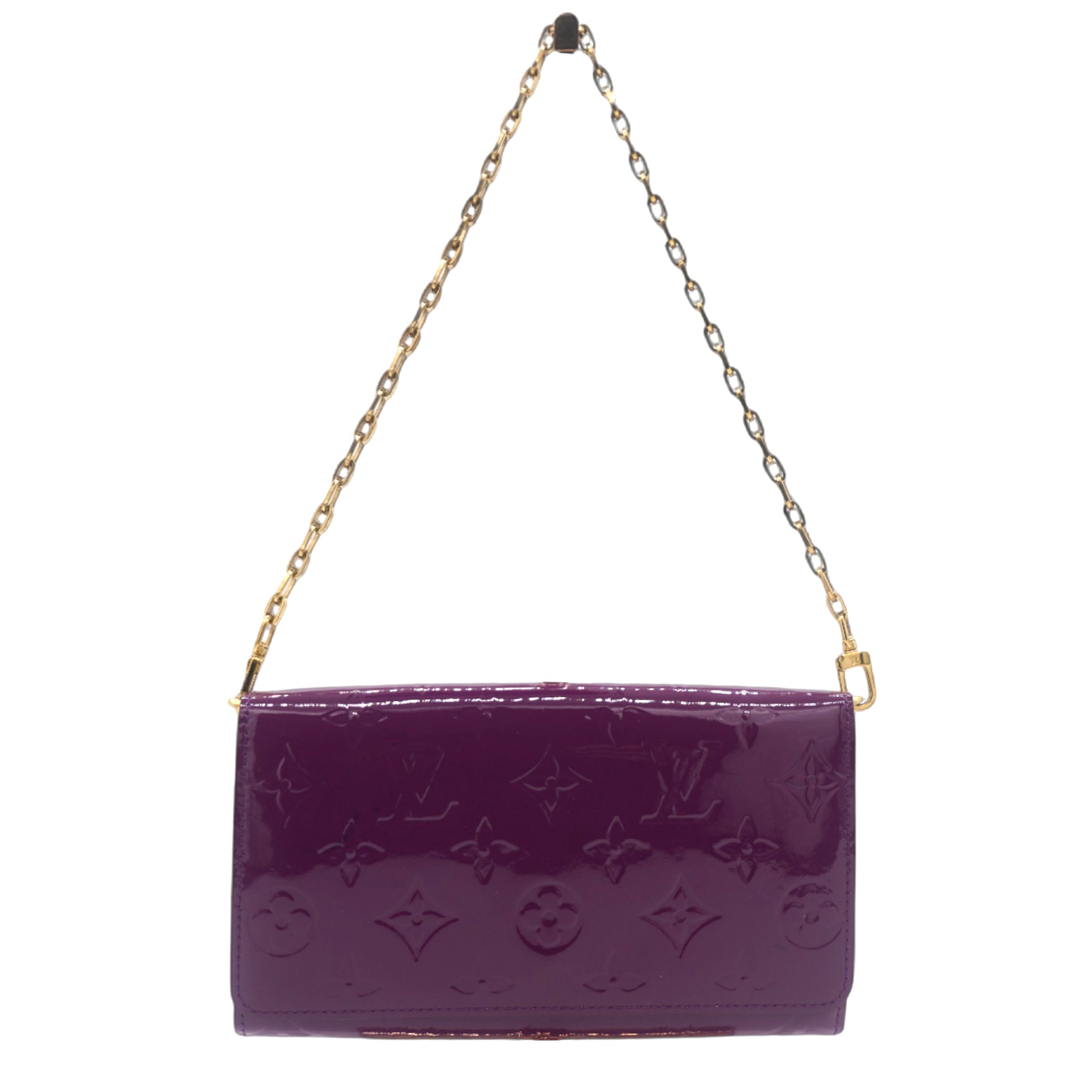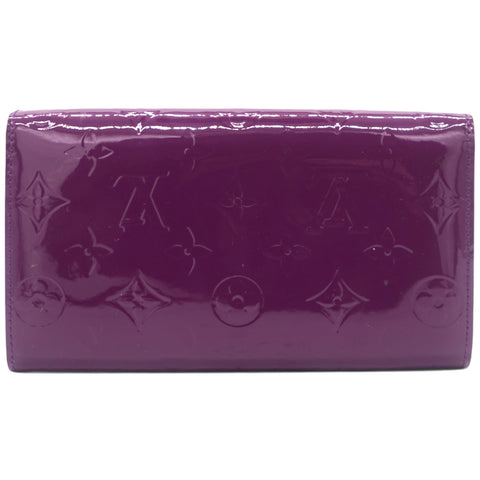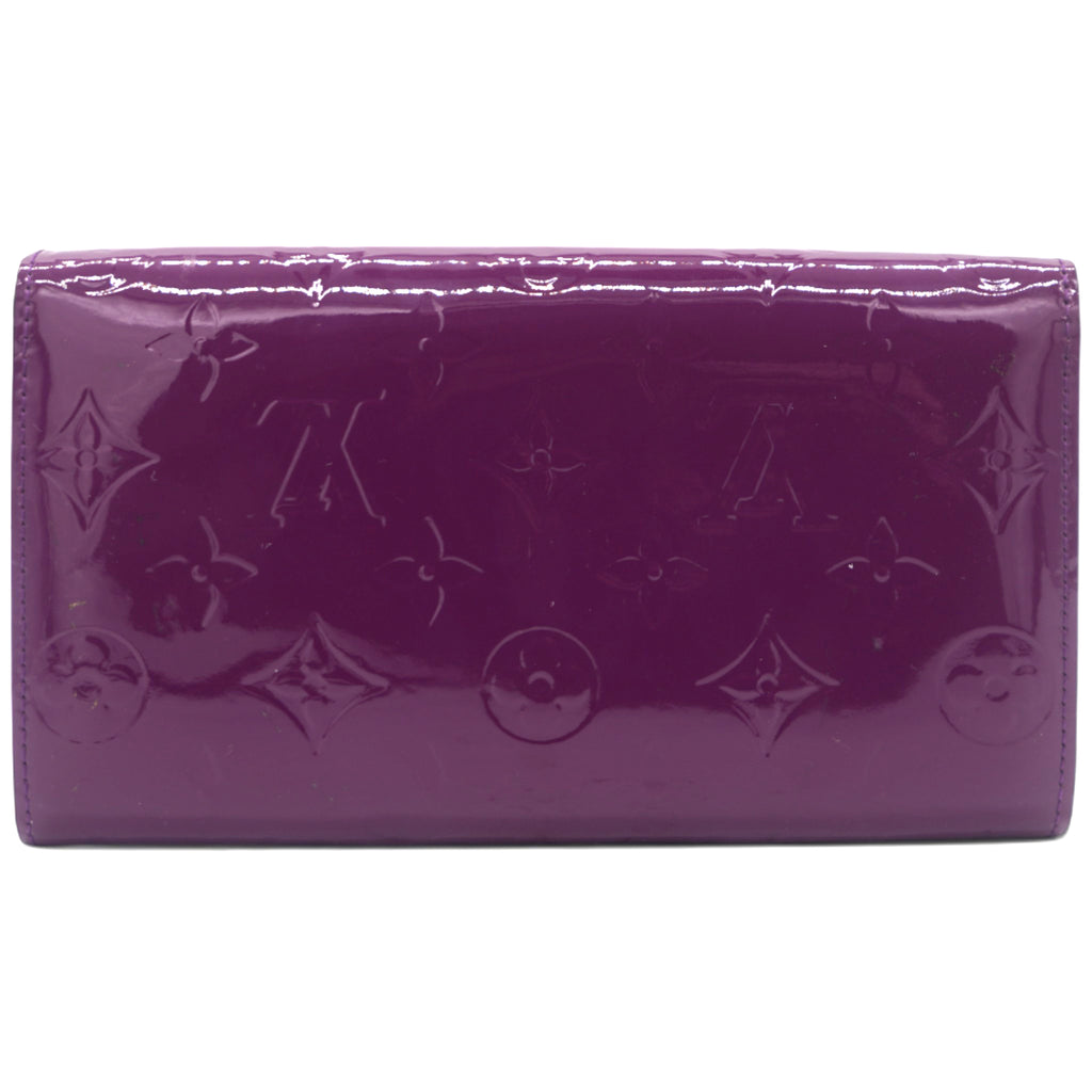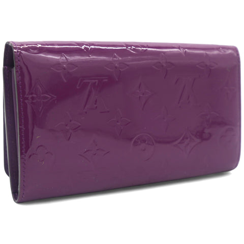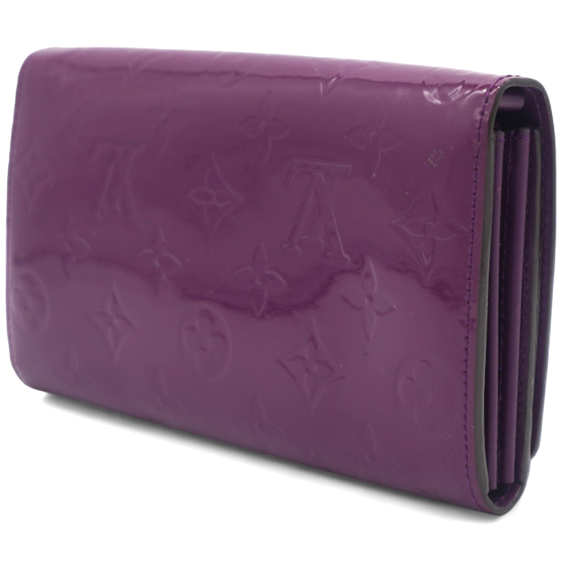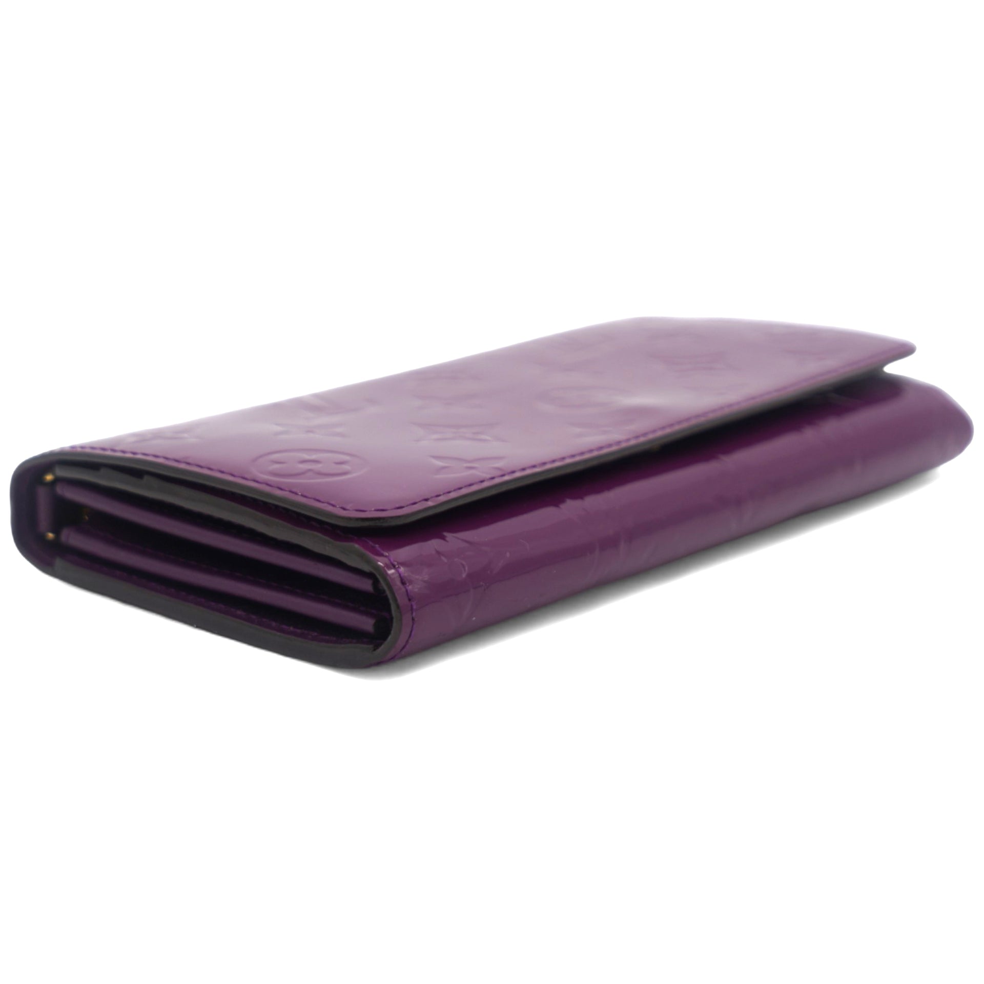 | The amethyst colour goes perfectly the gold tone hardware. Crafted from calfskin leather it has a snap lock closure. It has two bill slots, sixteen card slots and an open pocket, and coin purse. |