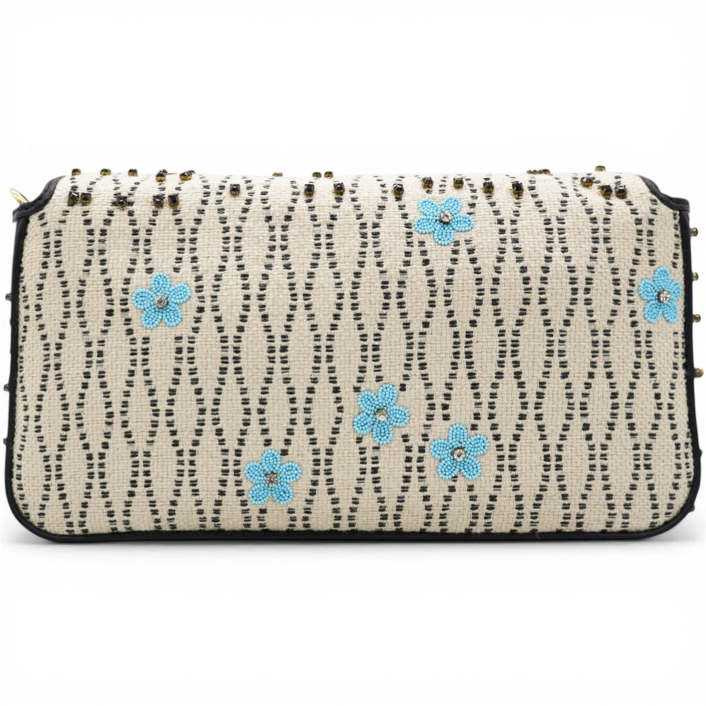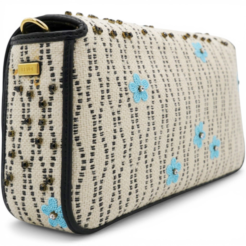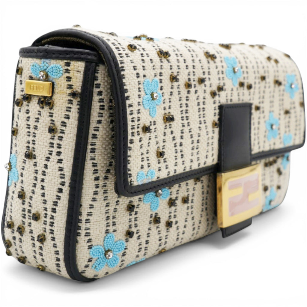 Iconic Baguette bag with flap and FF fastening with magnetic clasp. Lining with zip pocket. Can be carried by hand or worn cross-body thanks to the detachable shoulder strap. Made of white raffia. Finished with floral print and bead embroidery on the front. Leather details in shades of black. Fabric lining with jacquard FF motif. Gold-finish metalware.