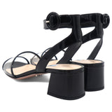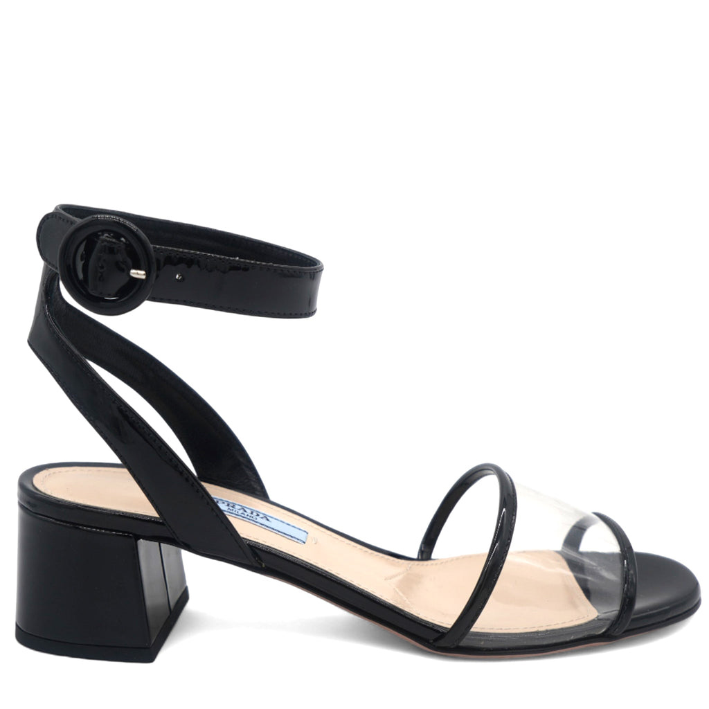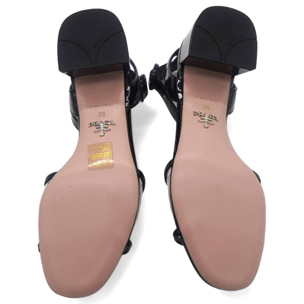| You'll love wearing these Prada sandals. The black sandals are crafted from patent leather and PVC into an open-toe silhouette. They are secured with buckled ankle straps and elevated on low block heels. |