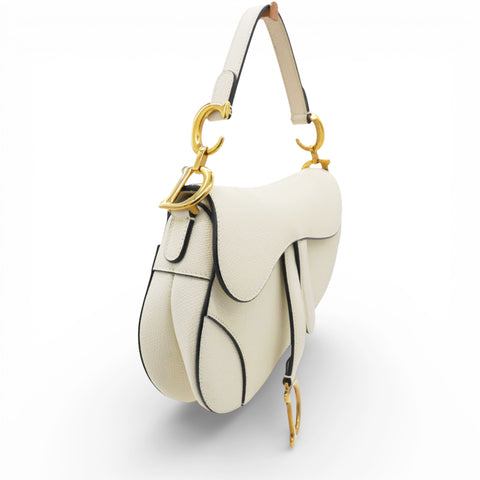 | This bag features the saddle bag shape, short leather shoulder strap with a "C" and "D" anchors on either end of the handle for a handle, and a prominent hanging Dior "D" charm. The interior of the bag is a beige microfiber textile. |