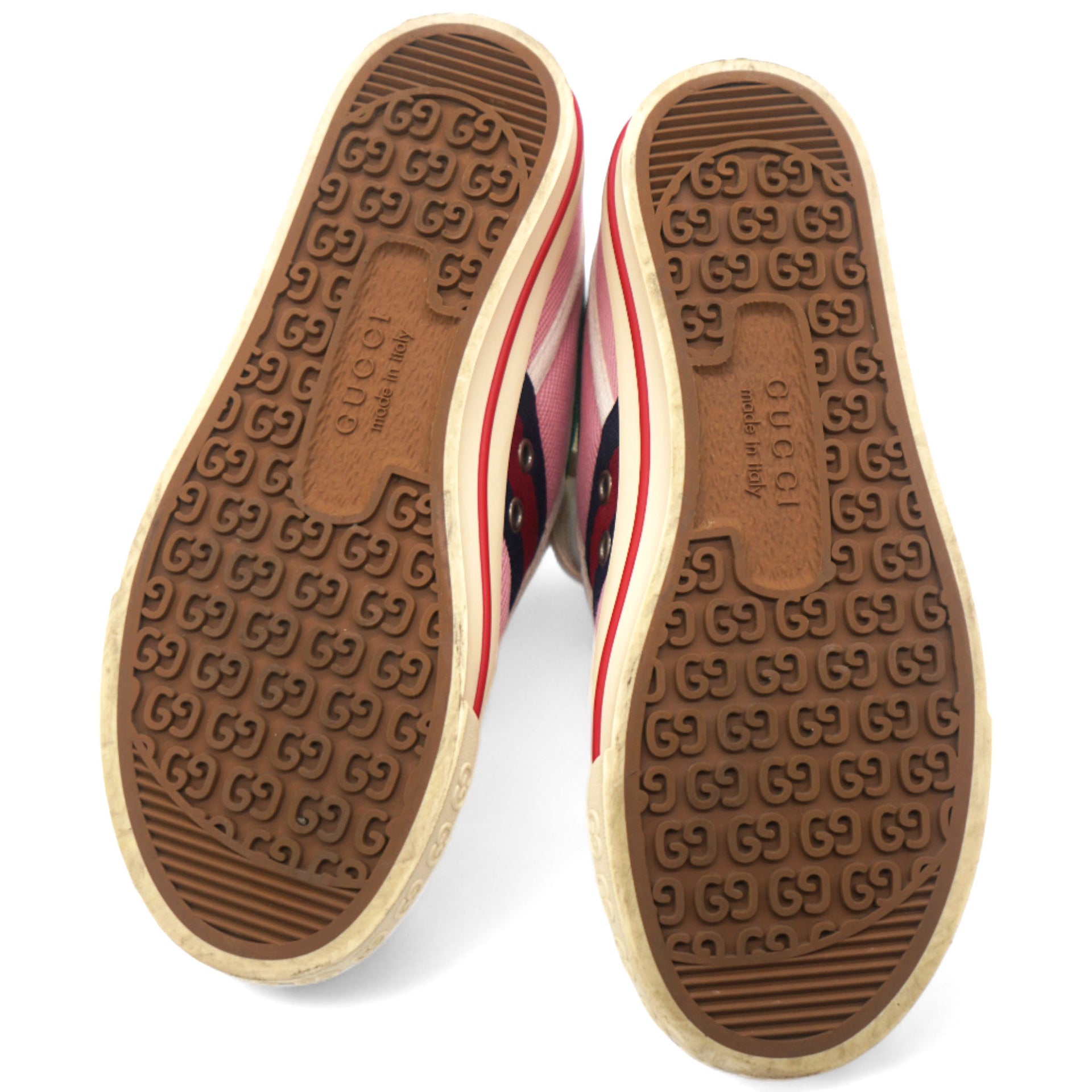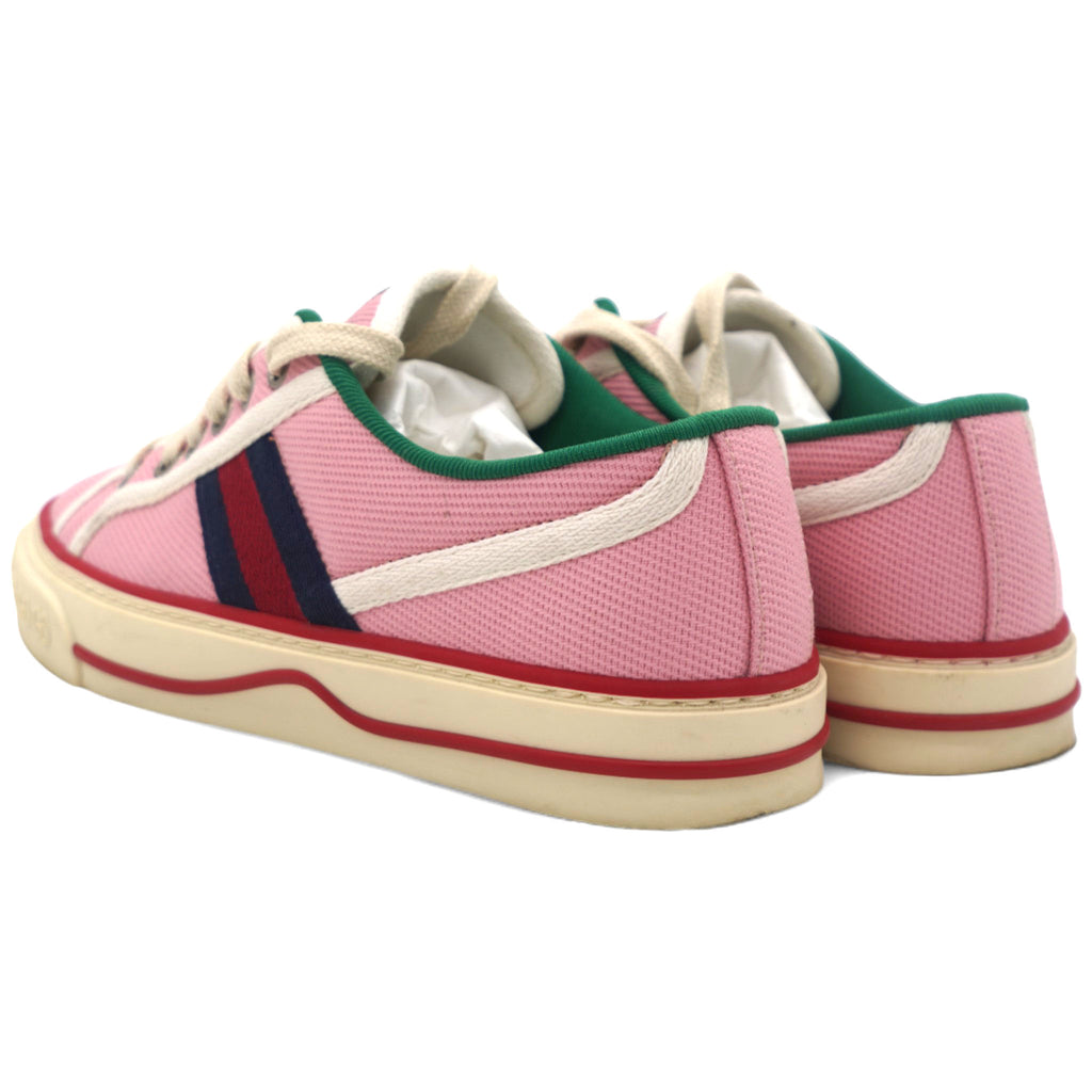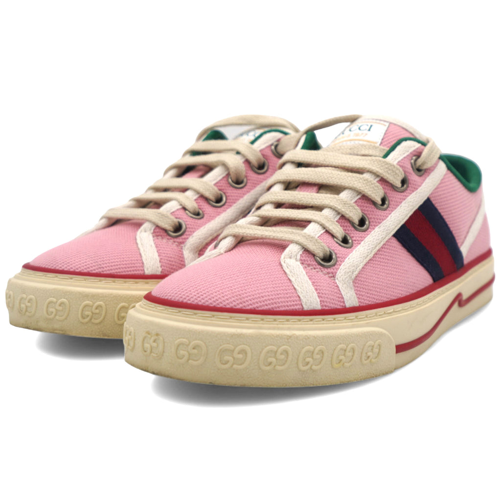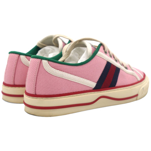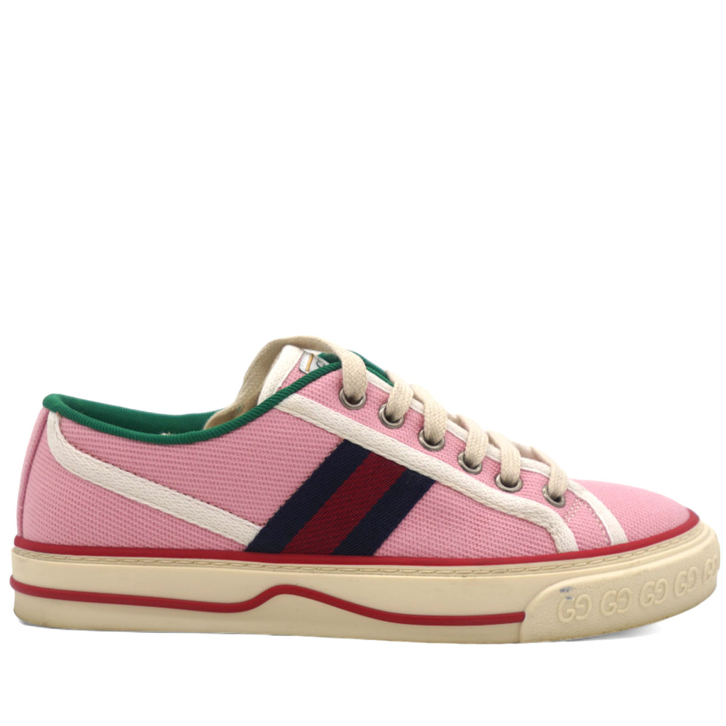 | This is an authentic pair of GUCCI Canvas Web Womens 1977 Tennis Sneakers in Wild Rose and Mystic White. These stylish sneakers are crafted of pink canvas with red trim, and red and navy blue stripes accented on the sides. |