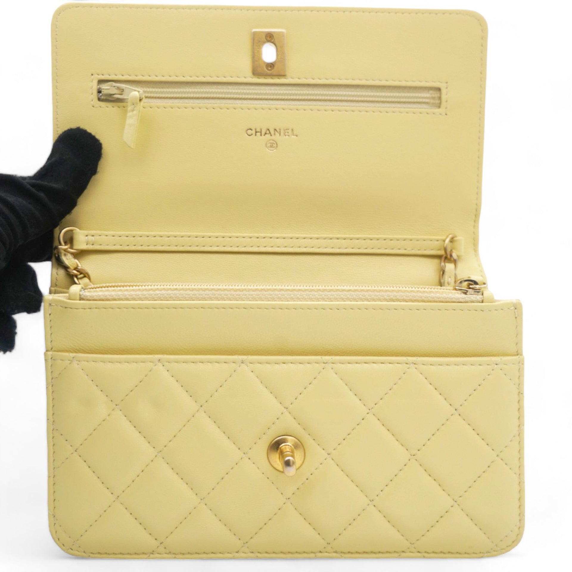 | This chic chain wallet is beautifully crafted of diamond-quilted caviar leather in yellow The bag features a leather-threaded polished light gold chain-link shoulder strap and a crossover flap with a matching light gold Chanel CC logo. The flap opens to a partitioned yellow fabric interior with card slots, zipper, and patch pockets. |