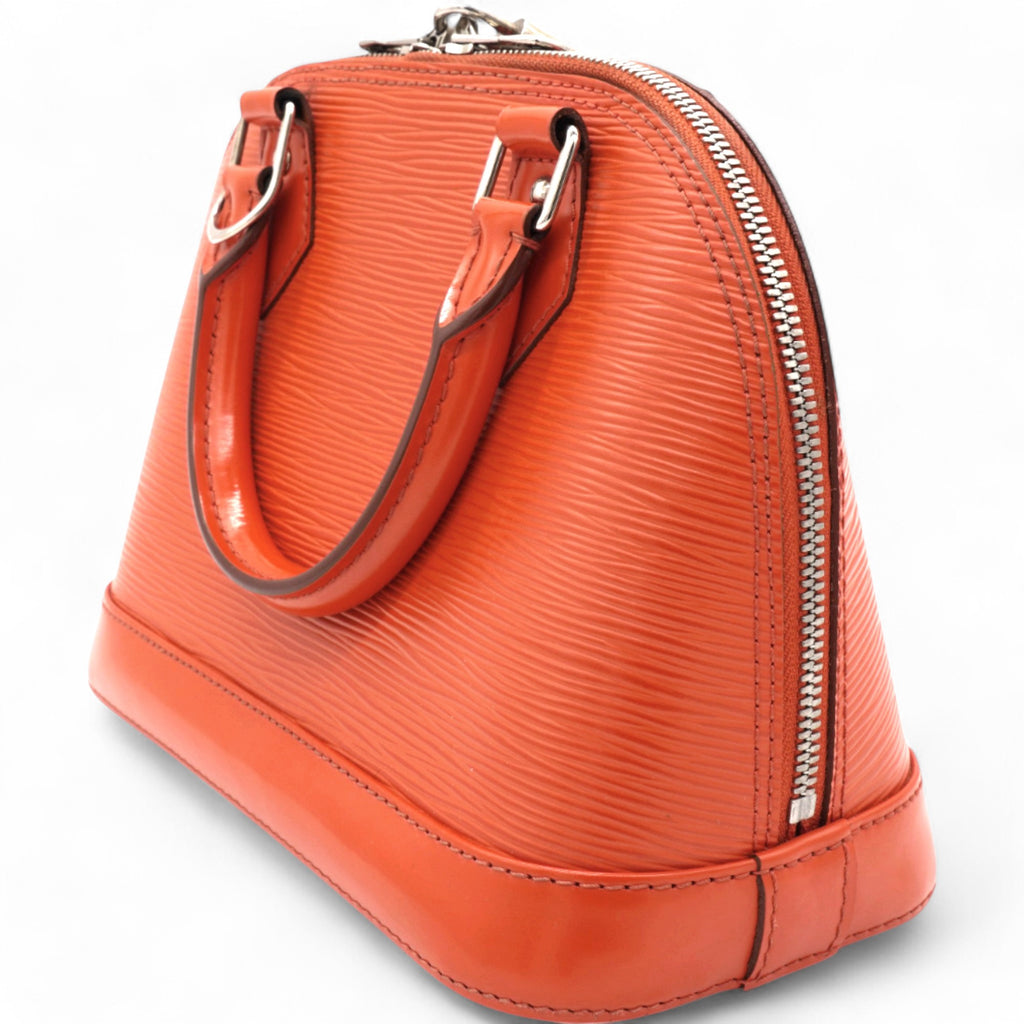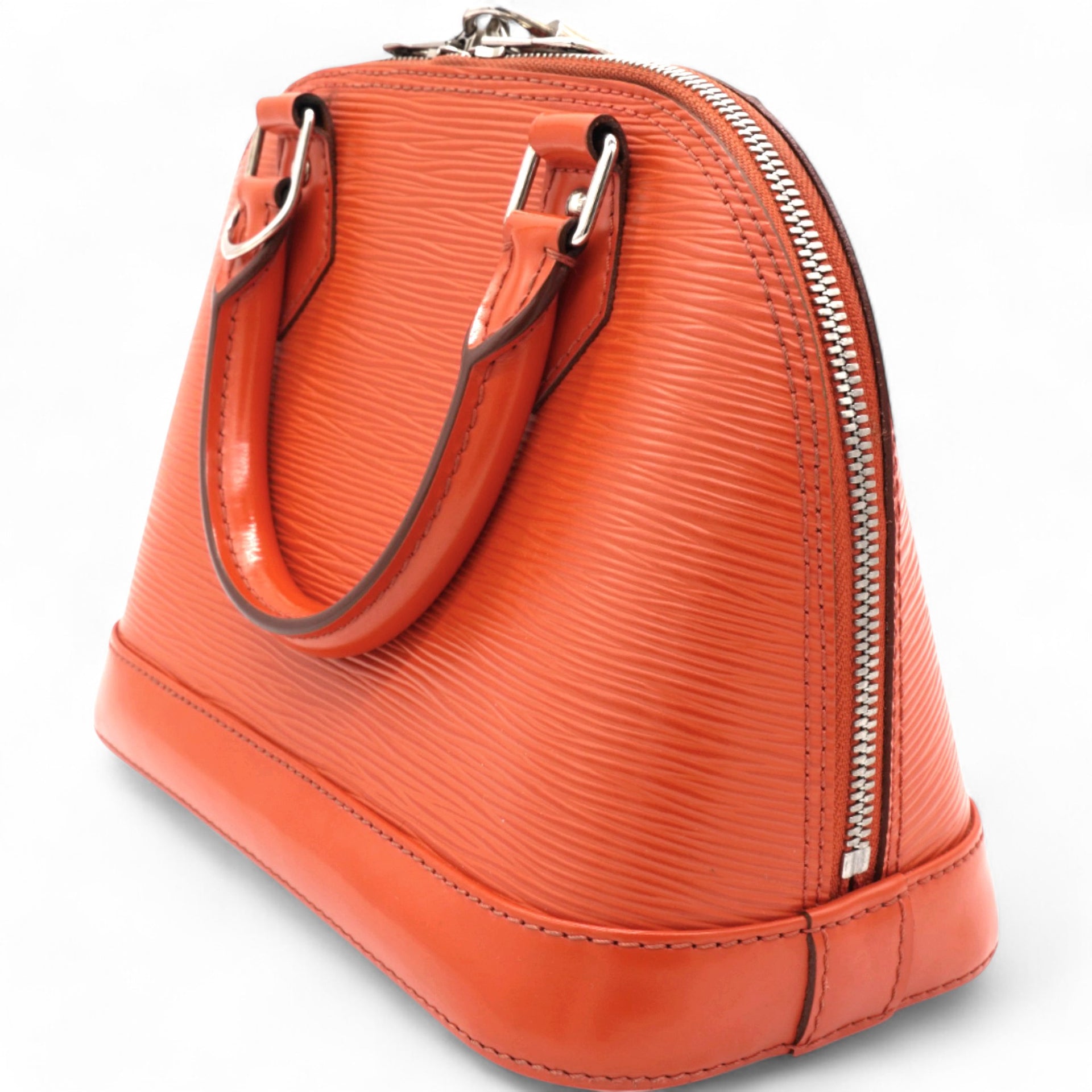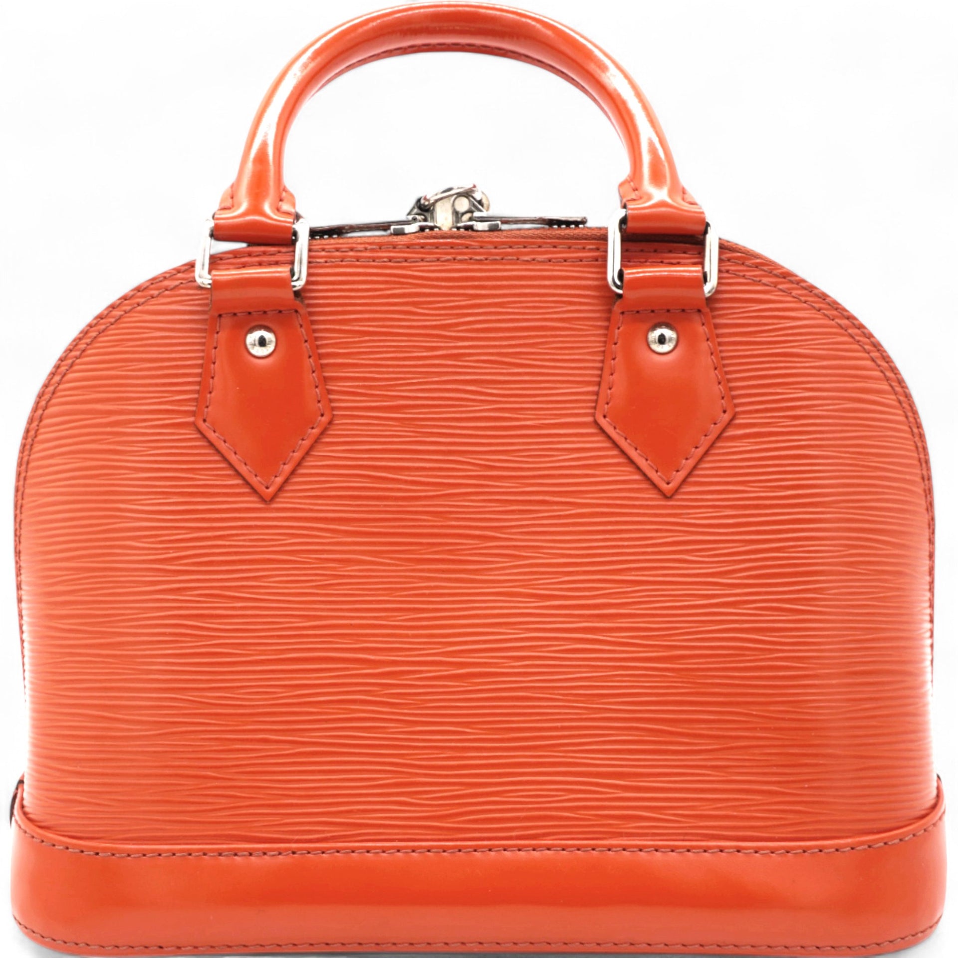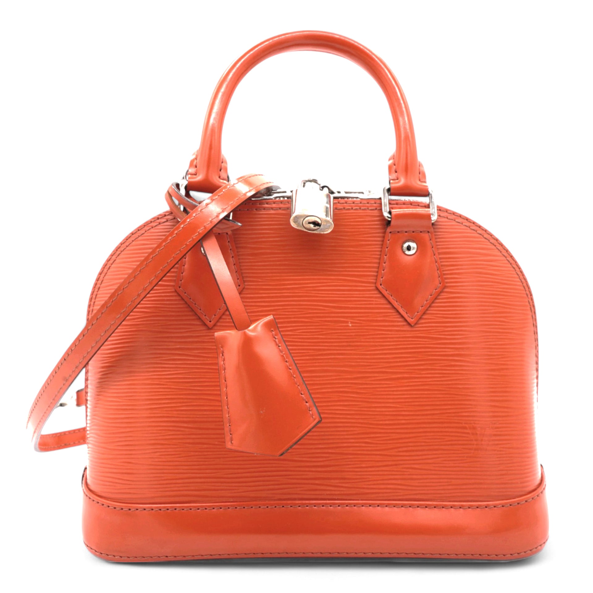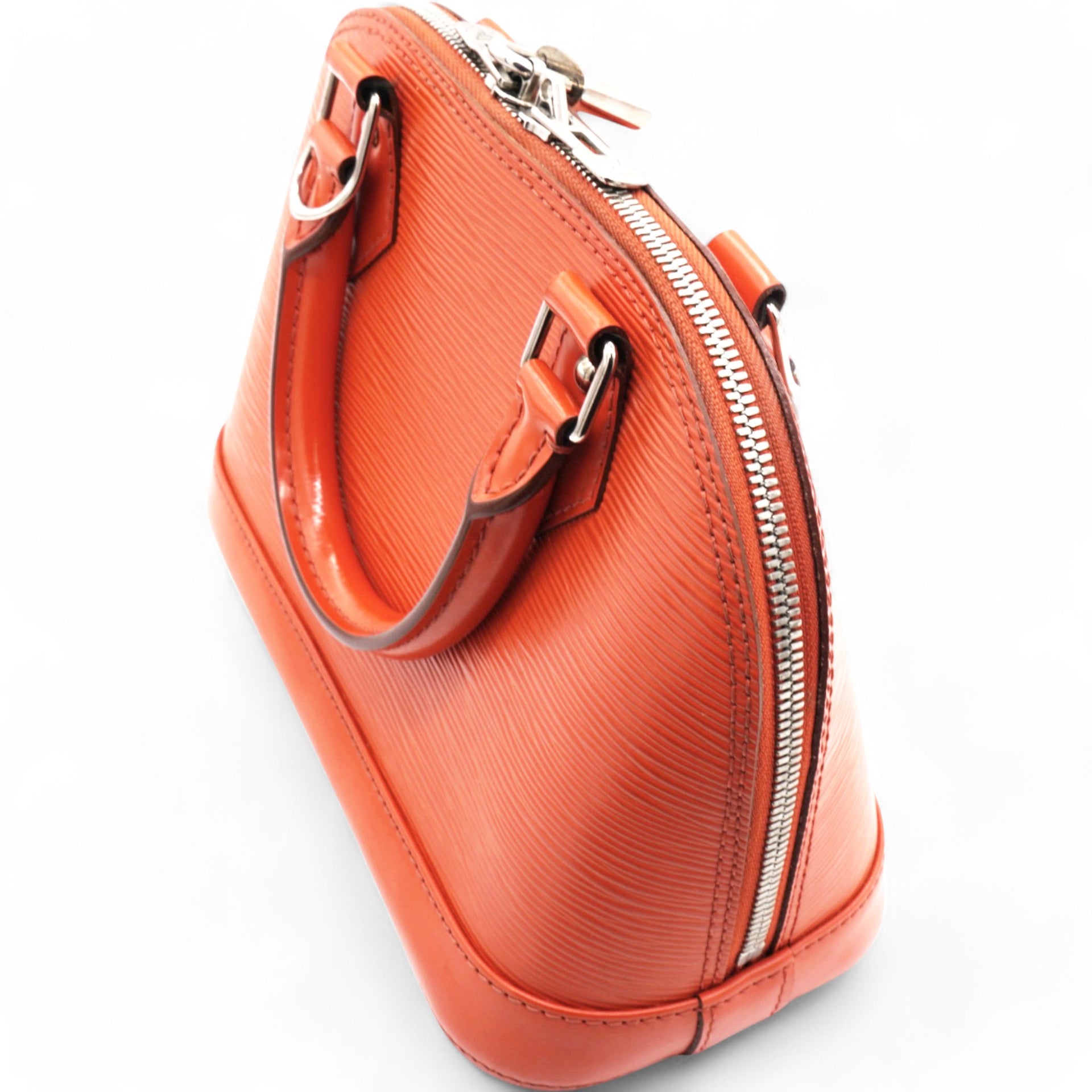 This is a chic bag created of Louis Vuitton signature textured Epi leather in orange. The handbag features cowhide rolled leather top handles and trim, polished silver-tone hardware, matching leather shoulder strap plus lock and keys. The bag opens to an orange microfiber interior with a patch pocket.