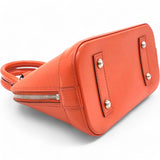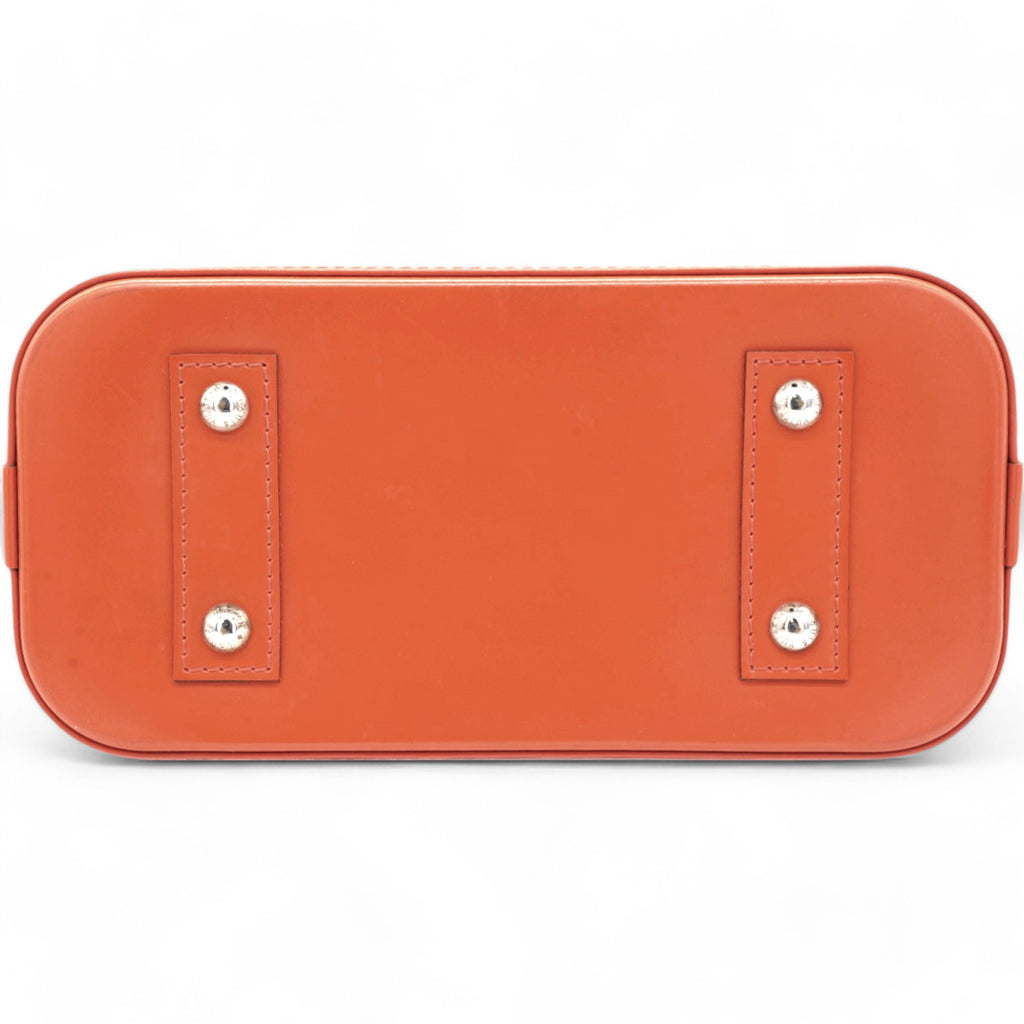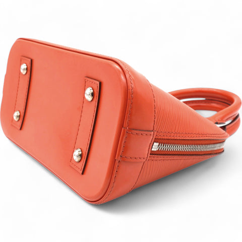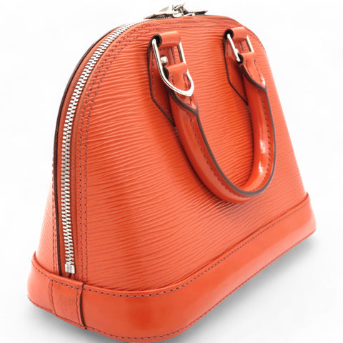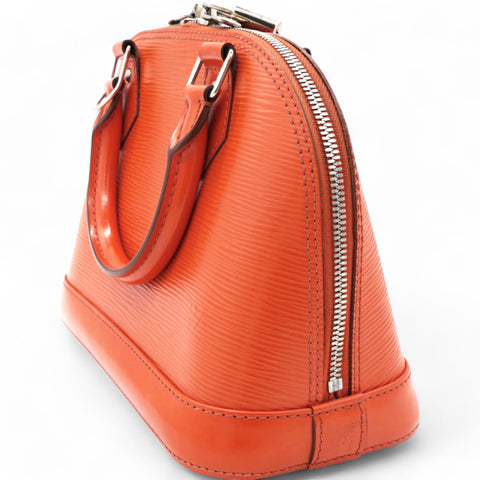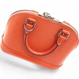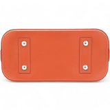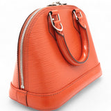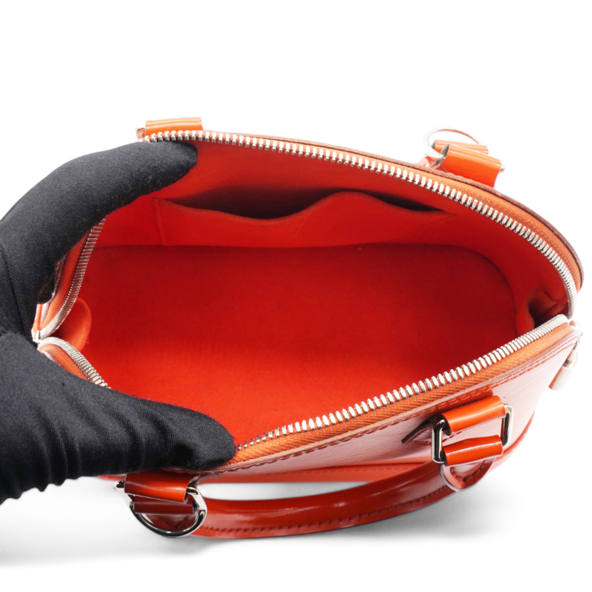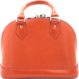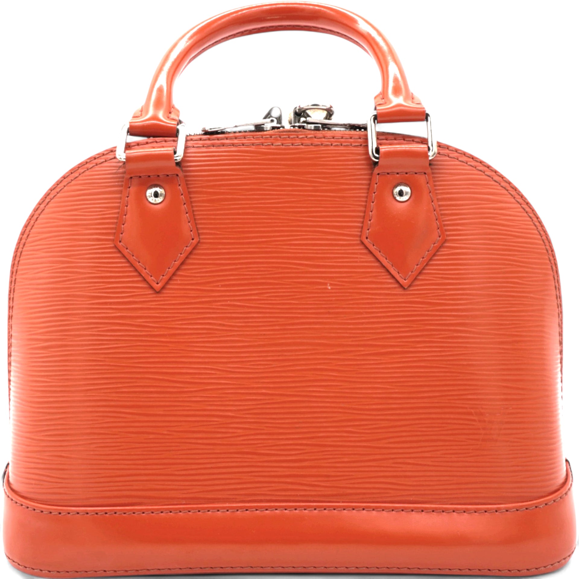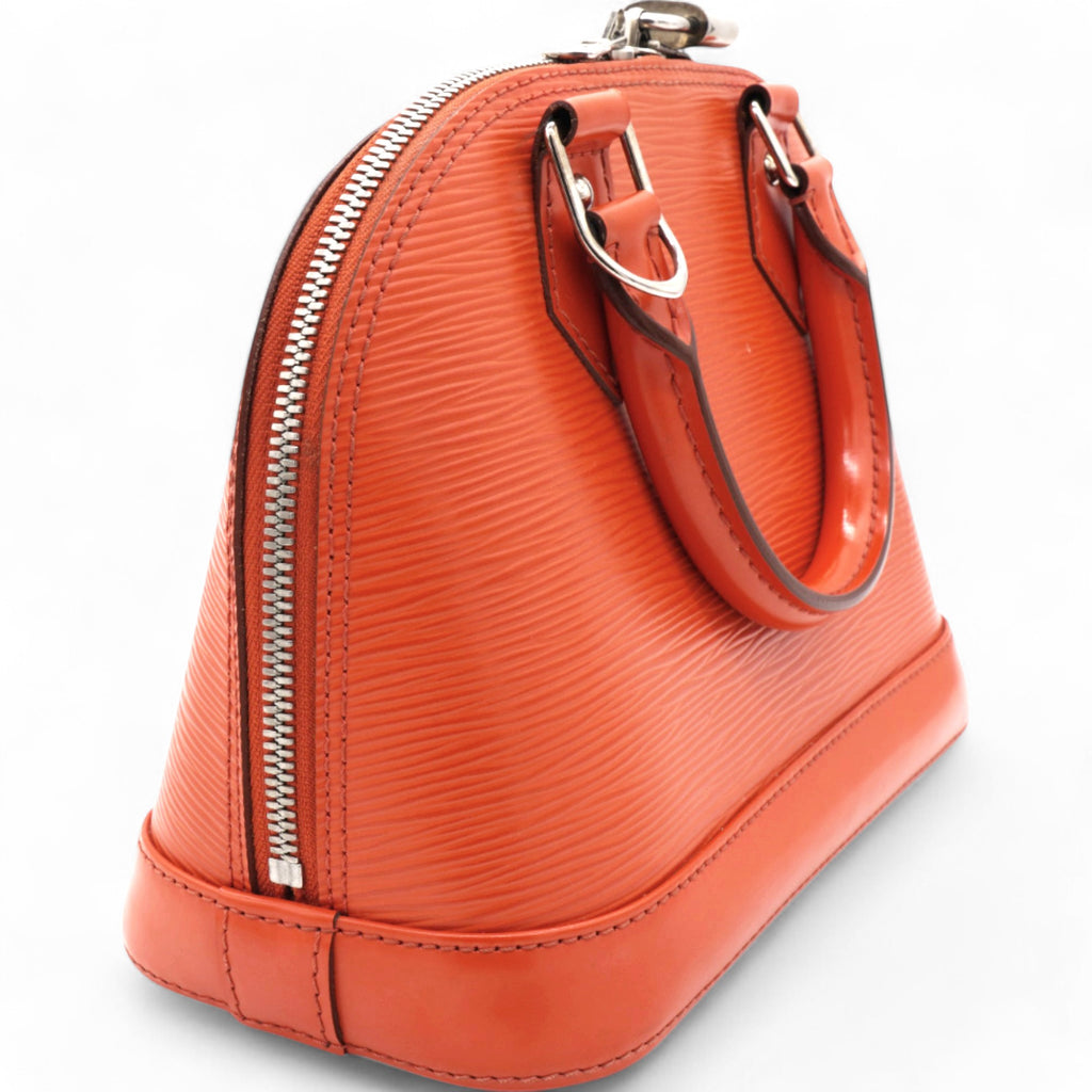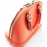 This is a chic bag created of Louis Vuitton signature textured Epi leather in orange. The handbag features cowhide rolled leather top handles and trim, polished silver-tone hardware, matching leather shoulder strap plus lock and keys. The bag opens to an orange microfiber interior with a patch pocket.
