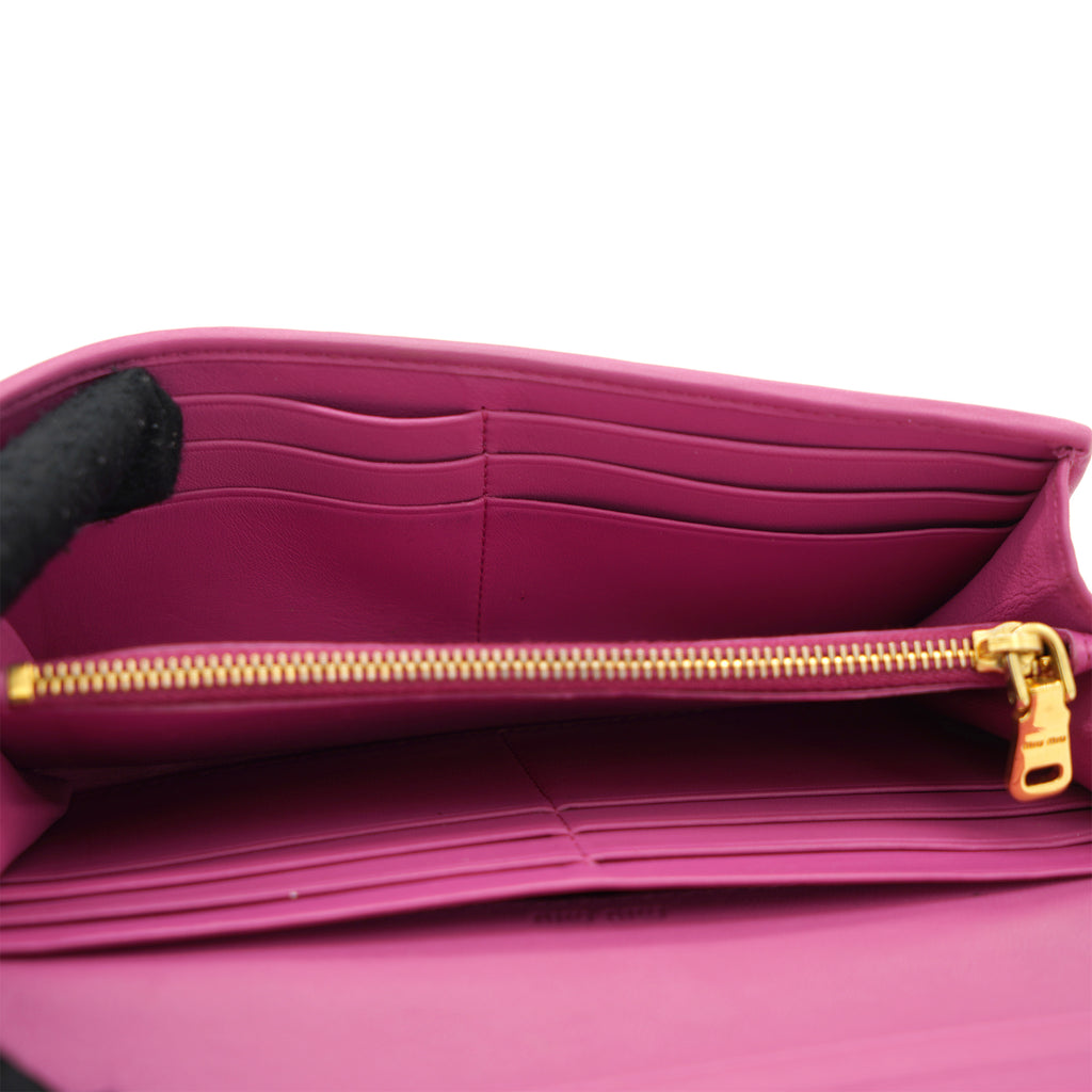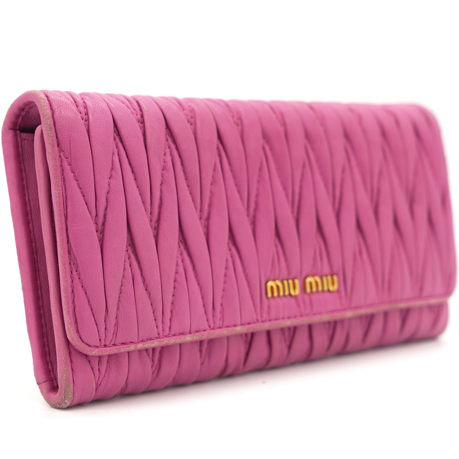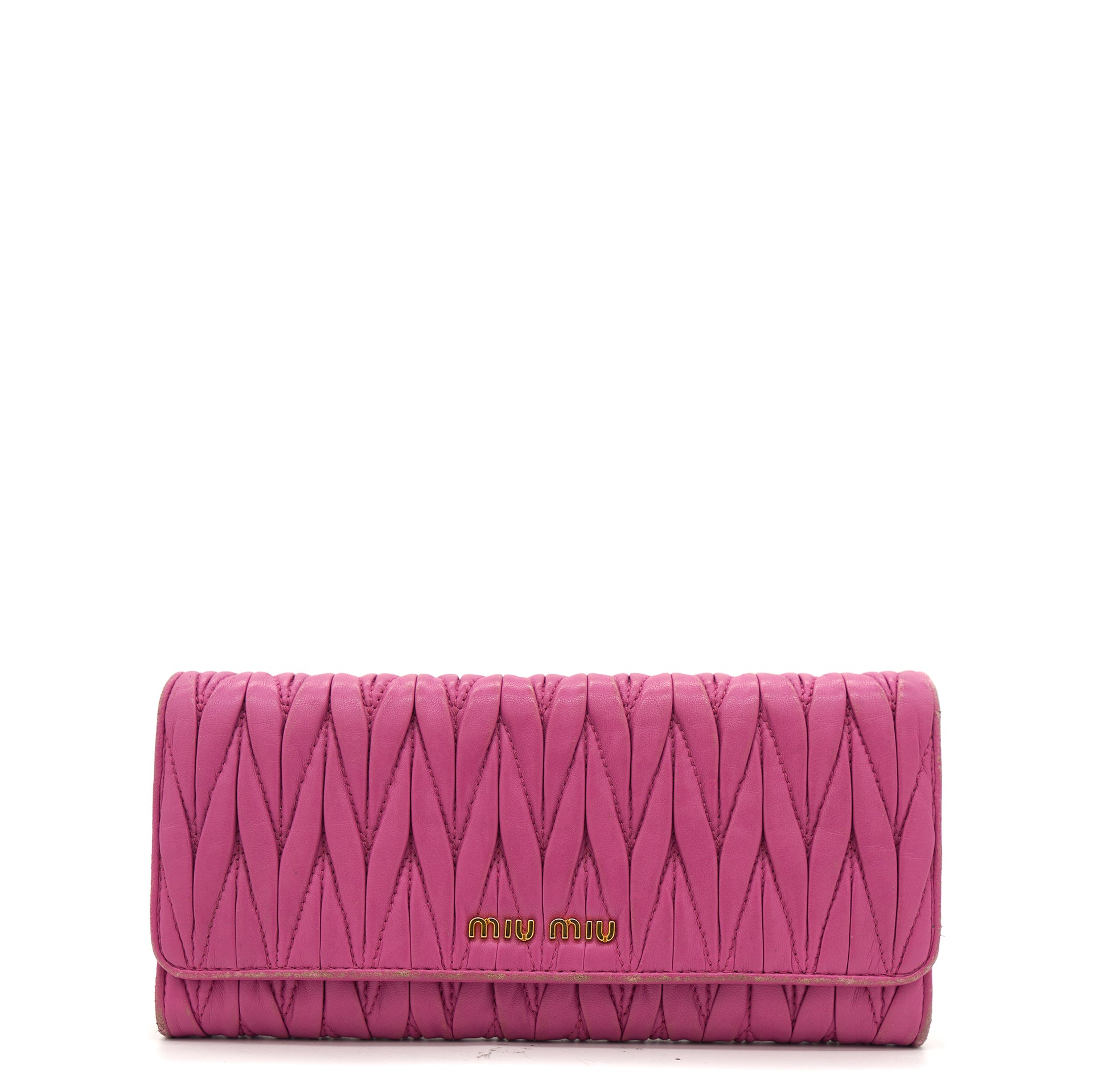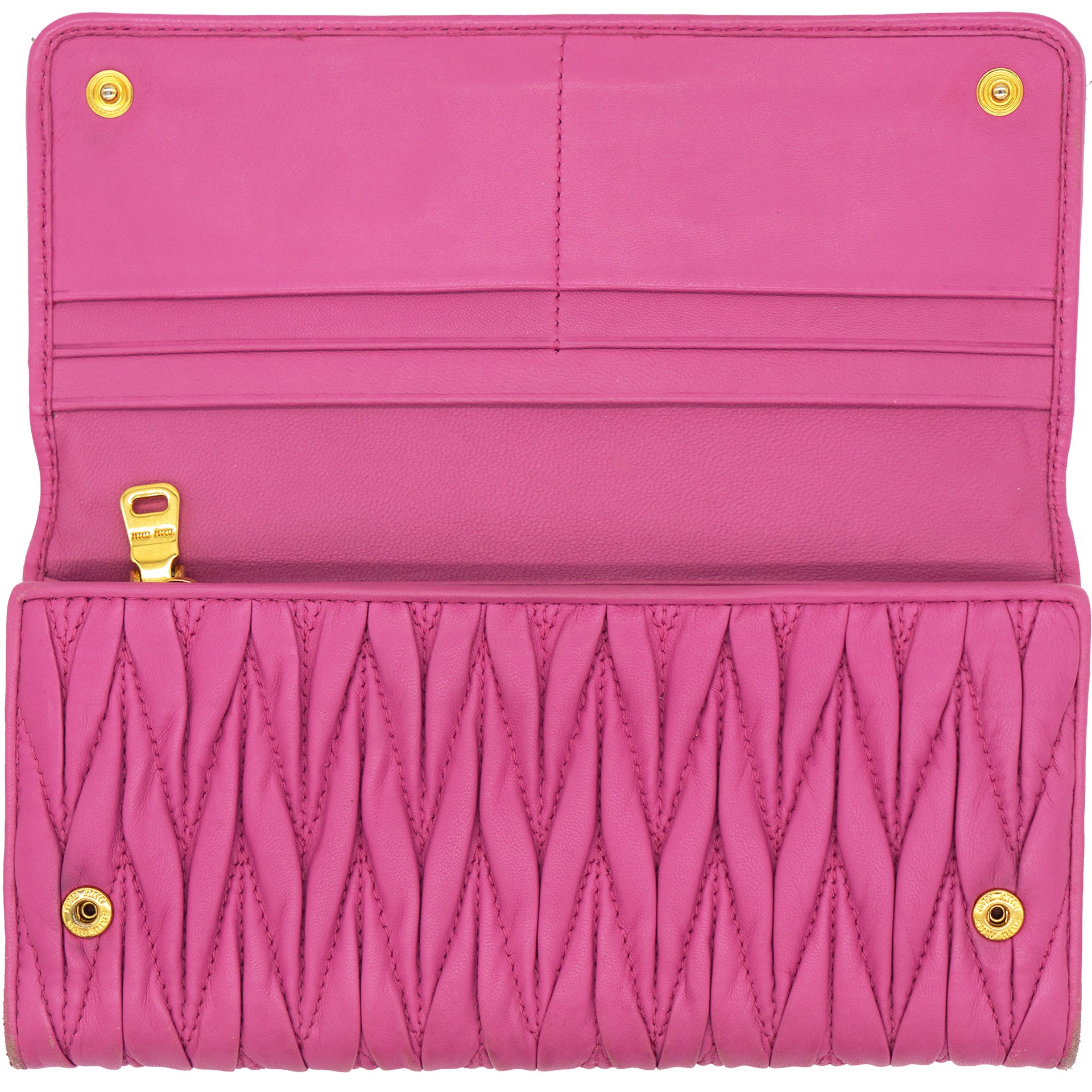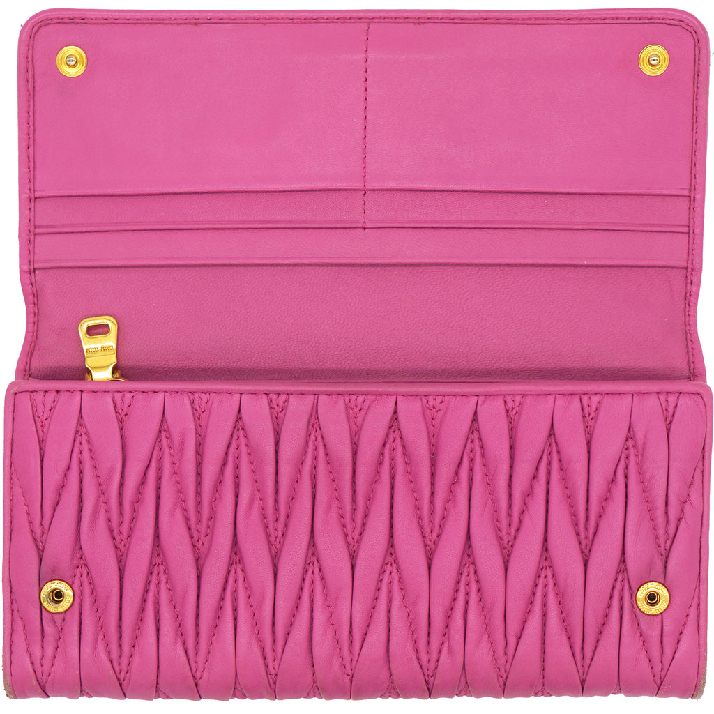 | Miu Miu presents this highly functional and trendy continental wallet. It is durable and precisely made from fuschia Matelasse leather. The frontal flap is adorned with a gold-toned brand logo. This wallet ensures the safety of your essentials. |