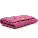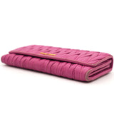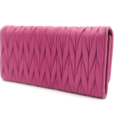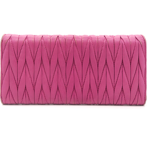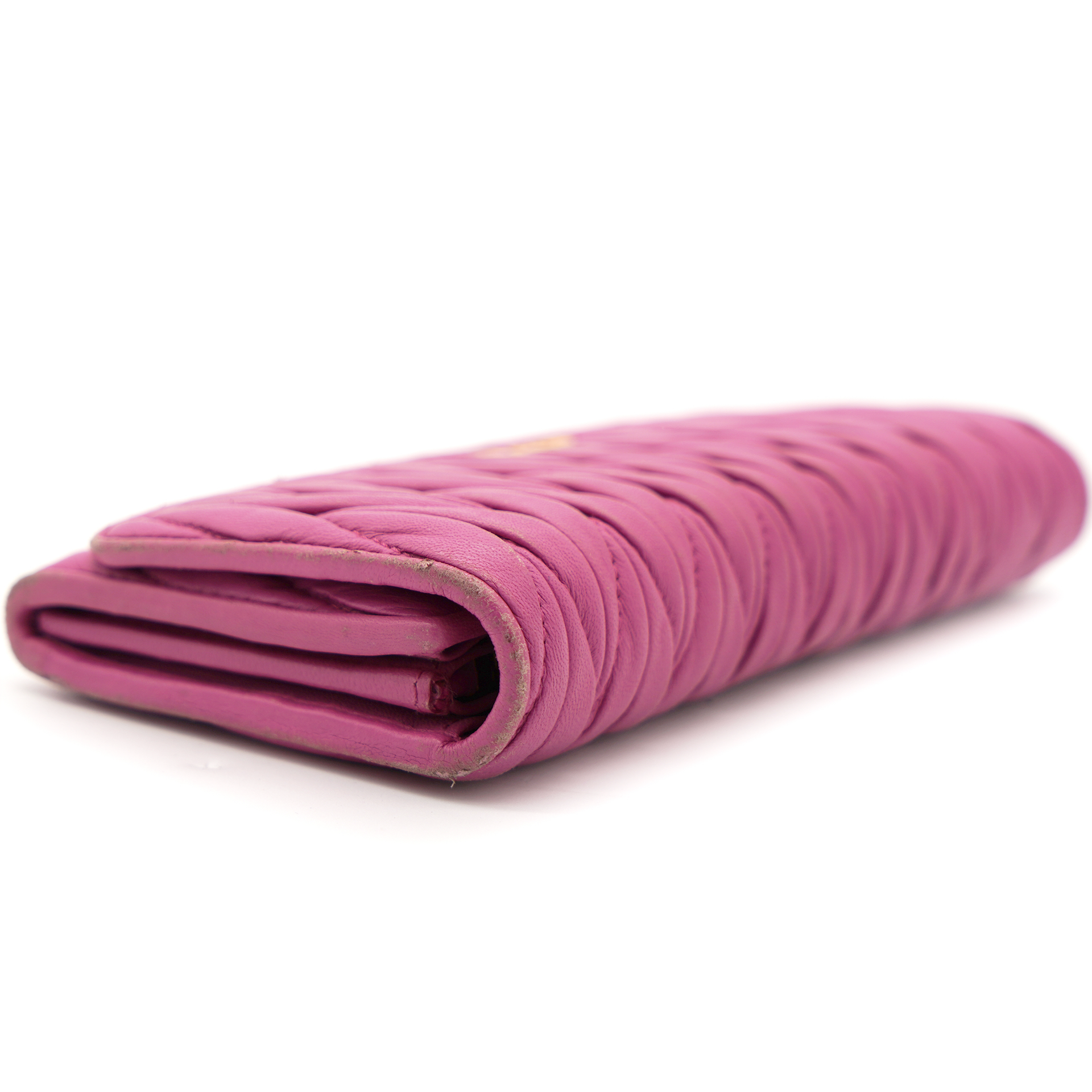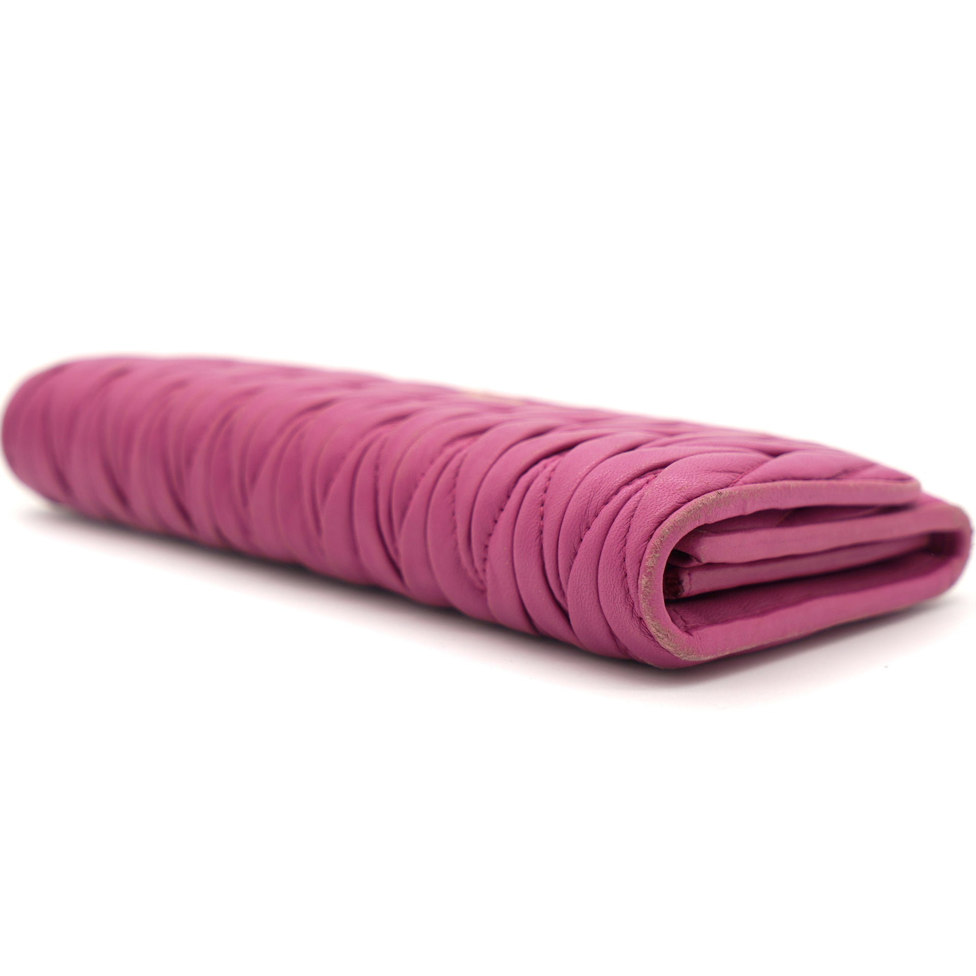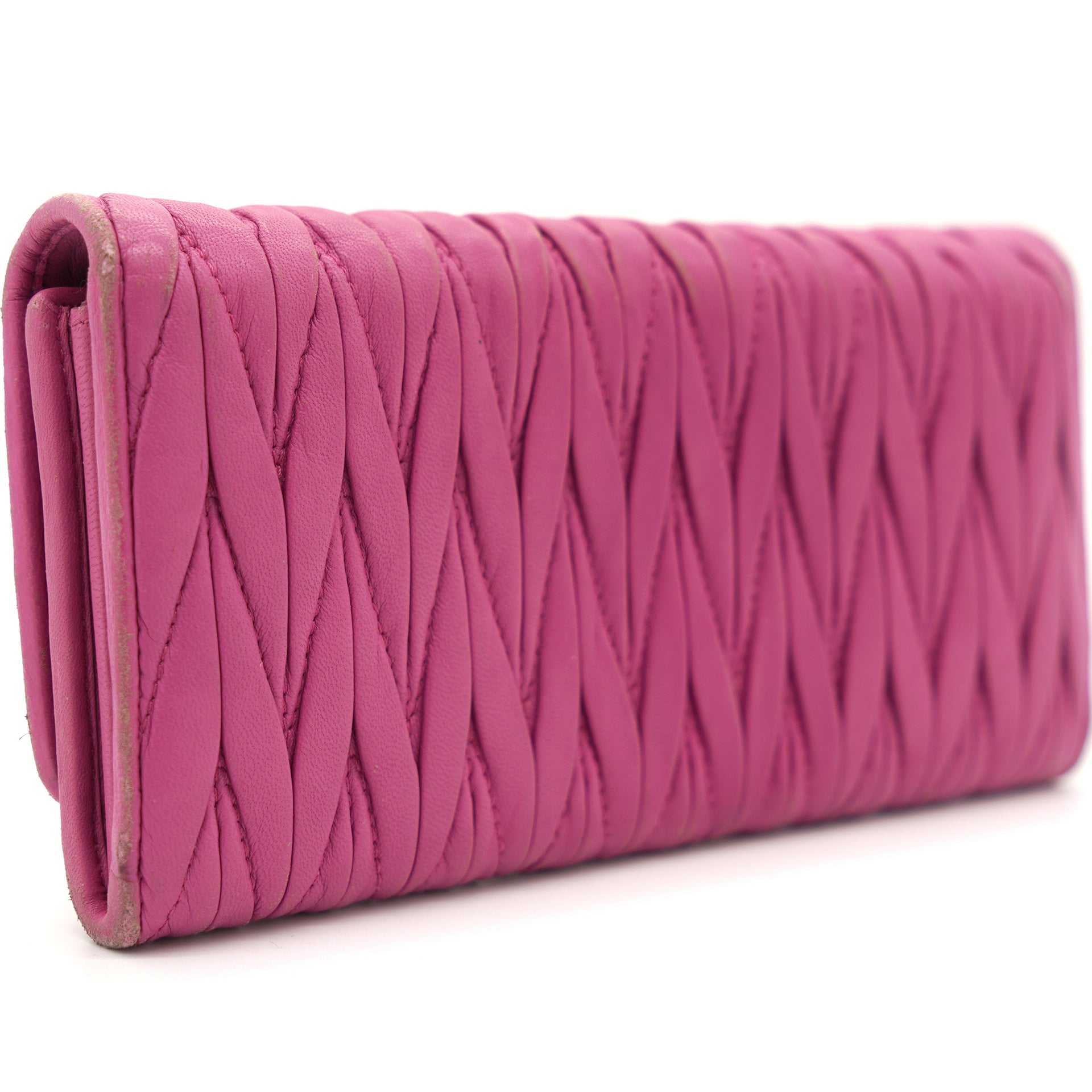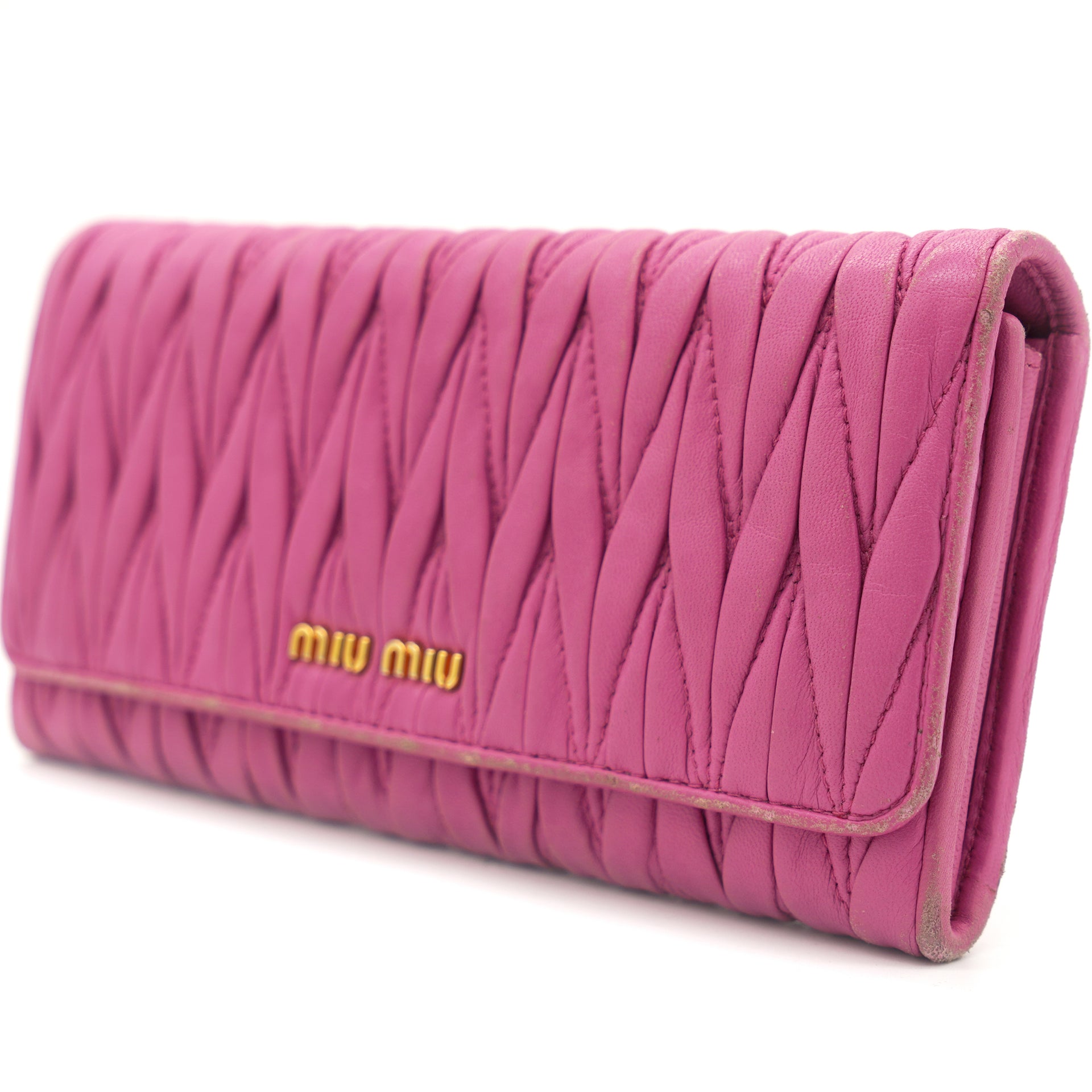 | Miu Miu presents this highly functional and trendy continental wallet. It is durable and precisely made from fuschia Matelasse leather. The frontal flap is adorned with a gold-toned brand logo. This wallet ensures the safety of your essentials. |