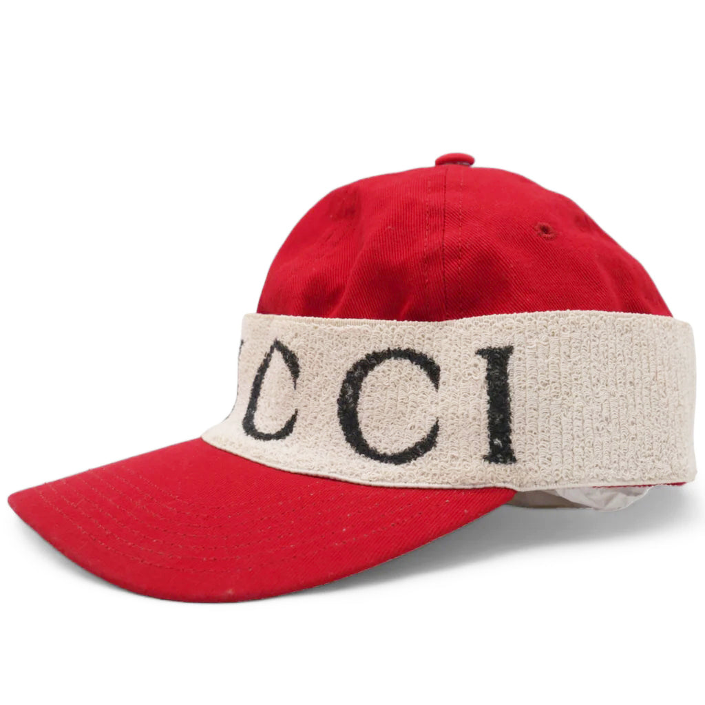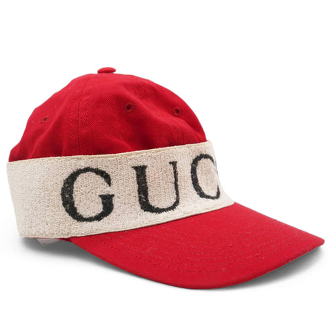 This baseball cap is crafted of red thick gabardine fabric and features an ivory fabric trim with the Gucci logo in black.