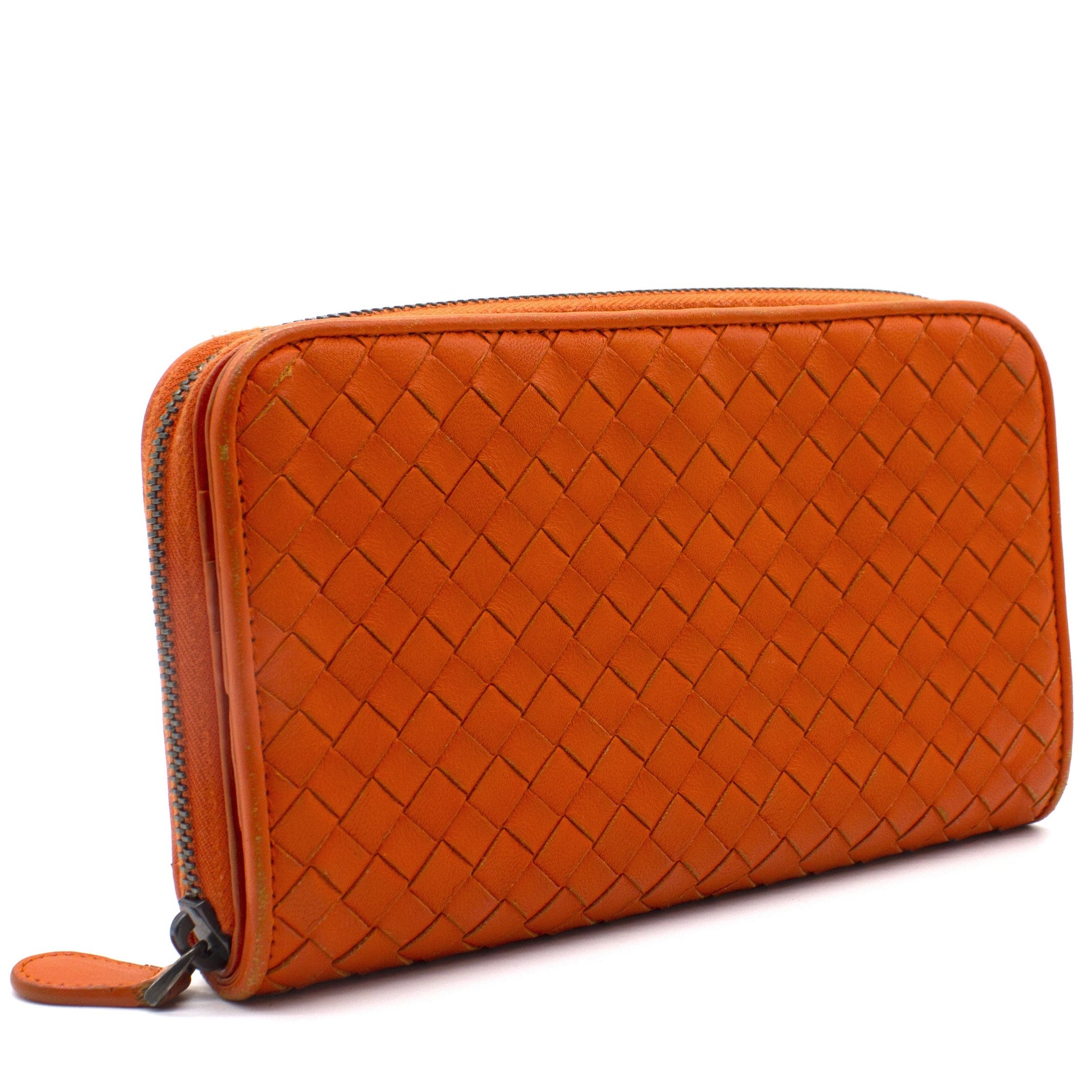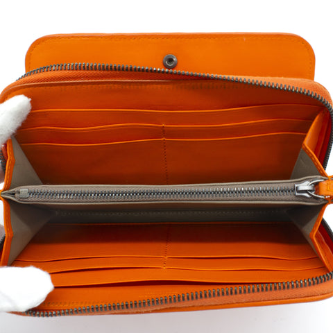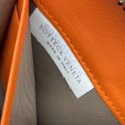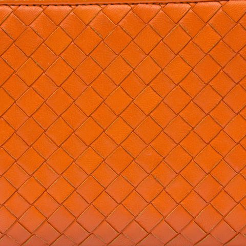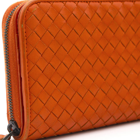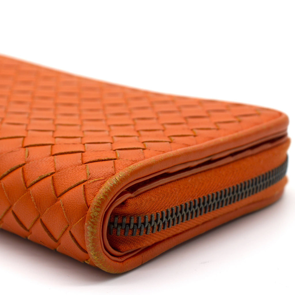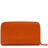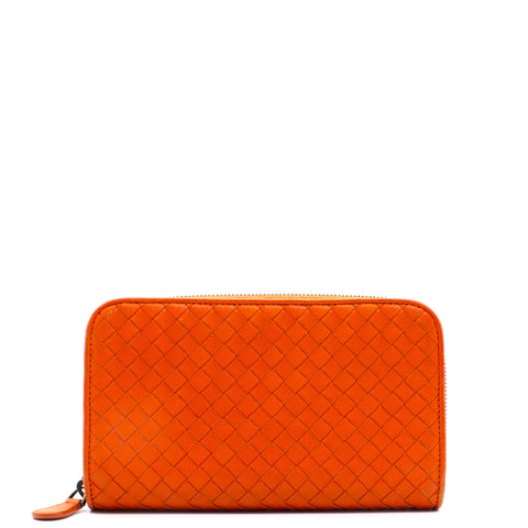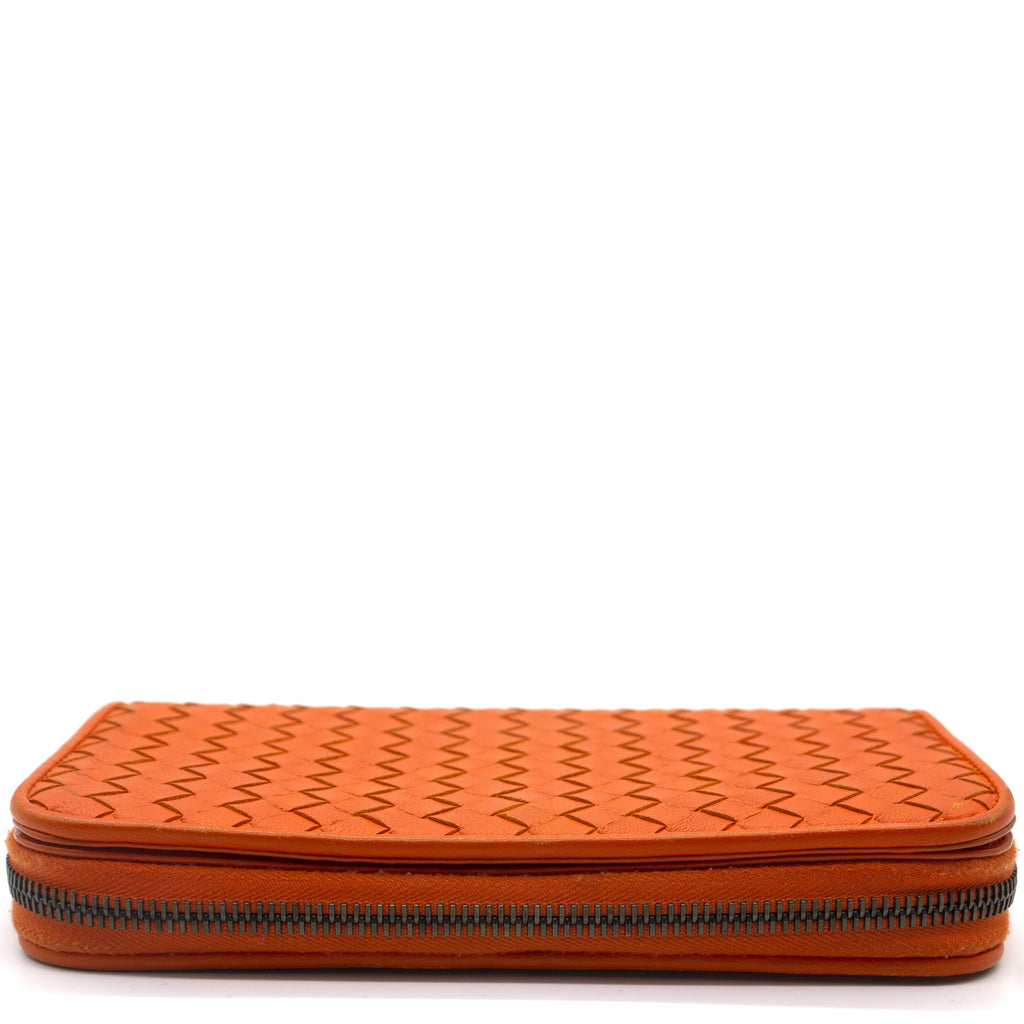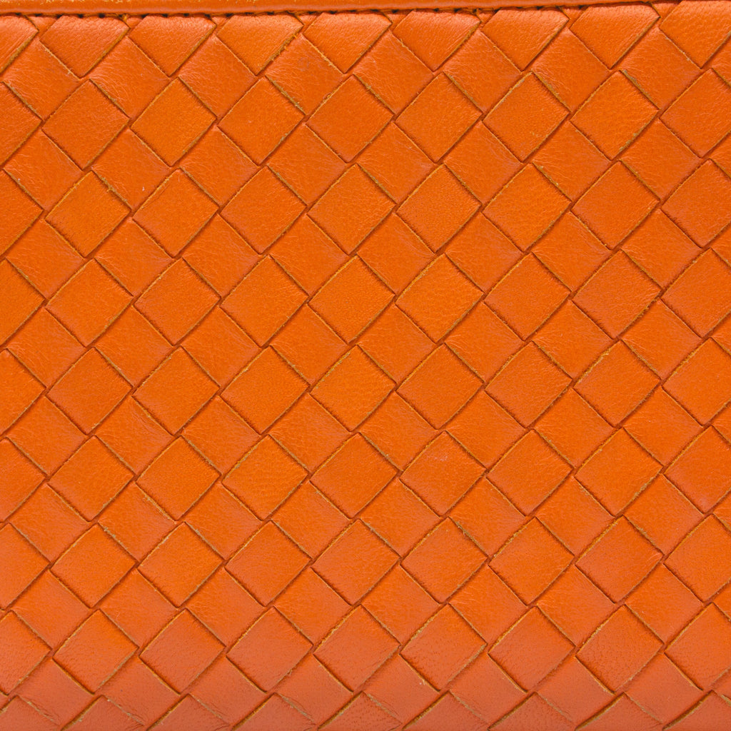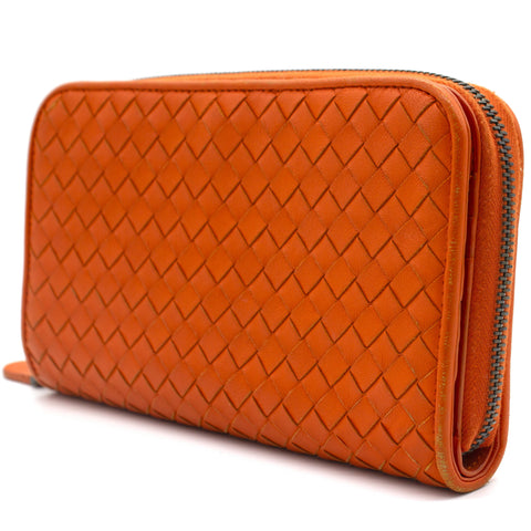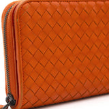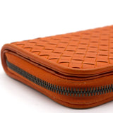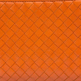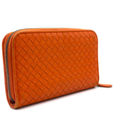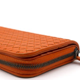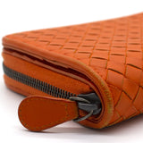 Orange Intrecciato leather Bottega Veneta Long wallet with silver-tone hardware, two main compartment: one with zip around closure, open to chocolate leather and twill lining interior and one bill compartment, four card slots, two slip pockets; one with four card slots and one slip pocket.