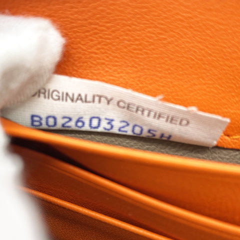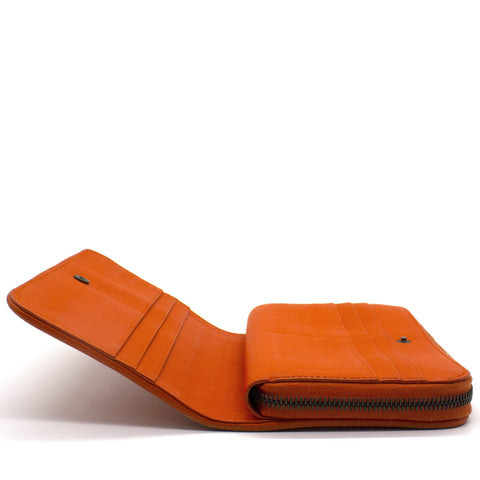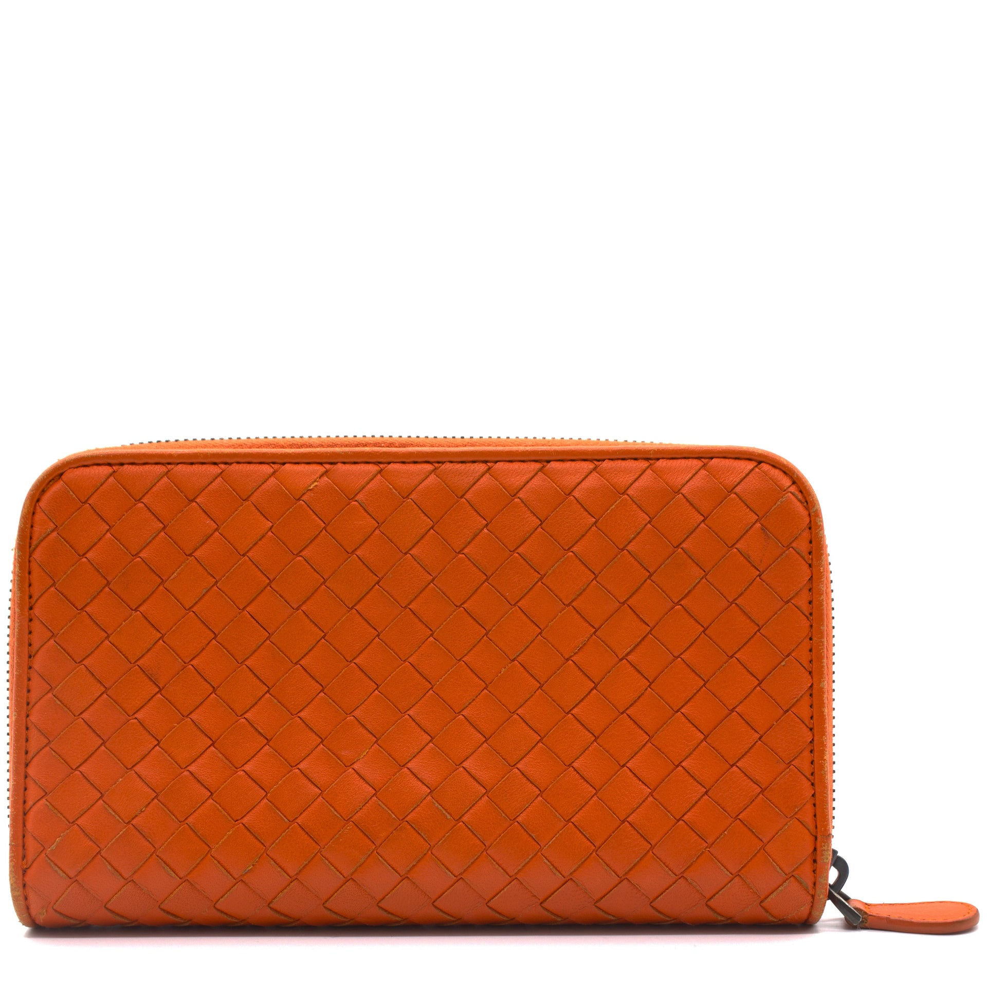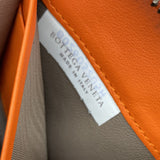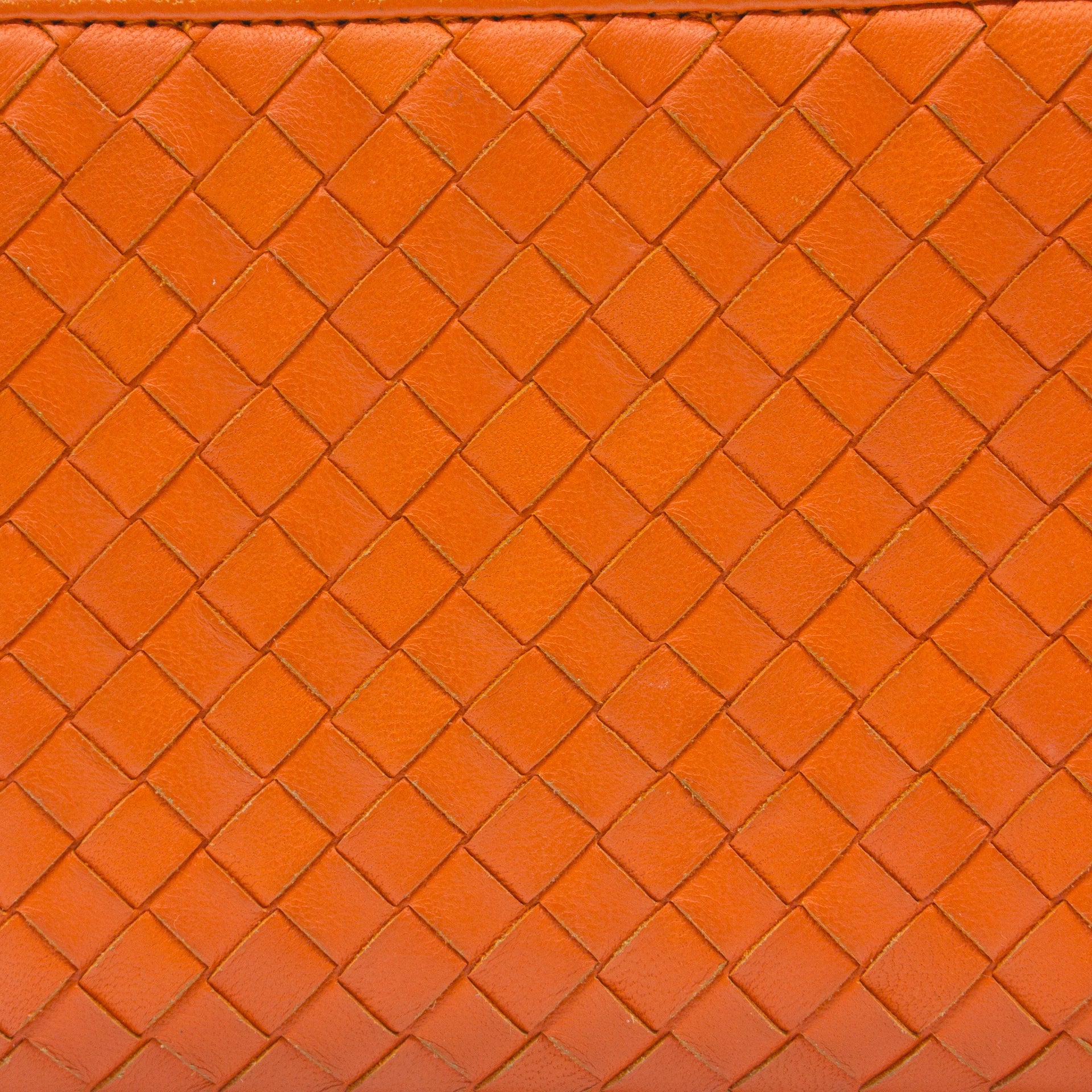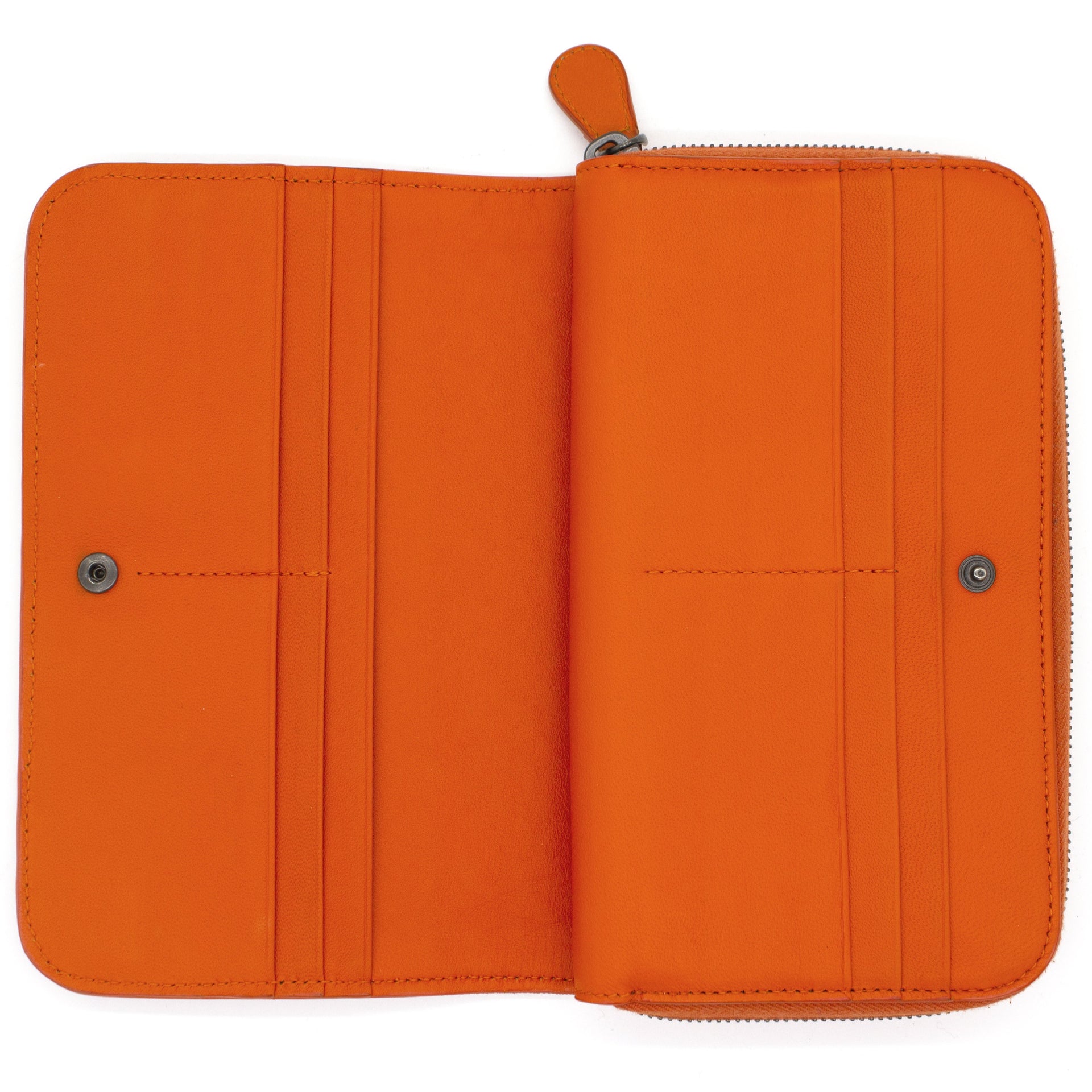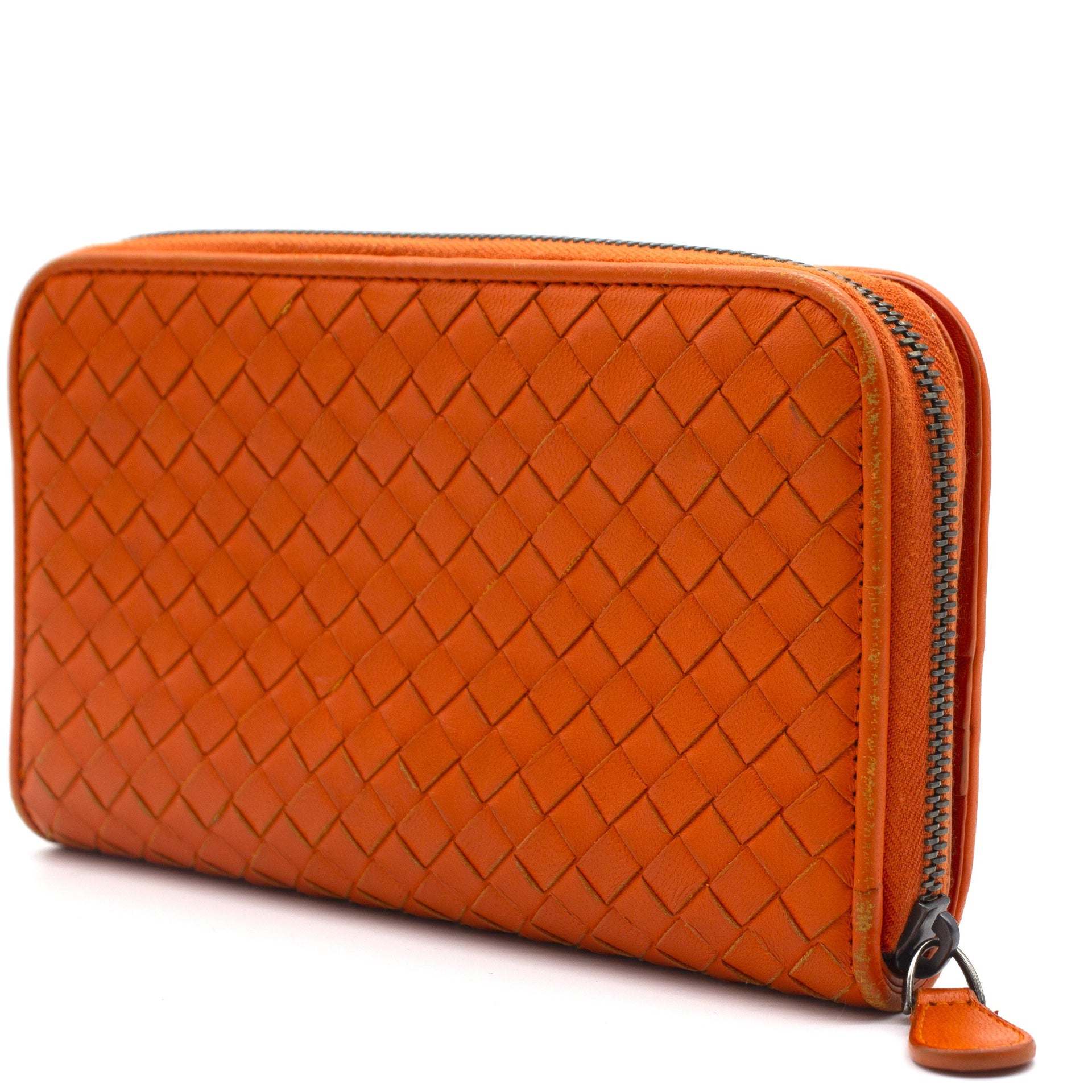 Orange Intrecciato leather Bottega Veneta Long wallet with silver-tone hardware, two main compartment: one with zip around closure, open to chocolate leather and twill lining interior and one bill compartment, four card slots, two slip pockets; one with four card slots and one slip pocket.
