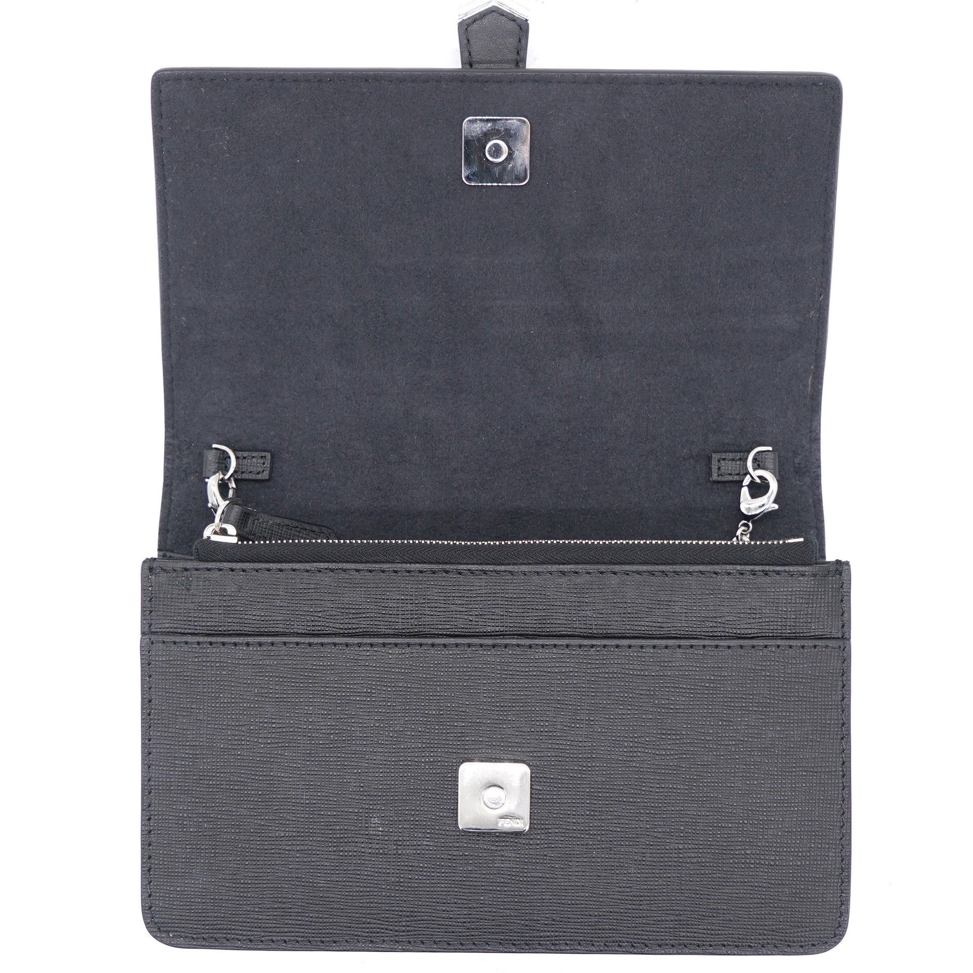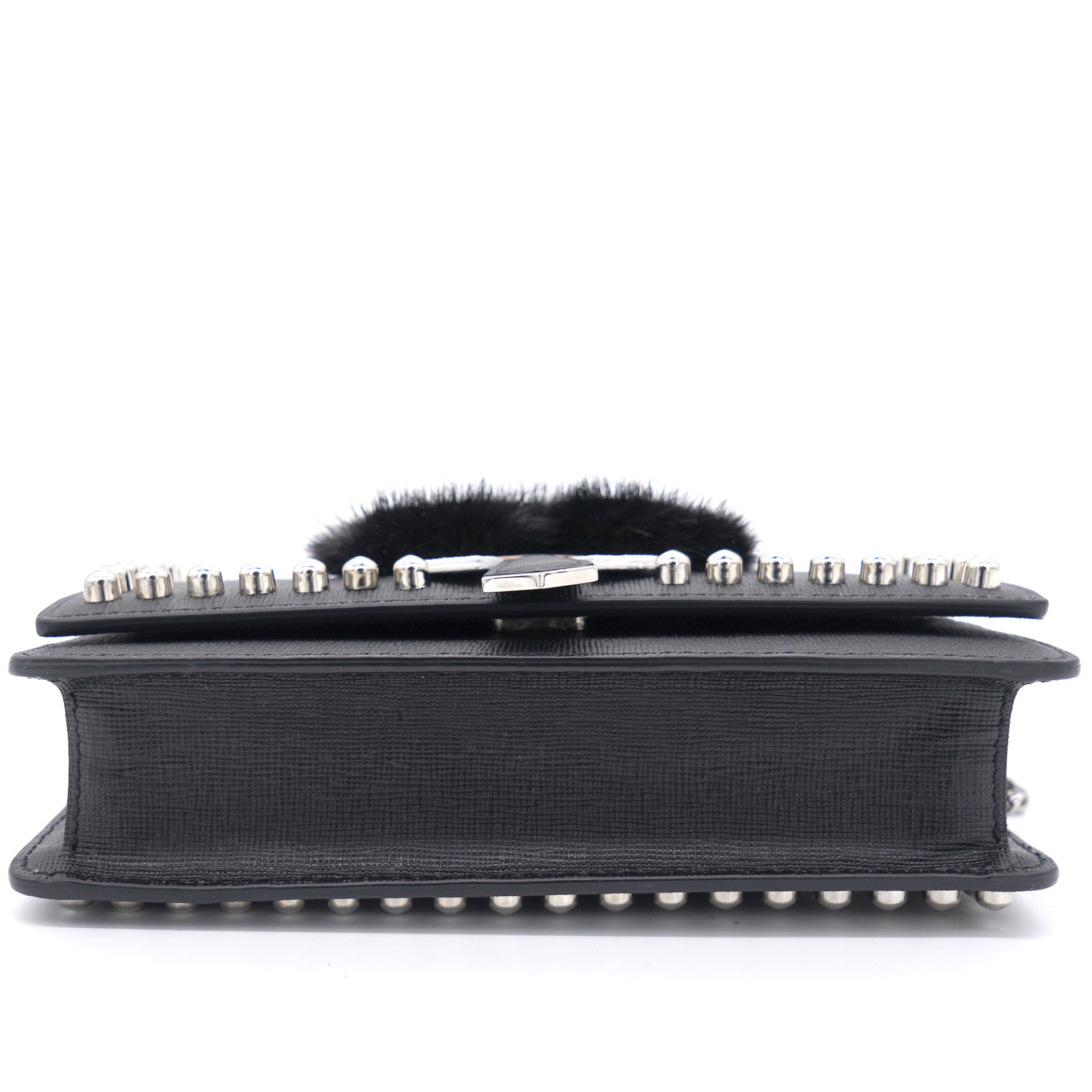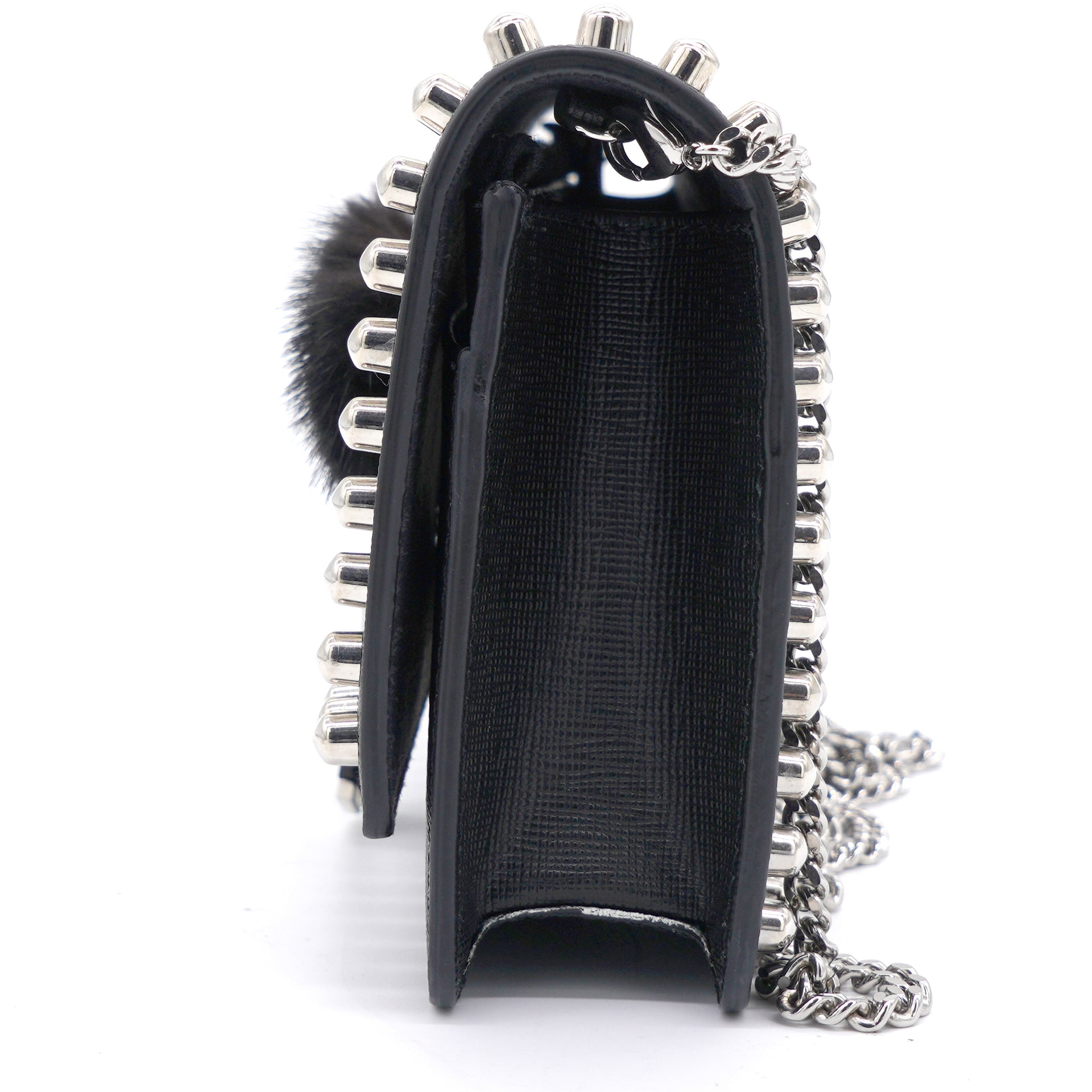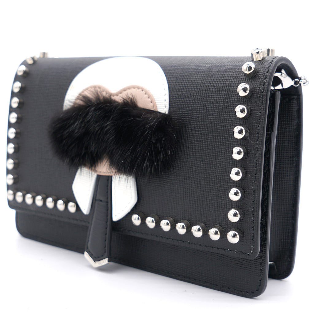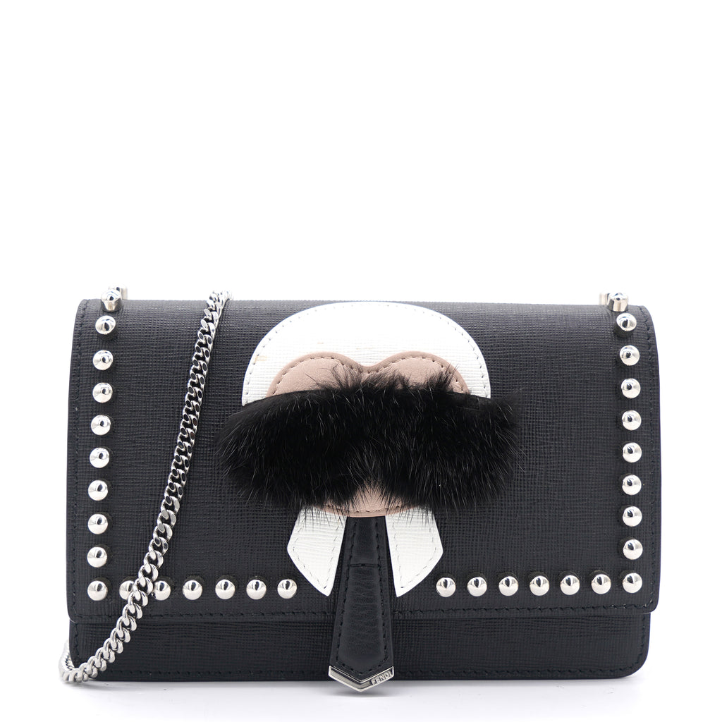 | This delightful wallet is crafted of cross-grain calfskin leather in black. It features an optional shoulder strap and silver rounded studs around the wallet with a Karlito character in the front center with mink fur sunglasses. The flap opens to a black fabric interior with card slots and a currency compartment. |