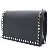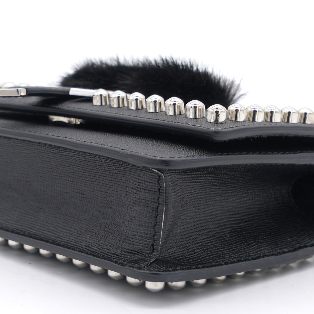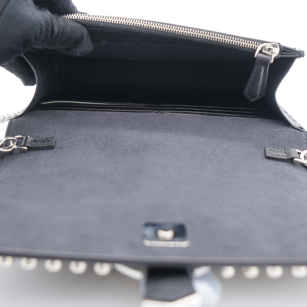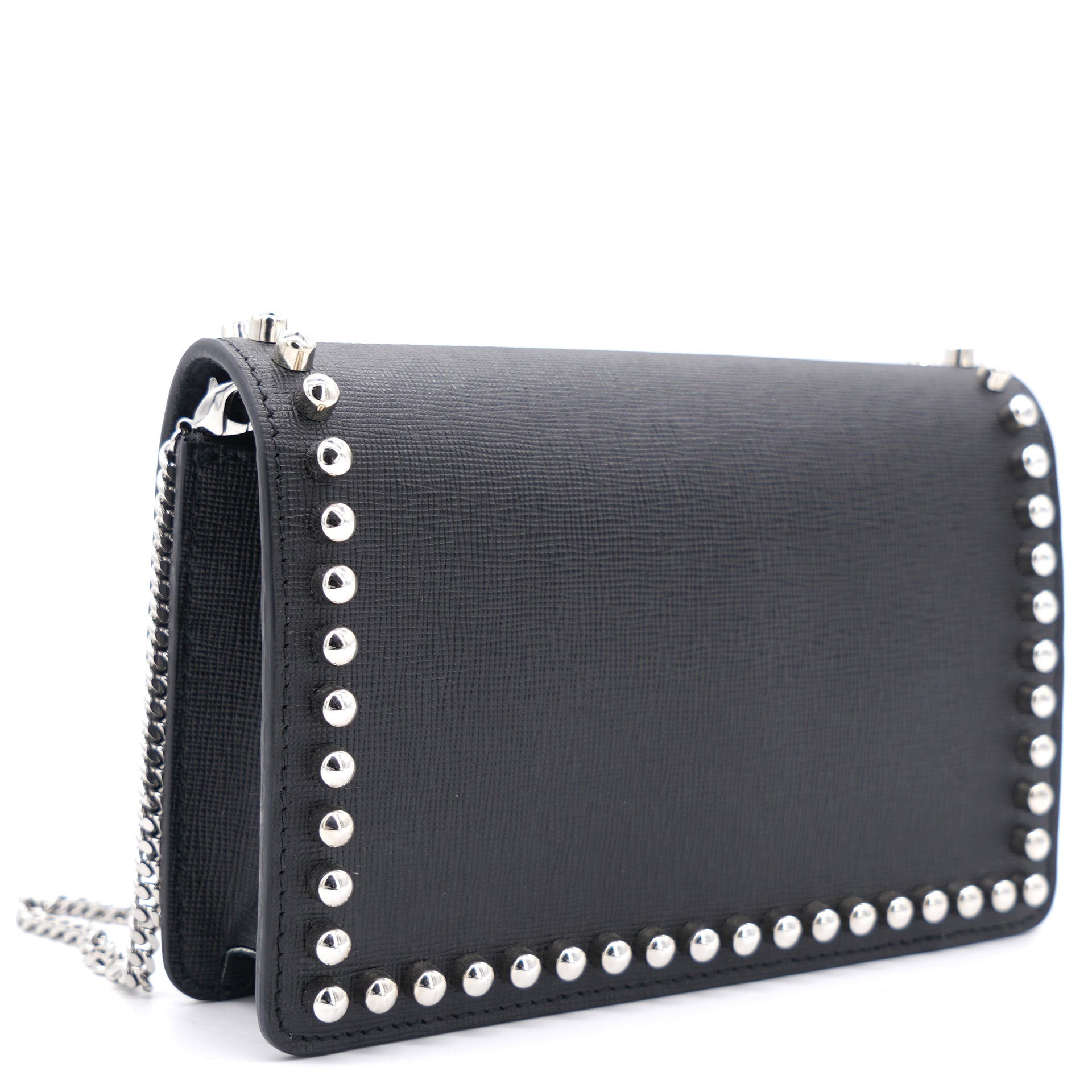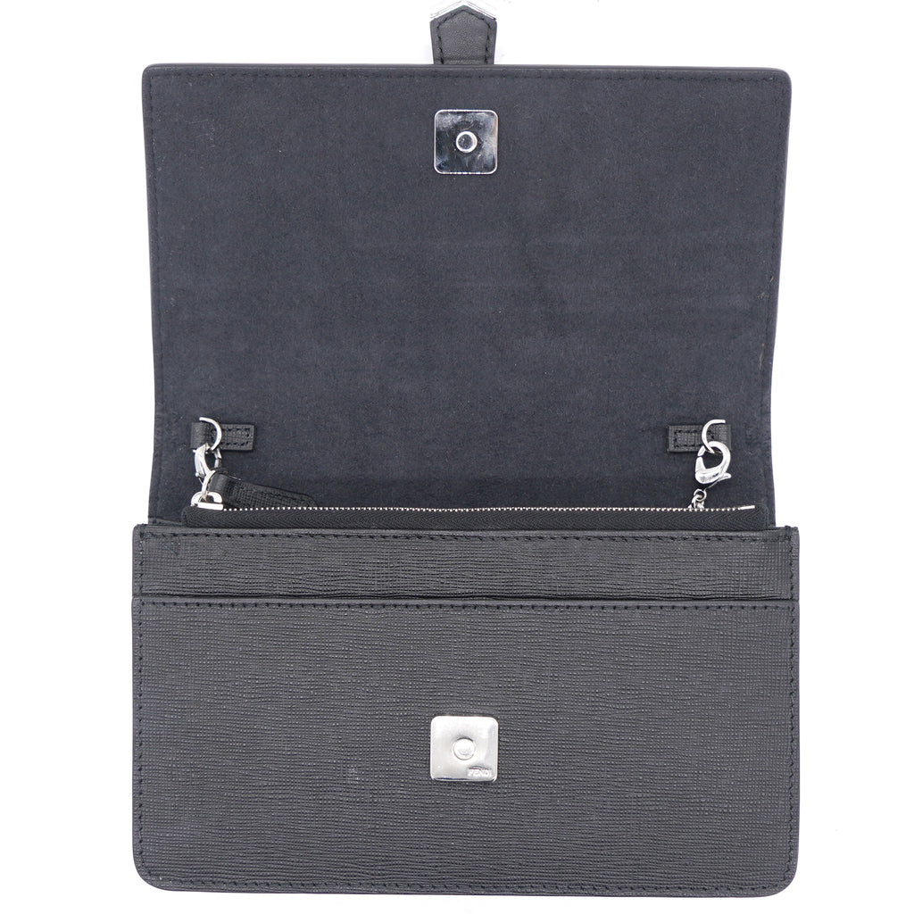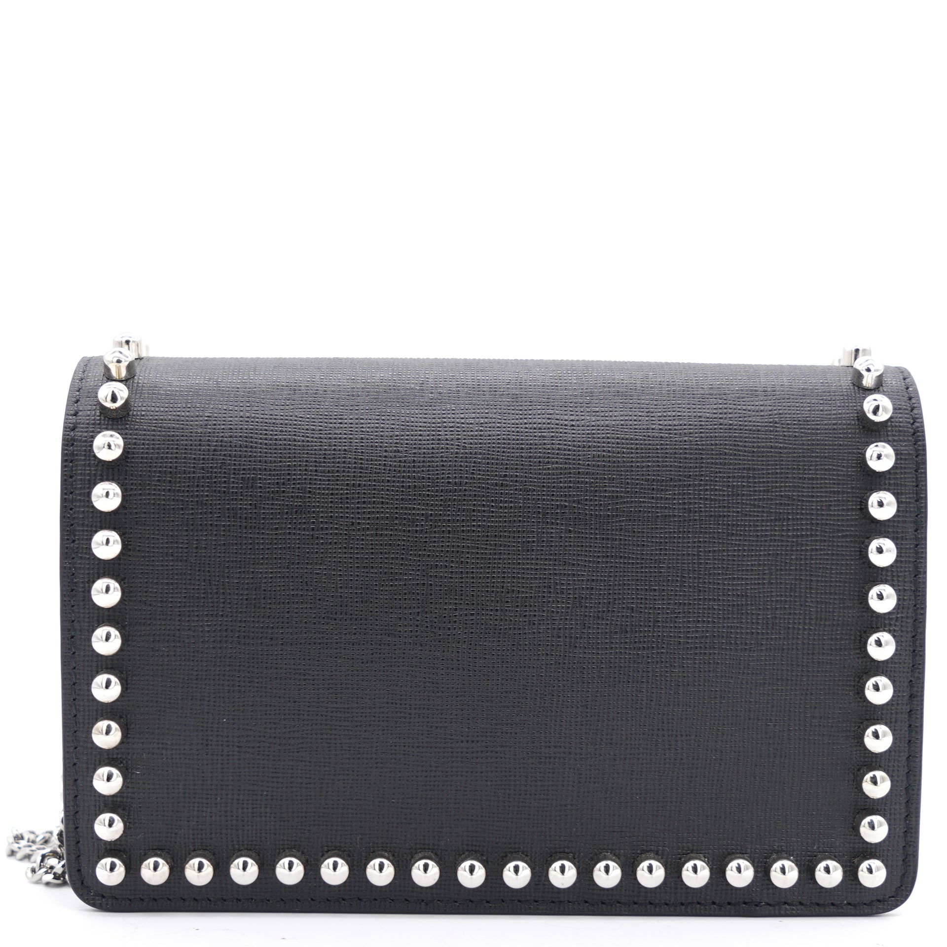 | This delightful wallet is crafted of cross-grain calfskin leather in black. It features an optional shoulder strap and silver rounded studs around the wallet with a Karlito character in the front center with mink fur sunglasses. The flap opens to a black fabric interior with card slots and a currency compartment. |