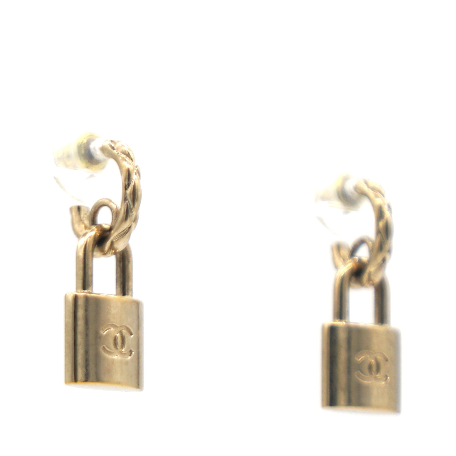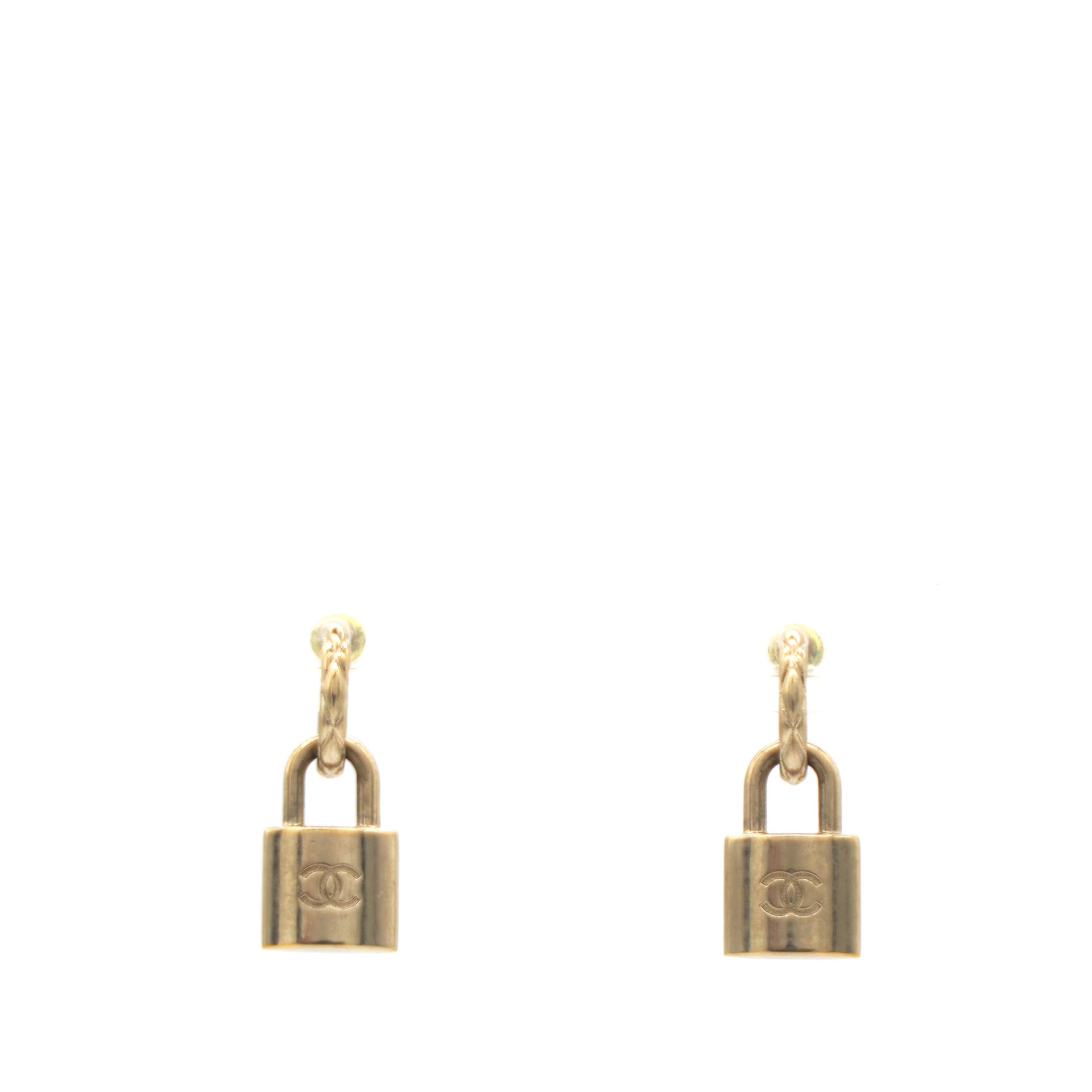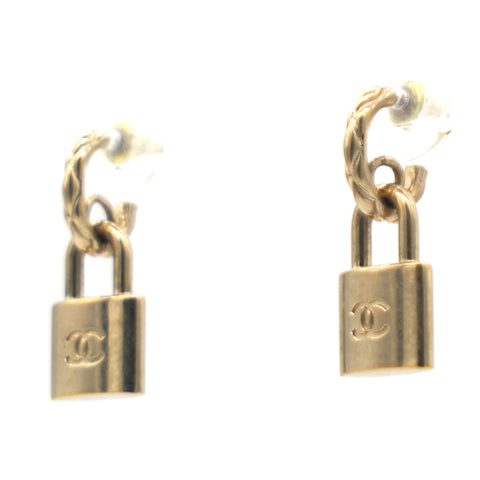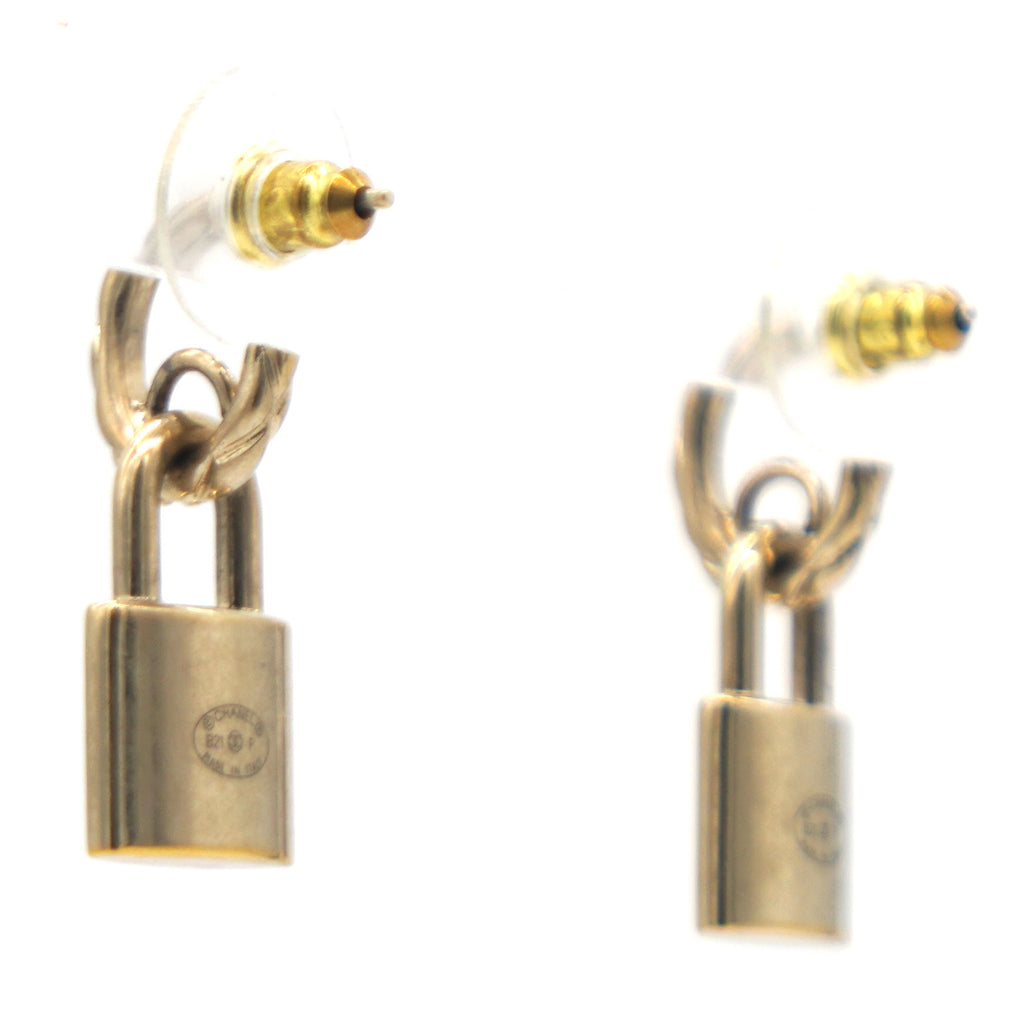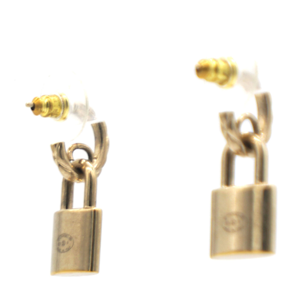 | This is an authentic CHANEL Lock Drop Earrings in Light Gold. These stylish earrings feature a small hoop with a dangling lock with the CC logo. |