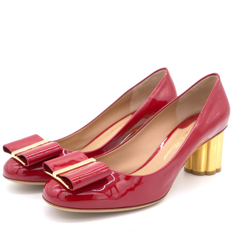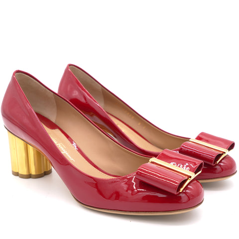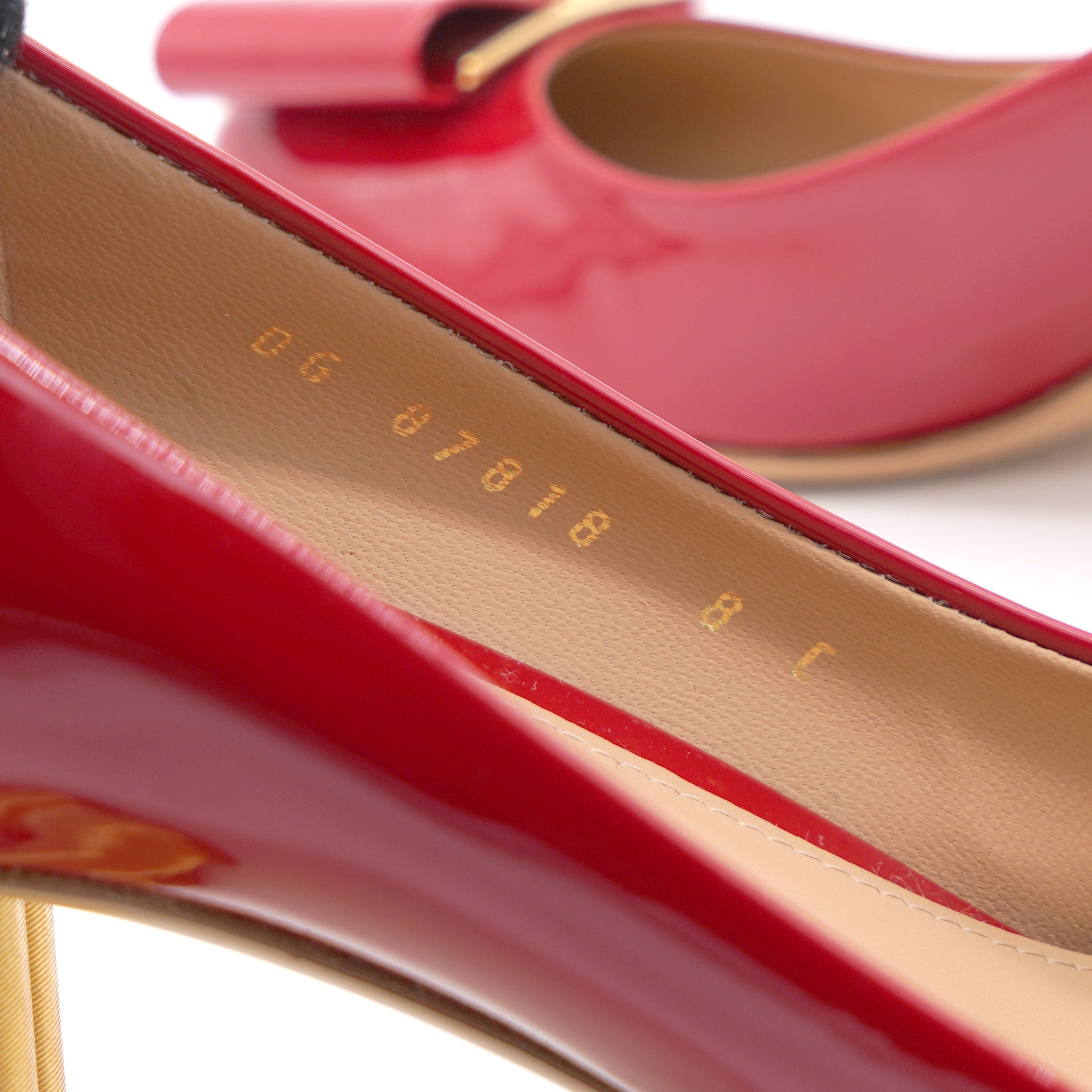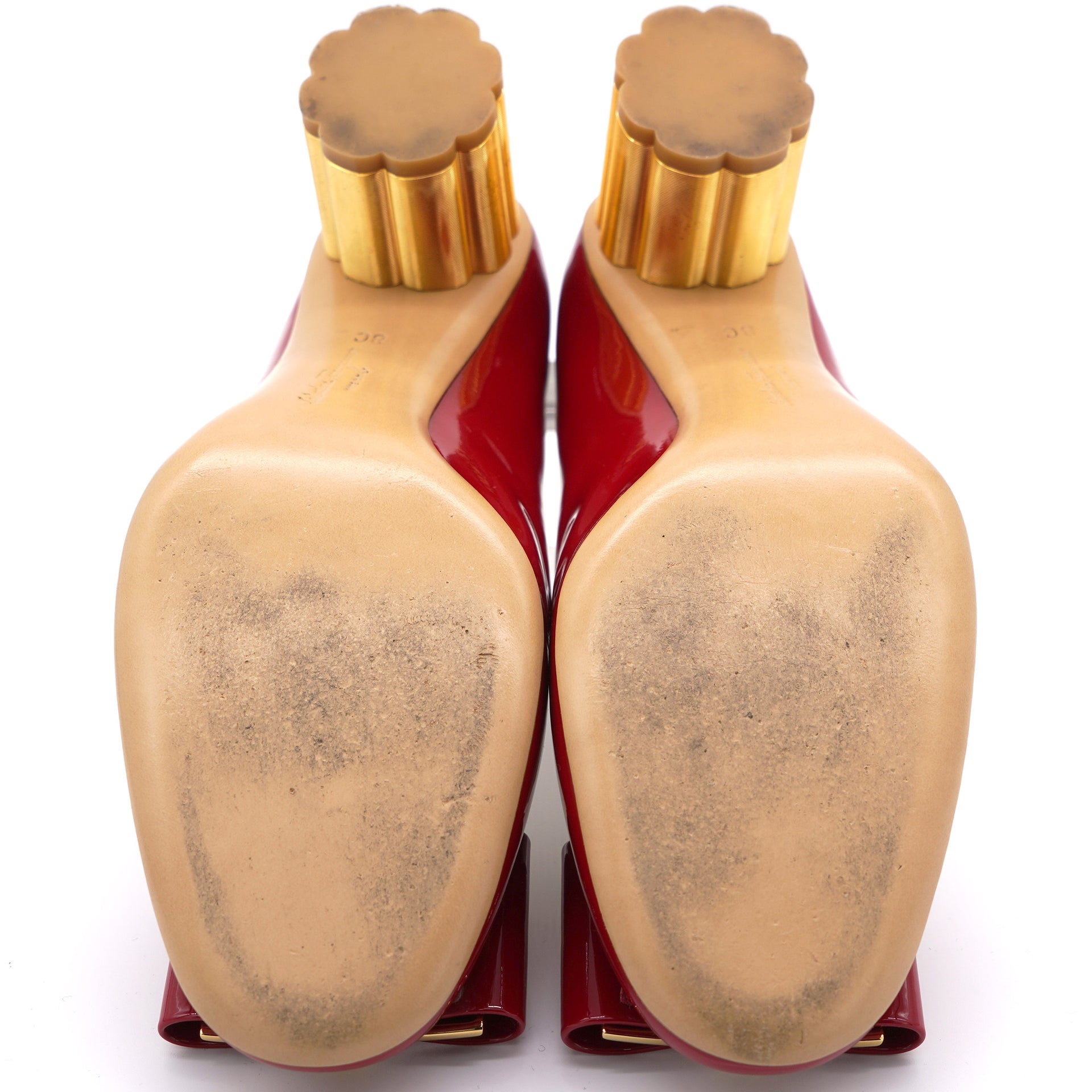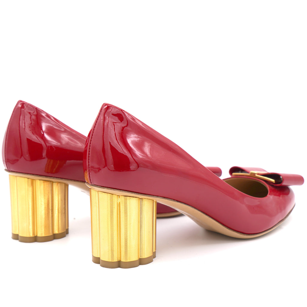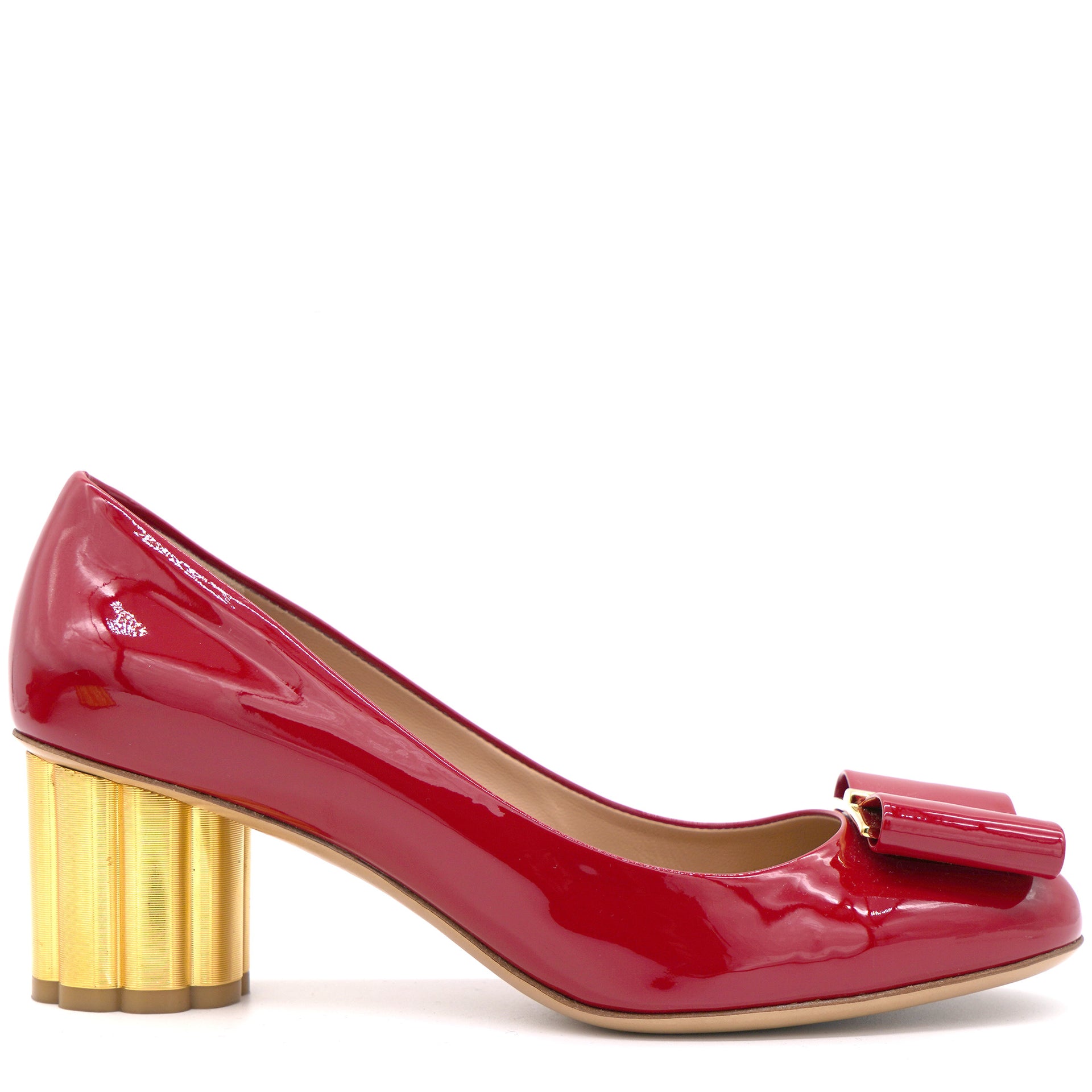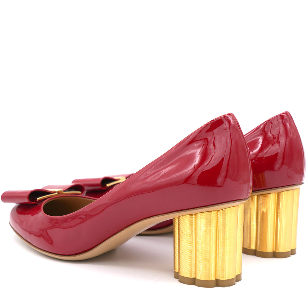 | Made from good quality leather, this pair of red pumps will add a classic touch to your collection of heels. Designed with the signature bow details on the uppers and elevated on 6 cm block sculpted heels, this red pair by Salvatore Ferragamo is the epitome of sophistication. |