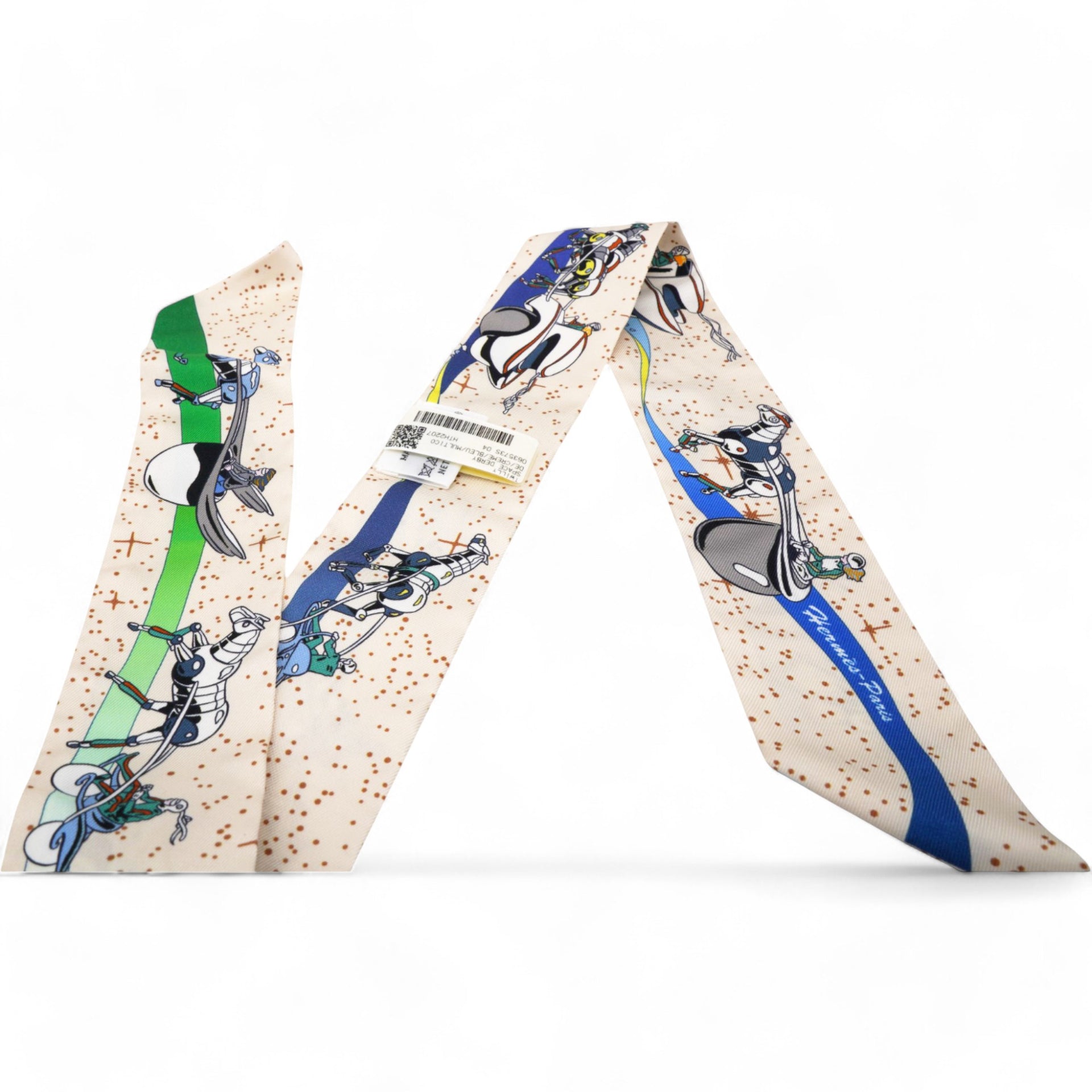 | This bold scarf is 100% silk and features a colorful graphic of horses on a creme background. |