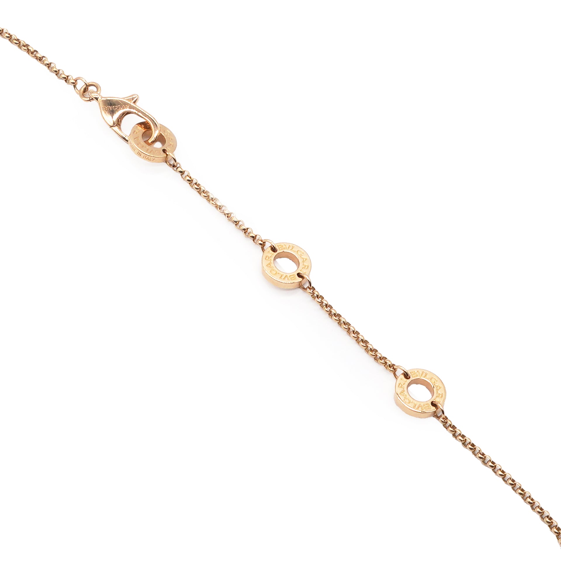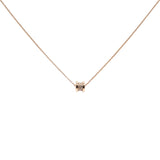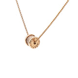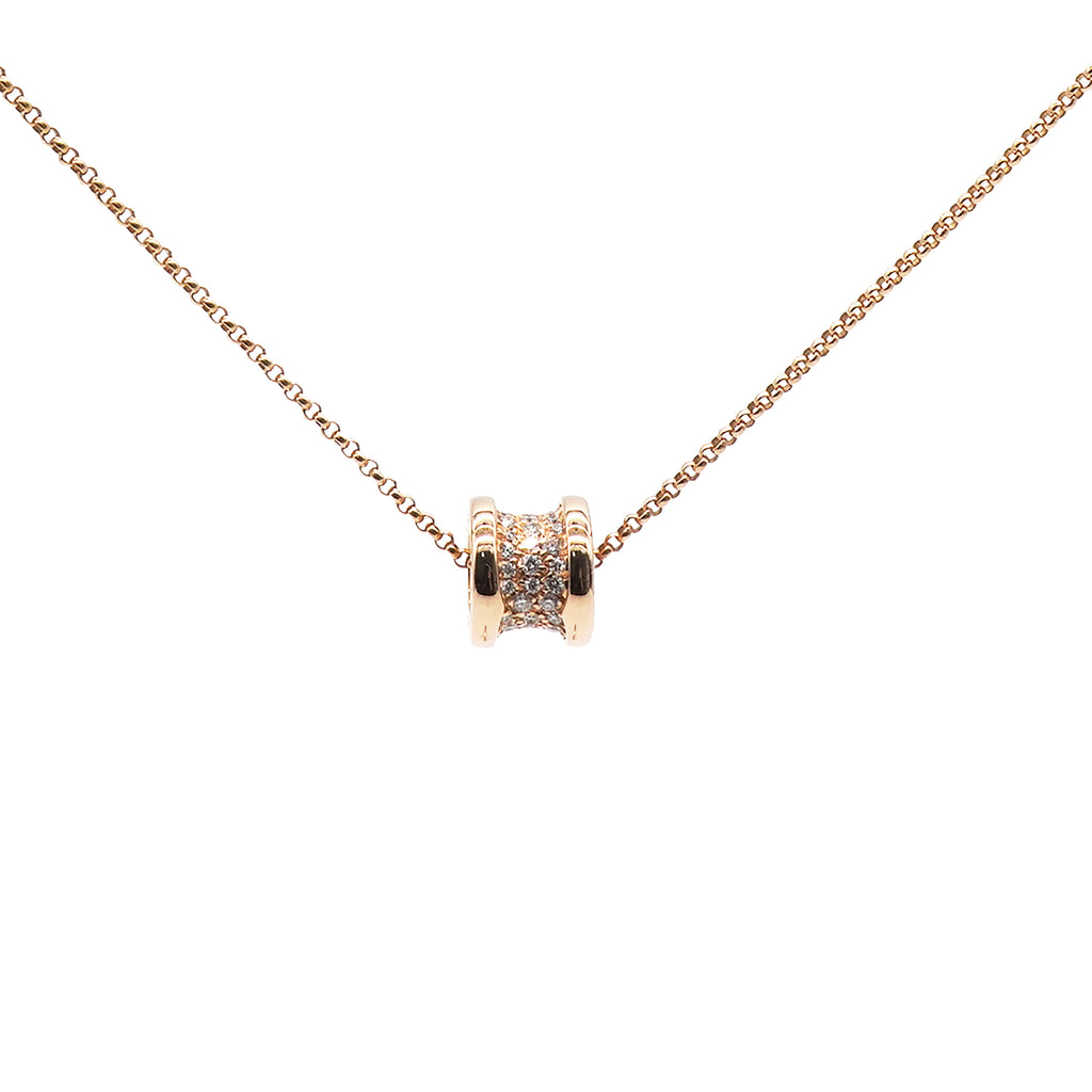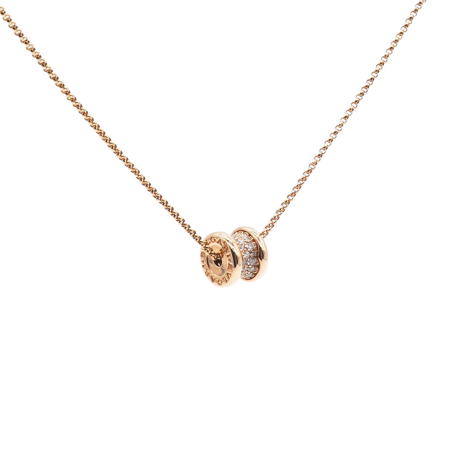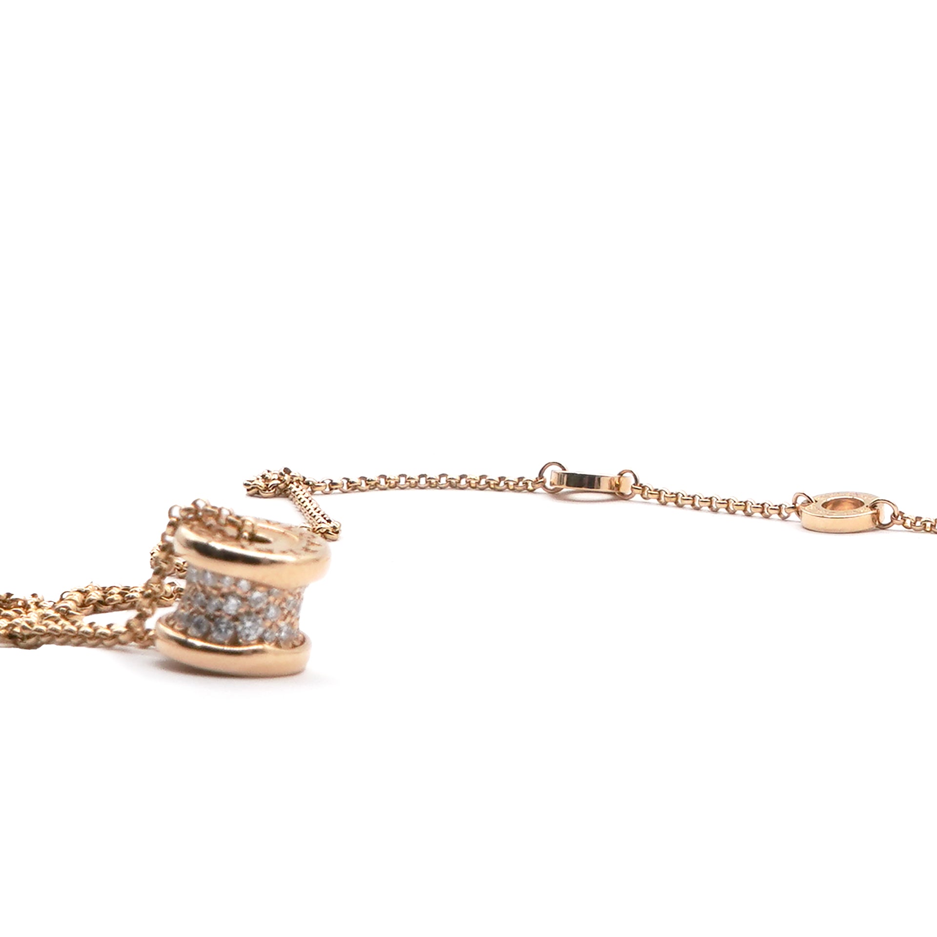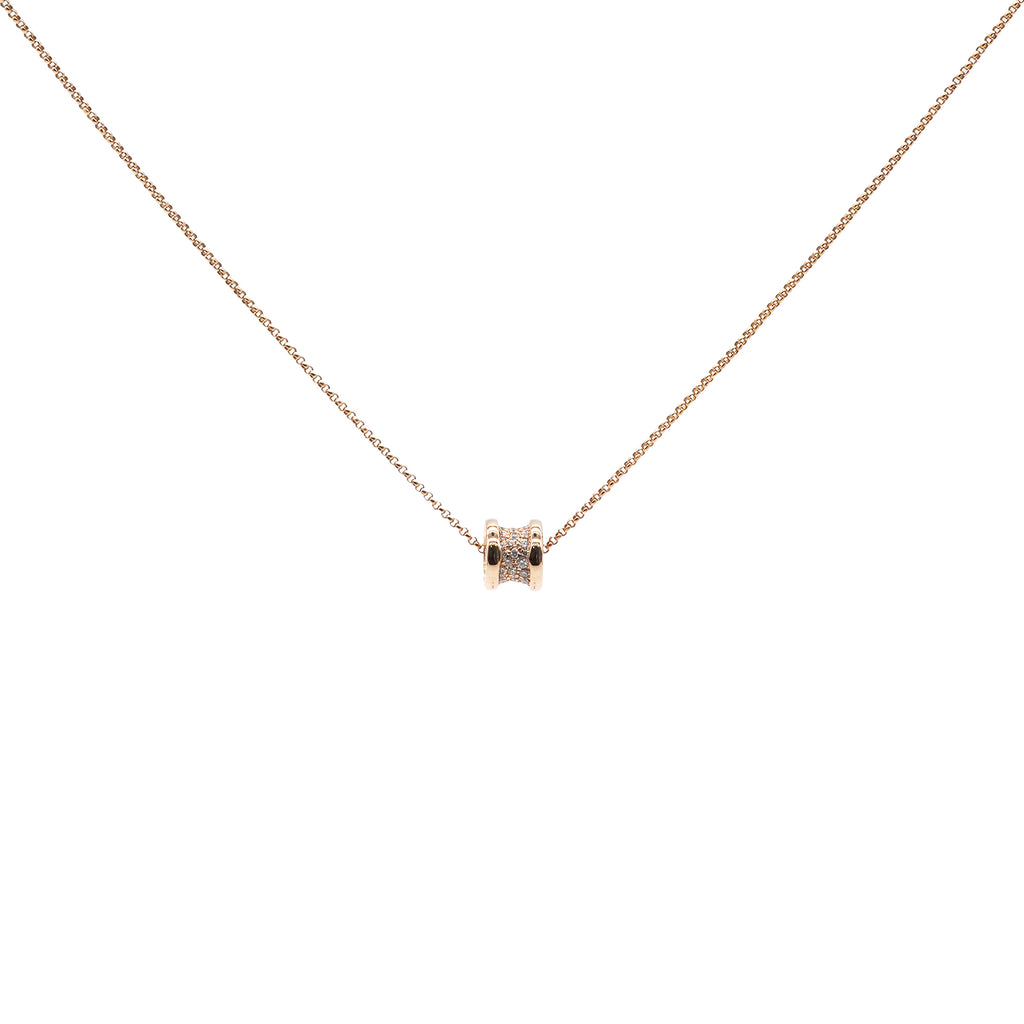 | The necklace is crafted of 18 karat rose gold and features a miniature B.zero pendant accented with diamonds . |