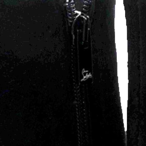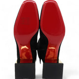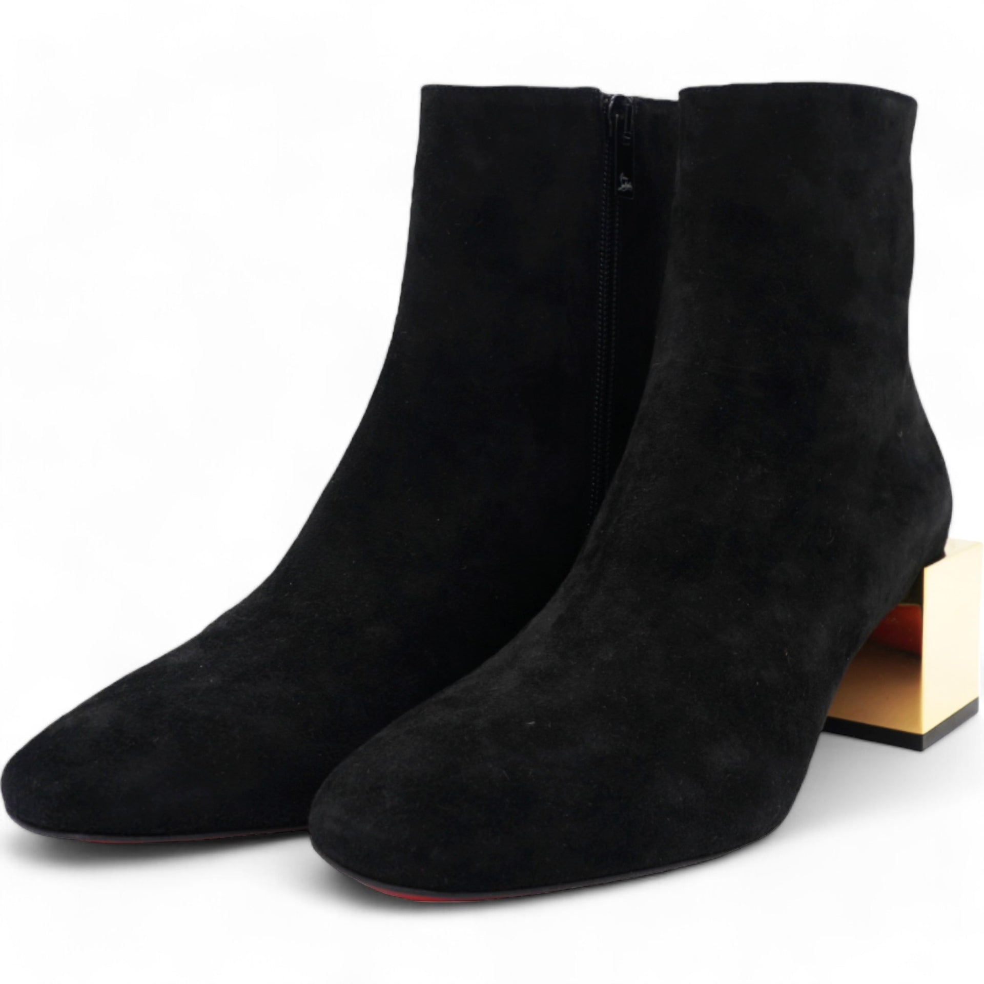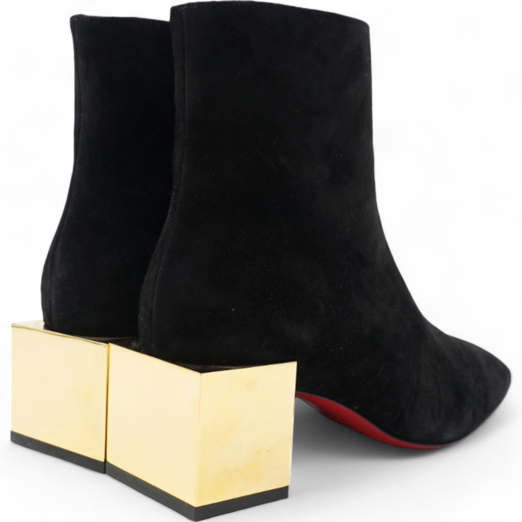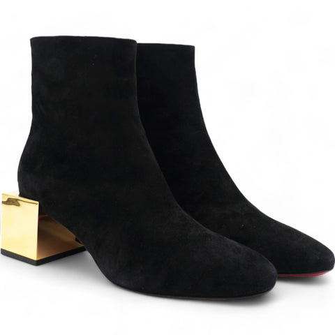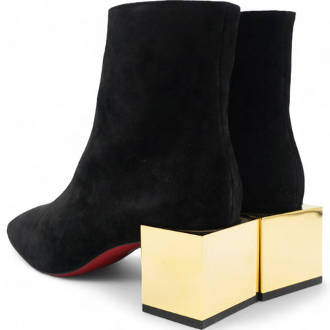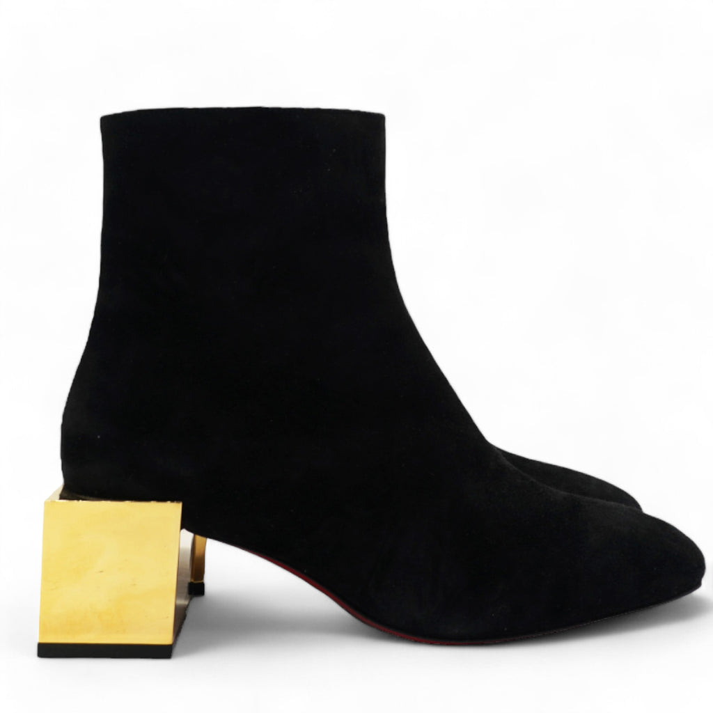 | Make an amazing style statement in these ankle boots from Christian Louboutin.They have been crafted from black suede and styled with square toes.They are adorned with statement block gold heels and come equipped with comfortable leather-lined insoles and the signature red-lacquered soles. |