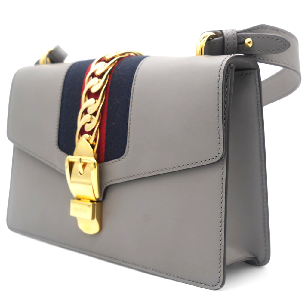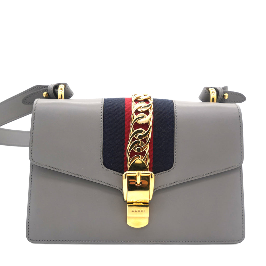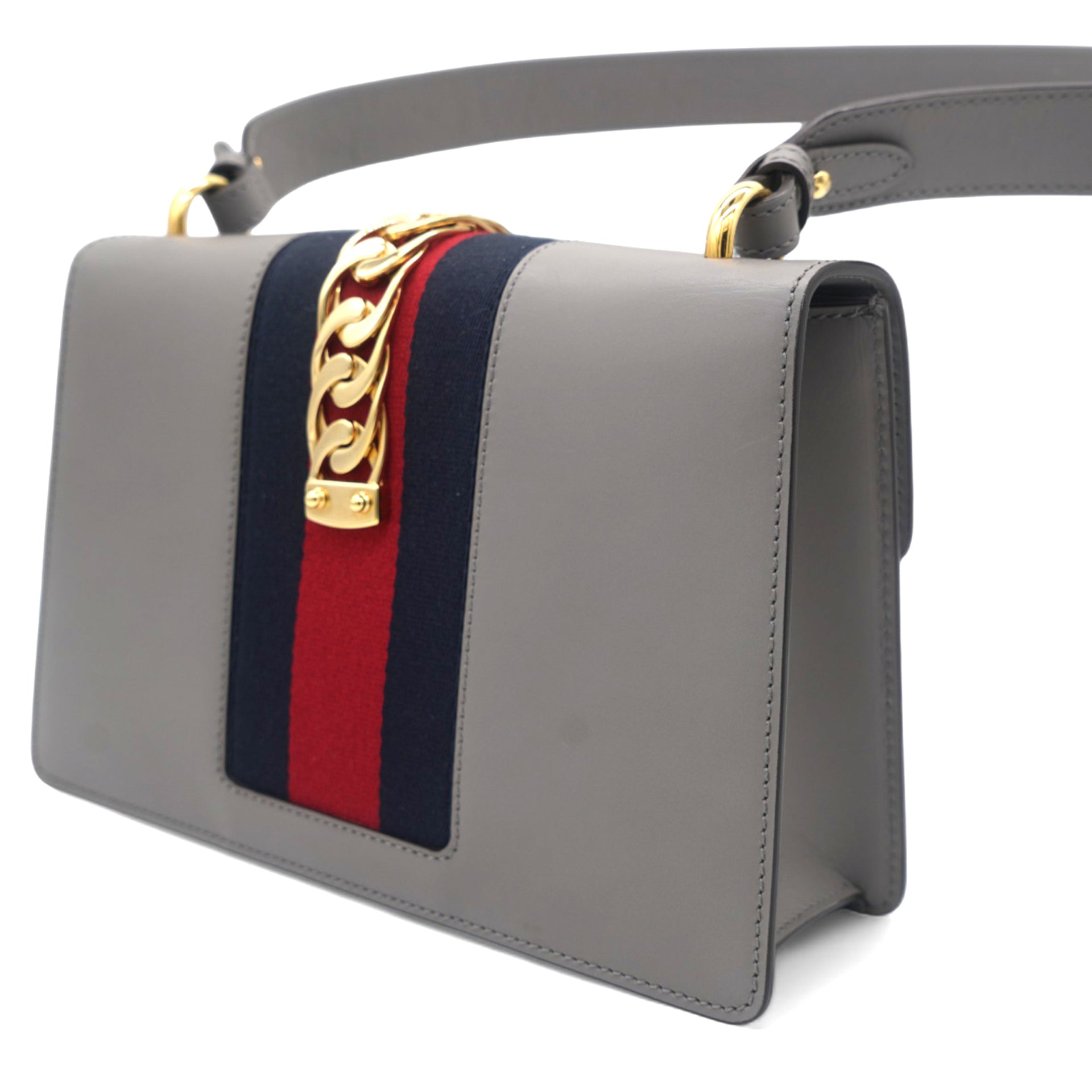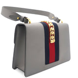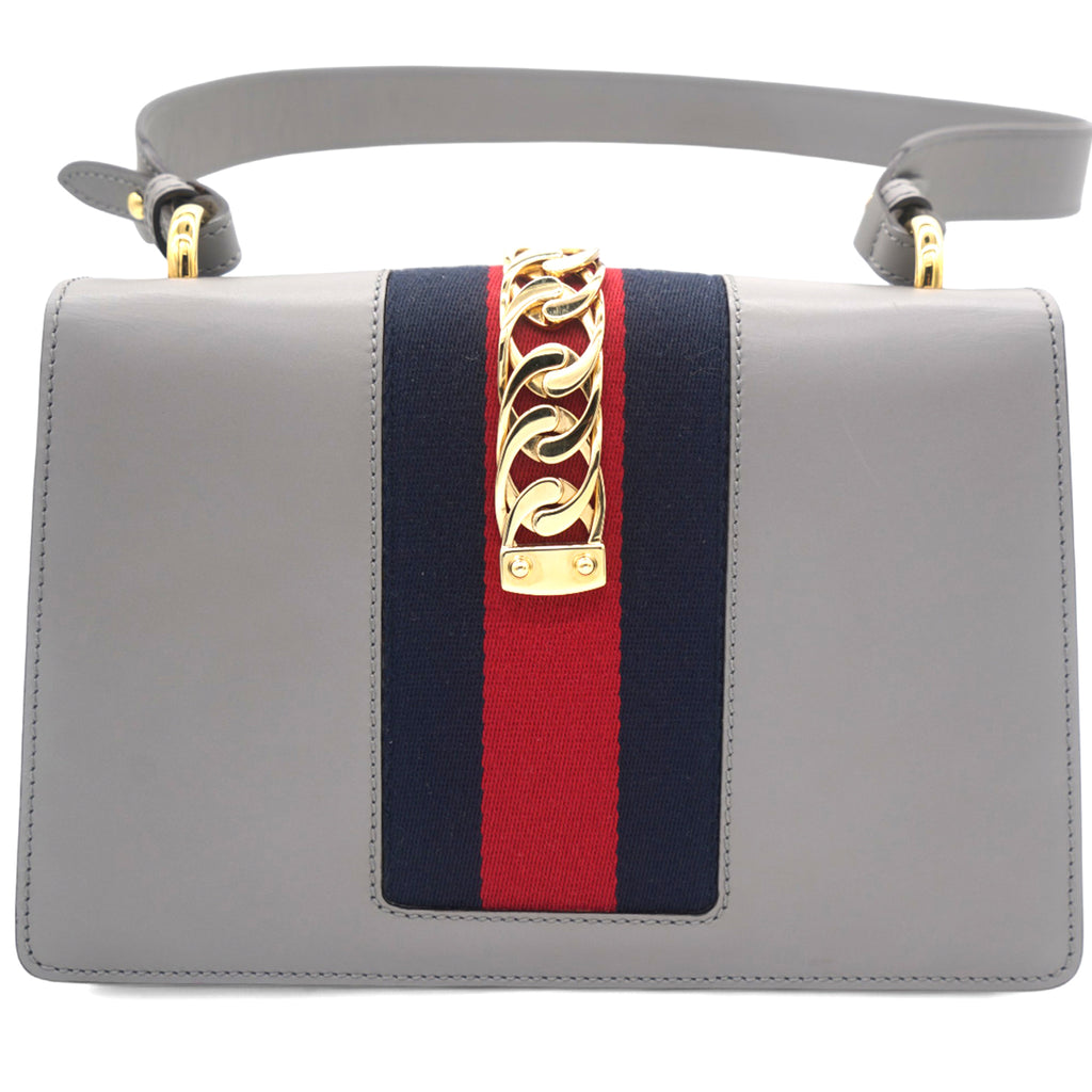 | This structured shoulder bag is crafted of smooth calfskin leather in gray. It features a prominent front flap detailed with a central nylon red and navy blue web stripe embellished with a chain buckle lock closure. This stylish bag has two interchangeable and detachable shoulder straps; one being a classic grey leather strap and the other, a red and navy blue webbed stripe ribbon. The top flap opens to a camel microfiber lining interior with a zipper and patch pocket. This shoulder bag is an ideal statement bag, with the sophisticated style only from Gucci! |