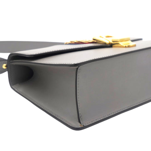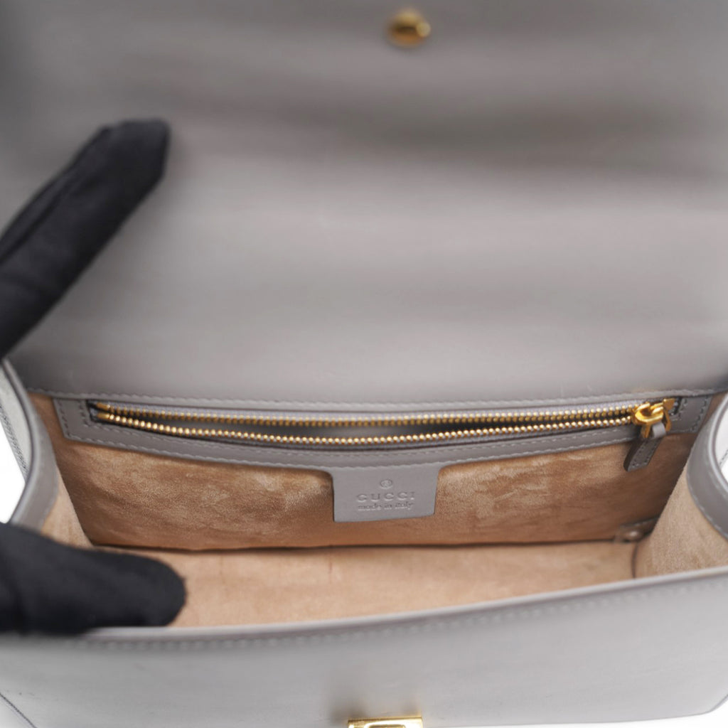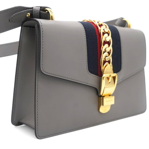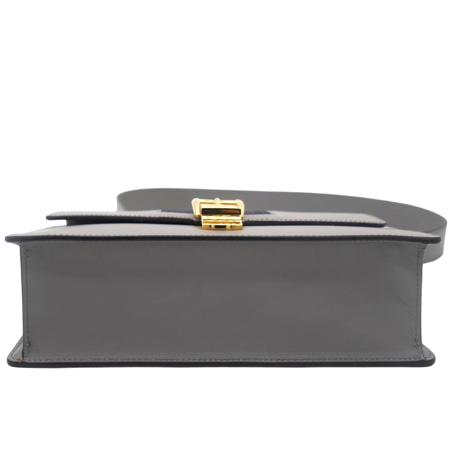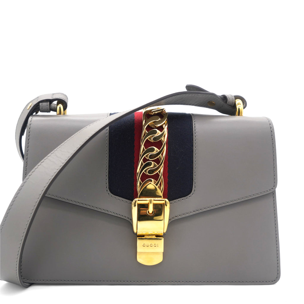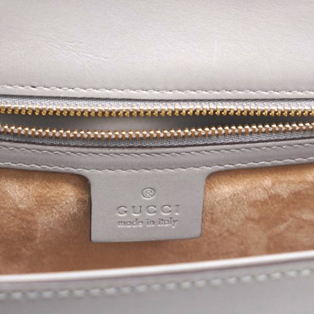| This structured shoulder bag is crafted of smooth calfskin leather in gray. It features a prominent front flap detailed with a central nylon red and navy blue web stripe embellished with a chain buckle lock closure. This stylish bag has two interchangeable and detachable shoulder straps; one being a classic grey leather strap and the other, a red and navy blue webbed stripe ribbon. The top flap opens to a camel microfiber lining interior with a zipper and patch pocket. This shoulder bag is an ideal statement bag, with the sophisticated style only from Gucci! |