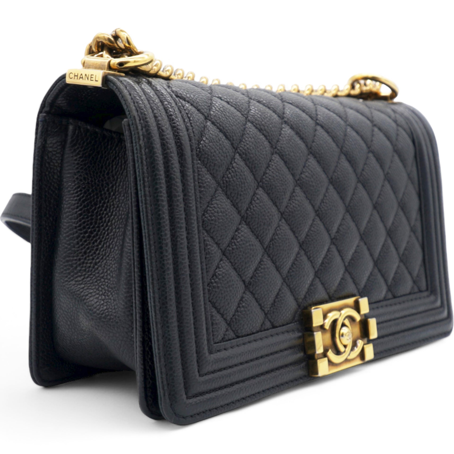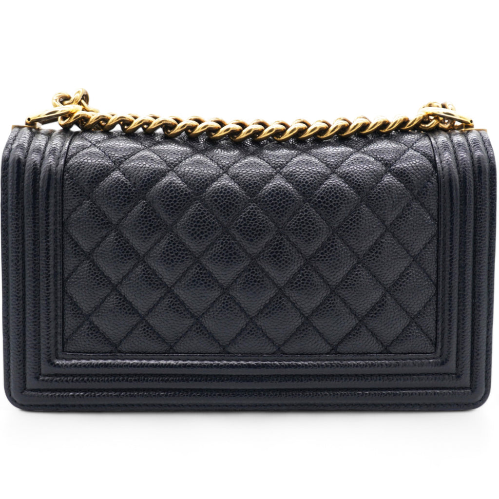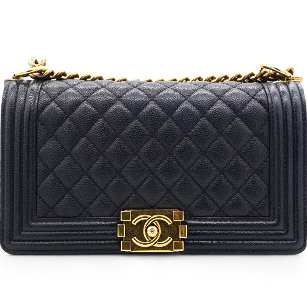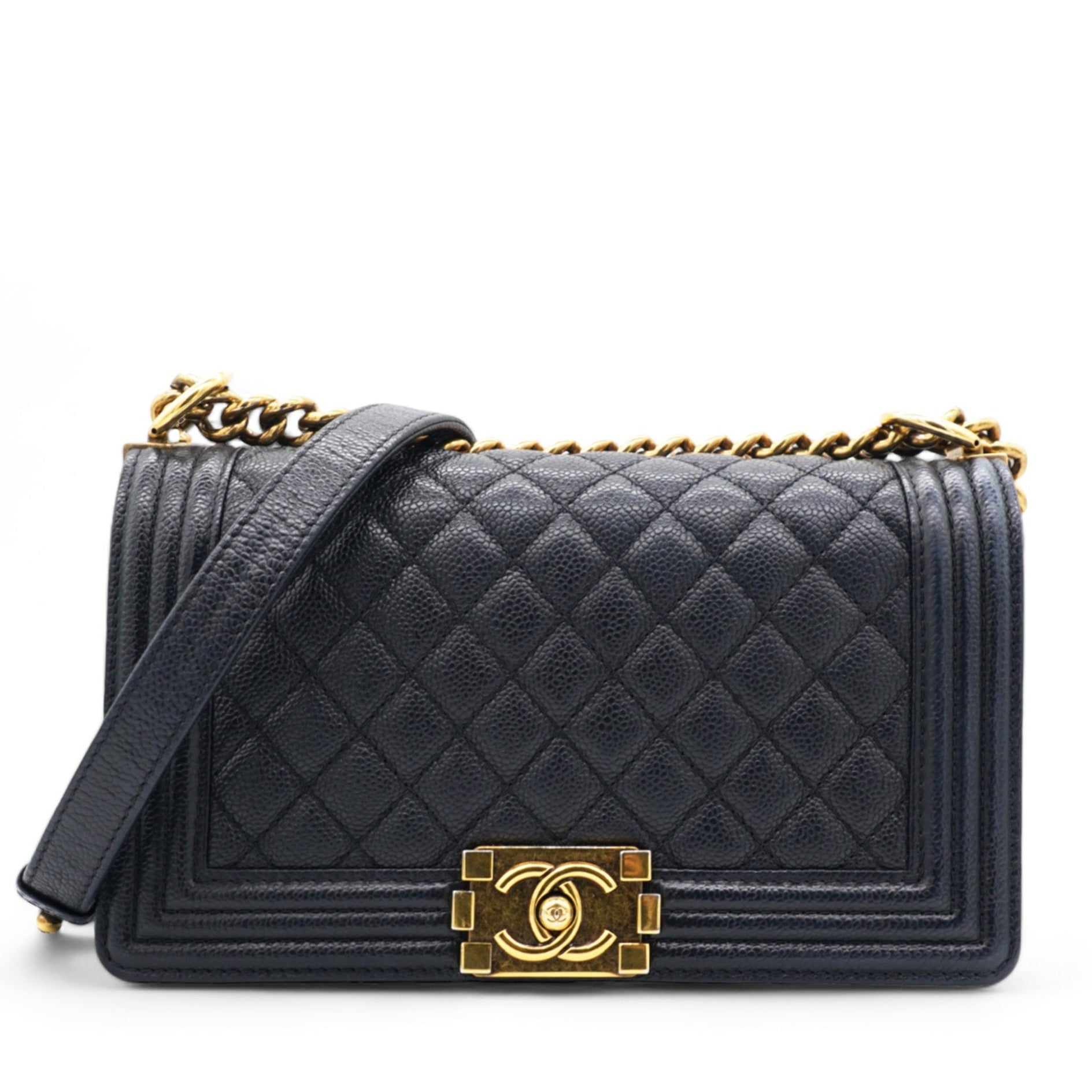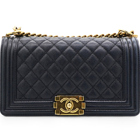 | This chic shoulder bag is crafted of luxurious textured diamond quilted caviar leather with a border of linear quilted leather in blue. The bag features an aged gold chain-link shoulder strap with a shoulder pad and a matching boy CC push lock on the flap. This opens to a navy blue fabric interior with a patch pocket. |