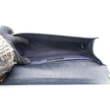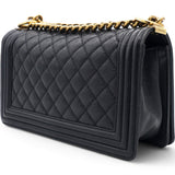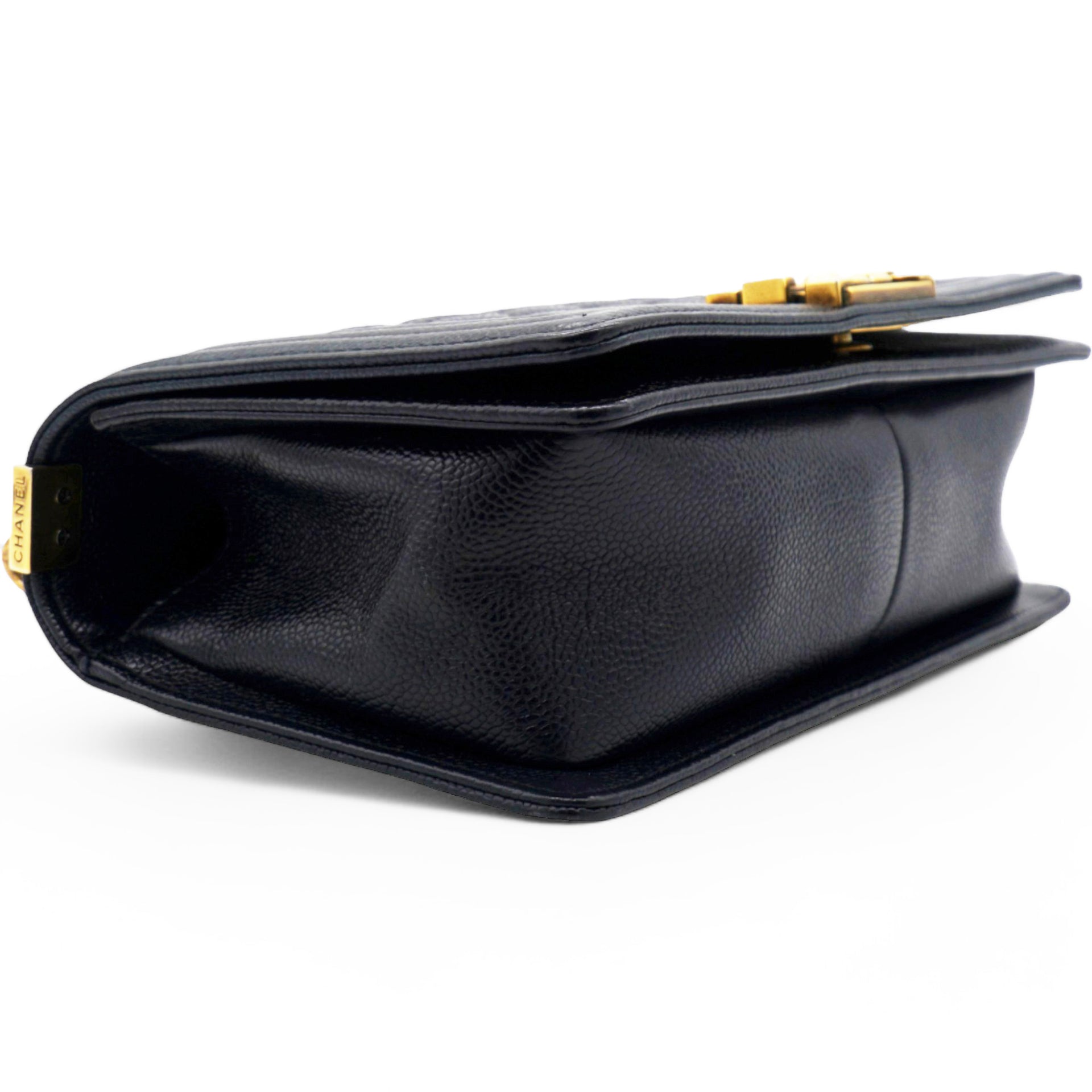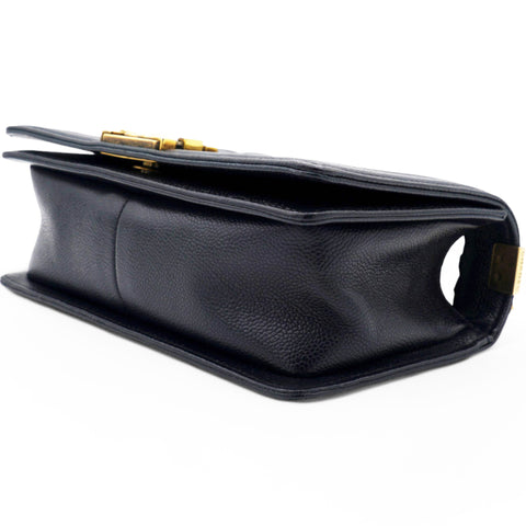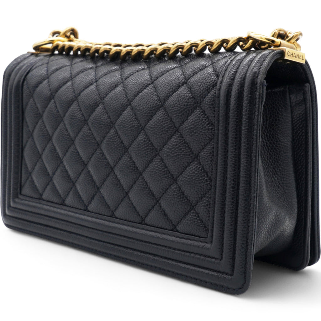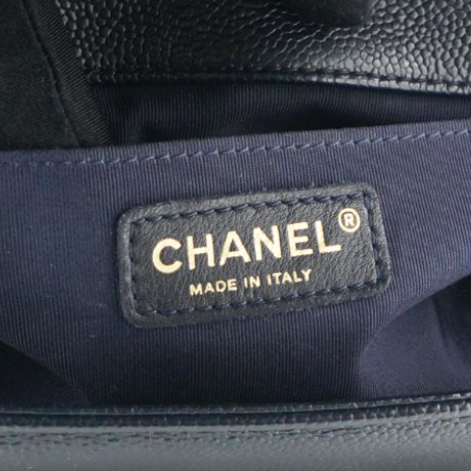 | This chic shoulder bag is crafted of luxurious textured diamond quilted caviar leather with a border of linear quilted leather in blue. The bag features an aged gold chain-link shoulder strap with a shoulder pad and a matching boy CC push lock on the flap. This opens to a navy blue fabric interior with a patch pocket. |