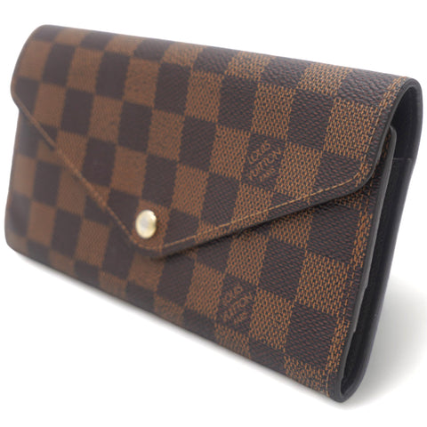 | This wallet is crafted of traditional Louis Vuitton Damier Ebene checkered-coated canvas. It features a gold snap button and opens to a chocolate cross-grain leather interior with card slots, patch pockets, and removable insert. |