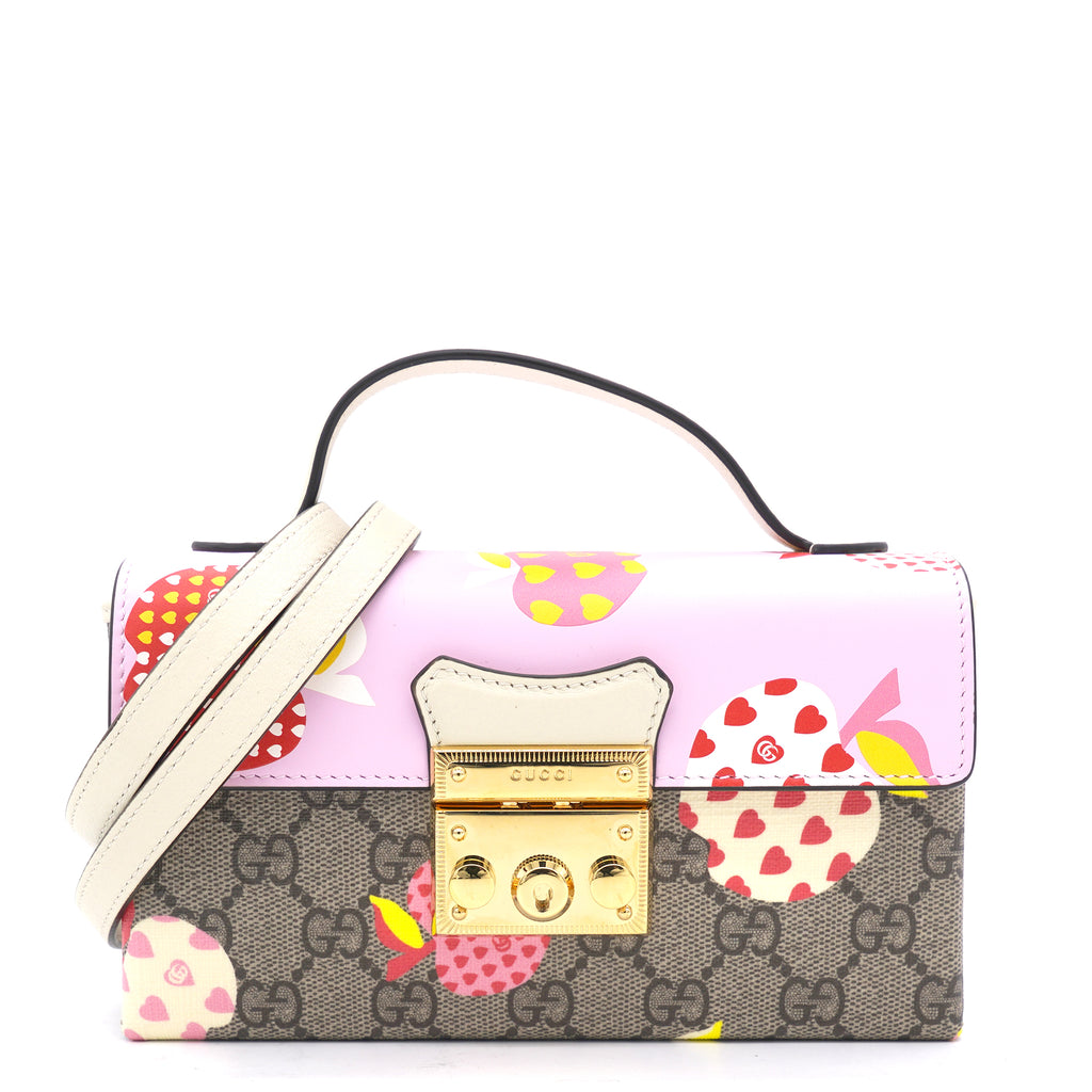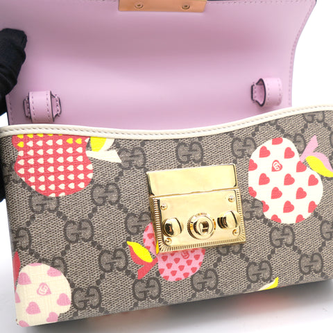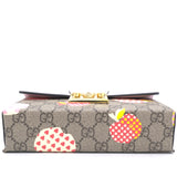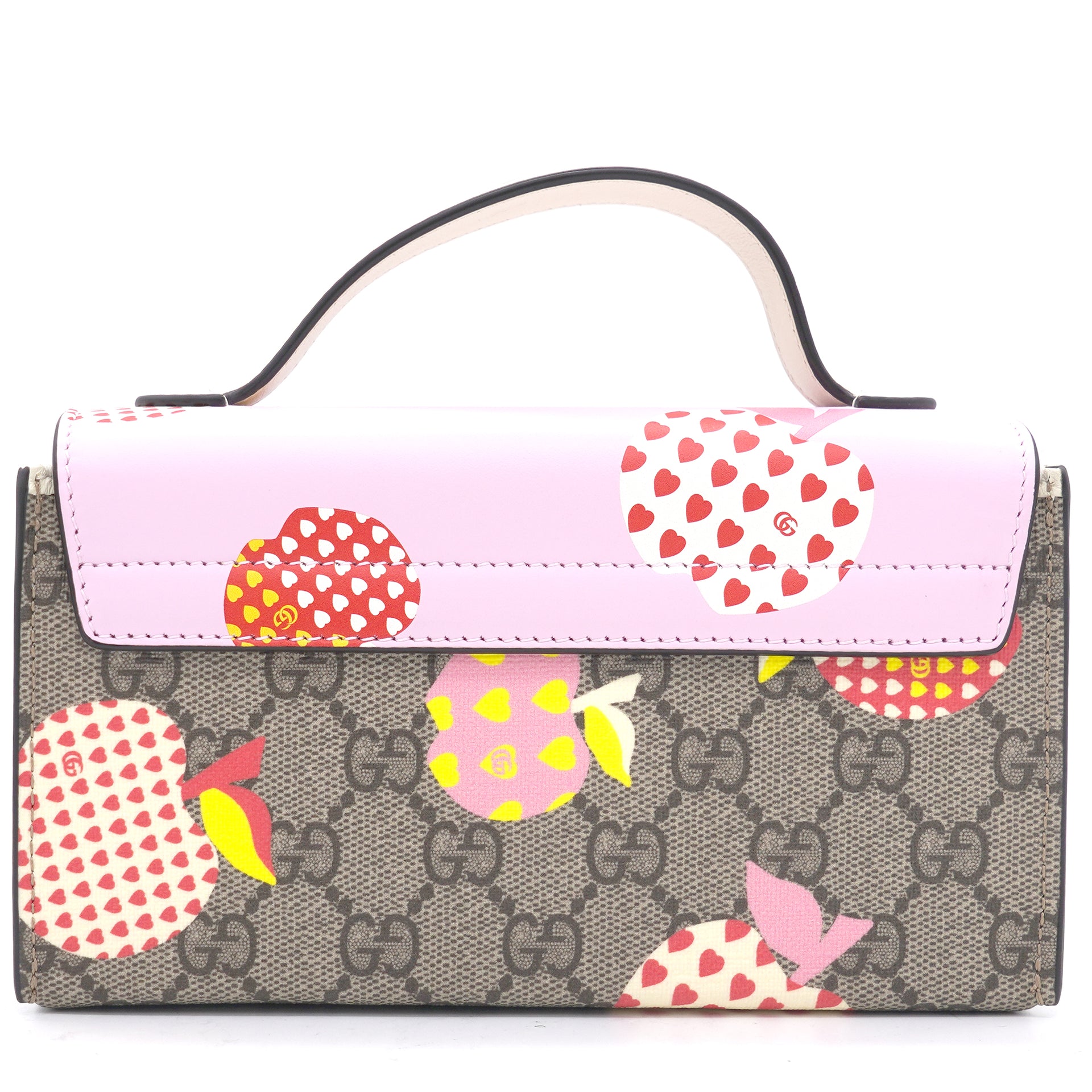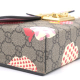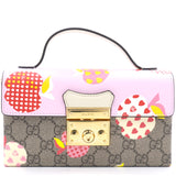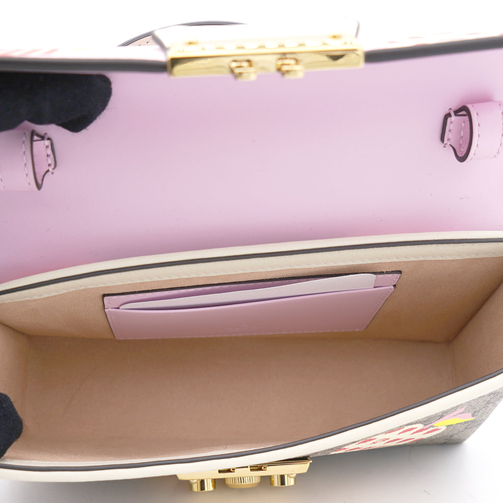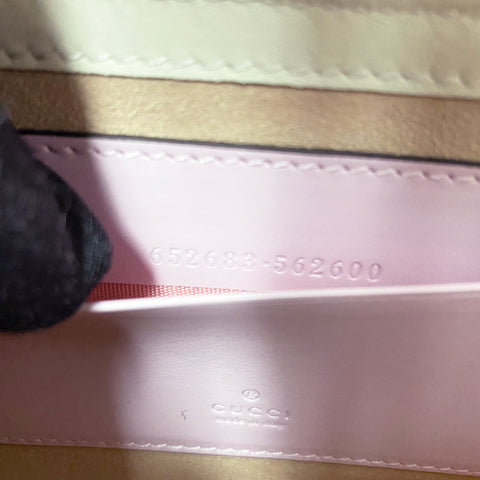 | This stylish shoulder bag is crafted of brown on beige Gucci GG monogram coated canvas. The bag features gold hardware, a smooth pink leather flap and an optional leather shoulder strap. The flap opens to a beige microfiber interior with leather card slots. |