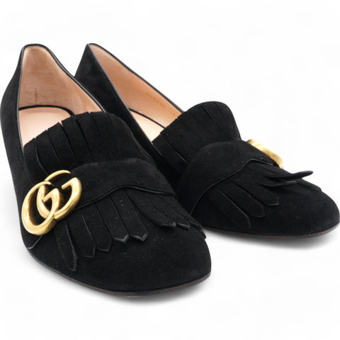 Kid Scamosciato GG Marmont Fringe 50mm Loafer Pumps Black Size38