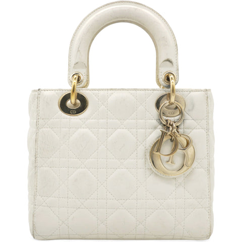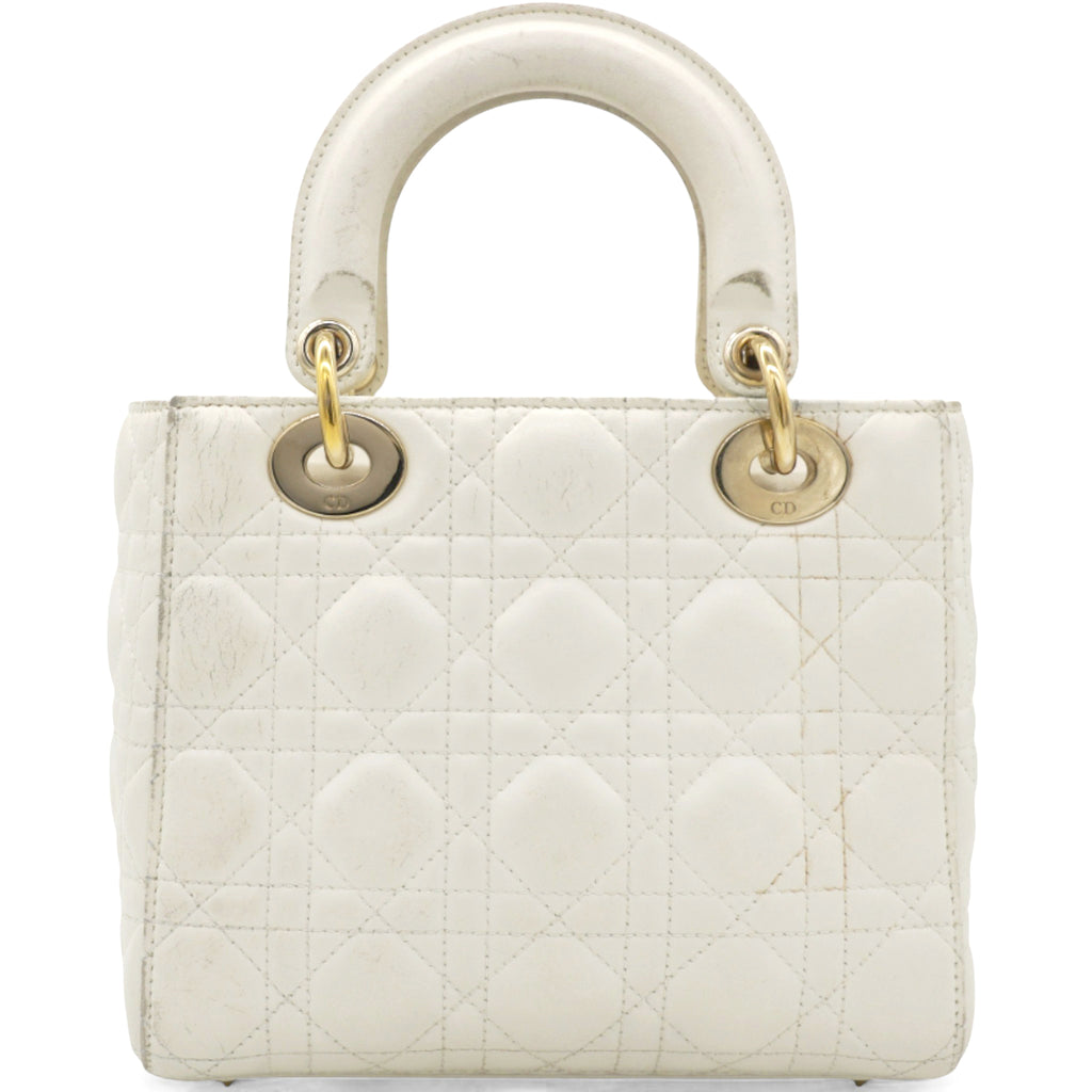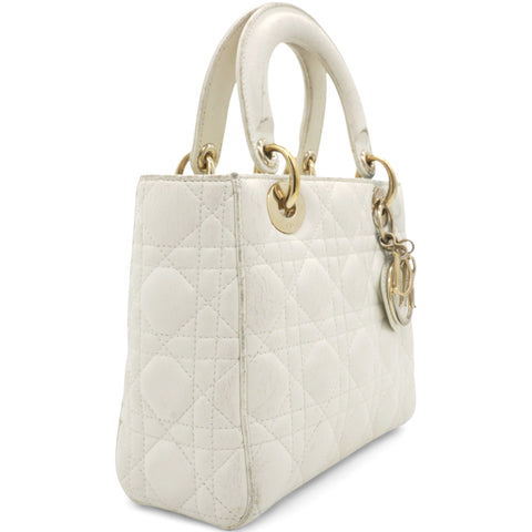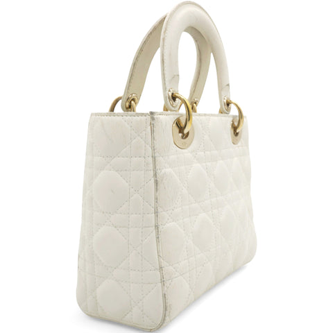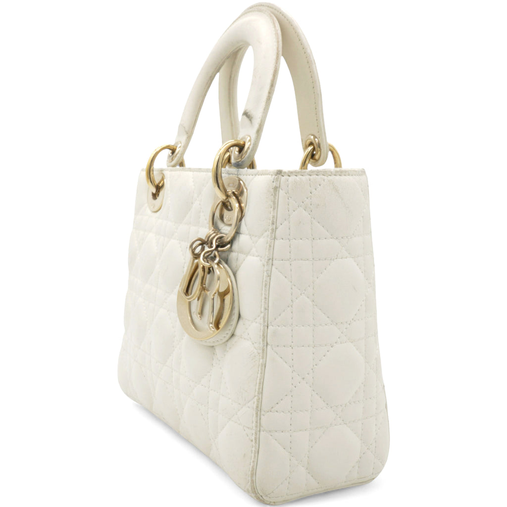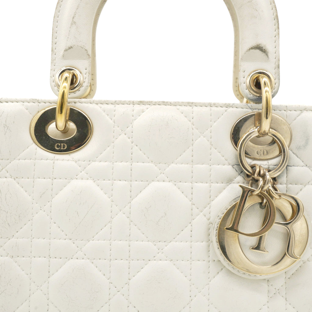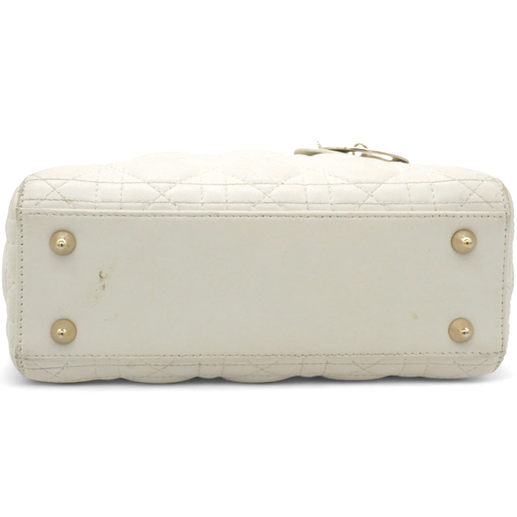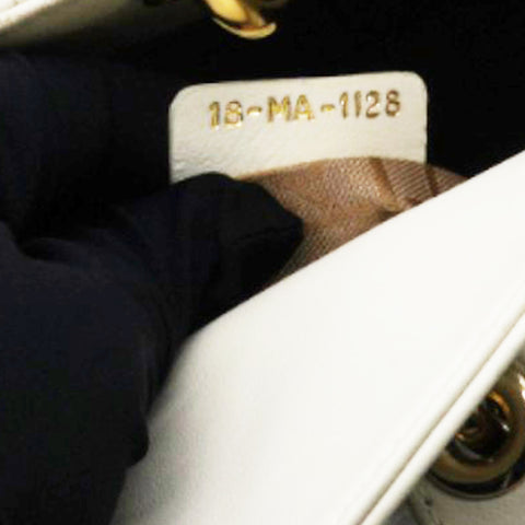 | This chic tote is crafted of quilted lambskin leather in soft white. The bag features sturdy leather top handles with polished gold hardware including hanging Dior initials logo charm. The top opens to a beige Dior monogram jacquard fabric interior with a zipper pocket. |