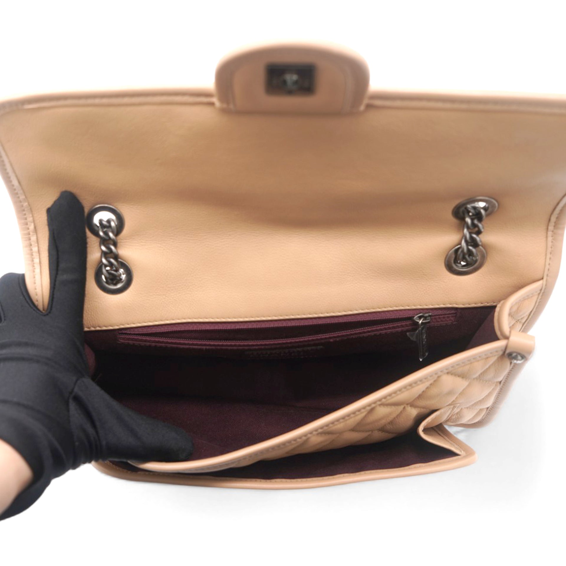 Elevate your style with this Chanel flap chain bag. Merging form and function, this exquisite accessory epitomizes sophistication, ensuring you stand out with elegance and practicality by your side