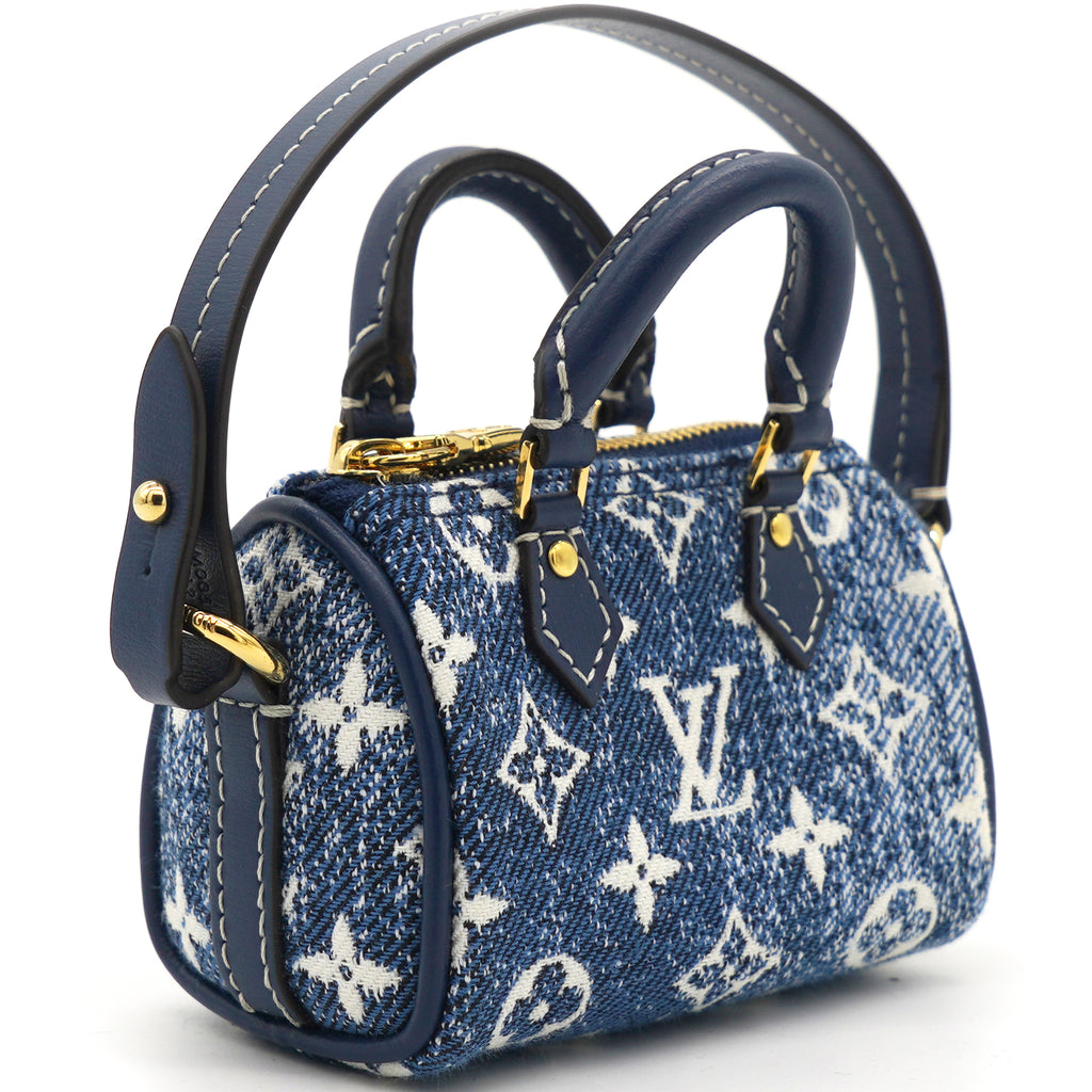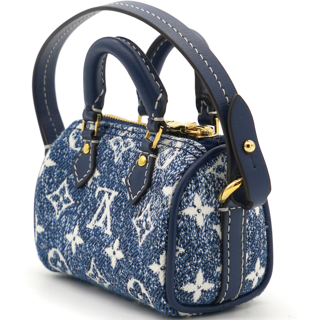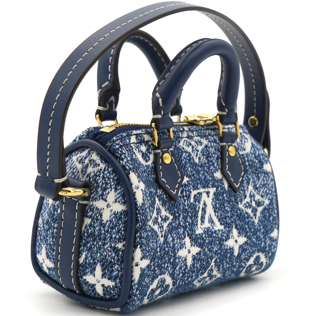 | The Micro Speedy denim bag charm reimagines the House's iconic Speedy bag as a miniature accessory. This mini design is made from pure cotton and features an allover Monogram pattern with a gradient effect. Secure it to bags from the Leather Goods collection using the detachable strap. |