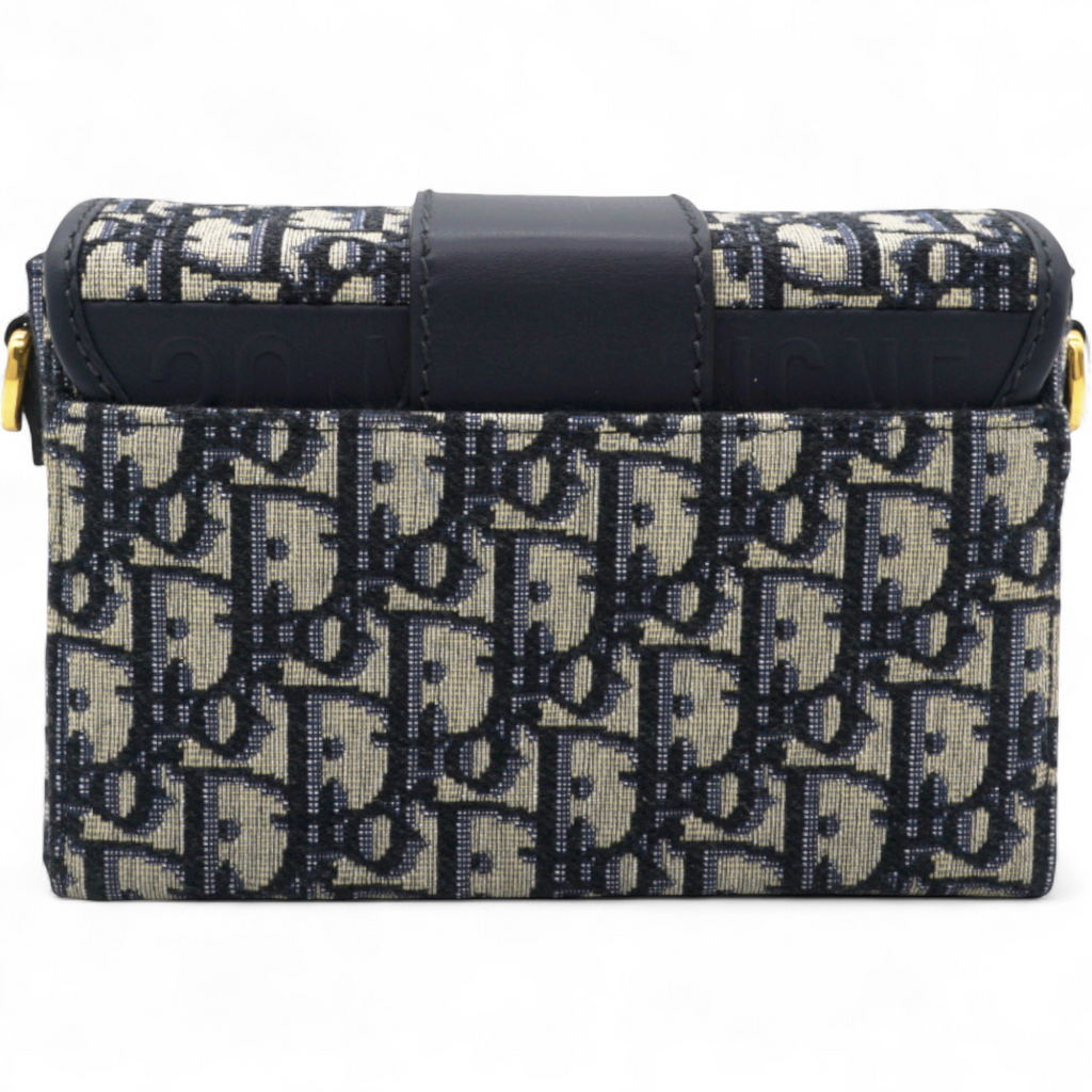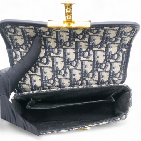 | This handbag is crafted of monogram canvas in beige and blue with matching dark blue leather trim. It features a removable adjustable chain and leather crossbody strap and a rear slip pocket. The crossover flap opens with a CD press lock to a blue fabric interior with a zipper and patch pocket. |