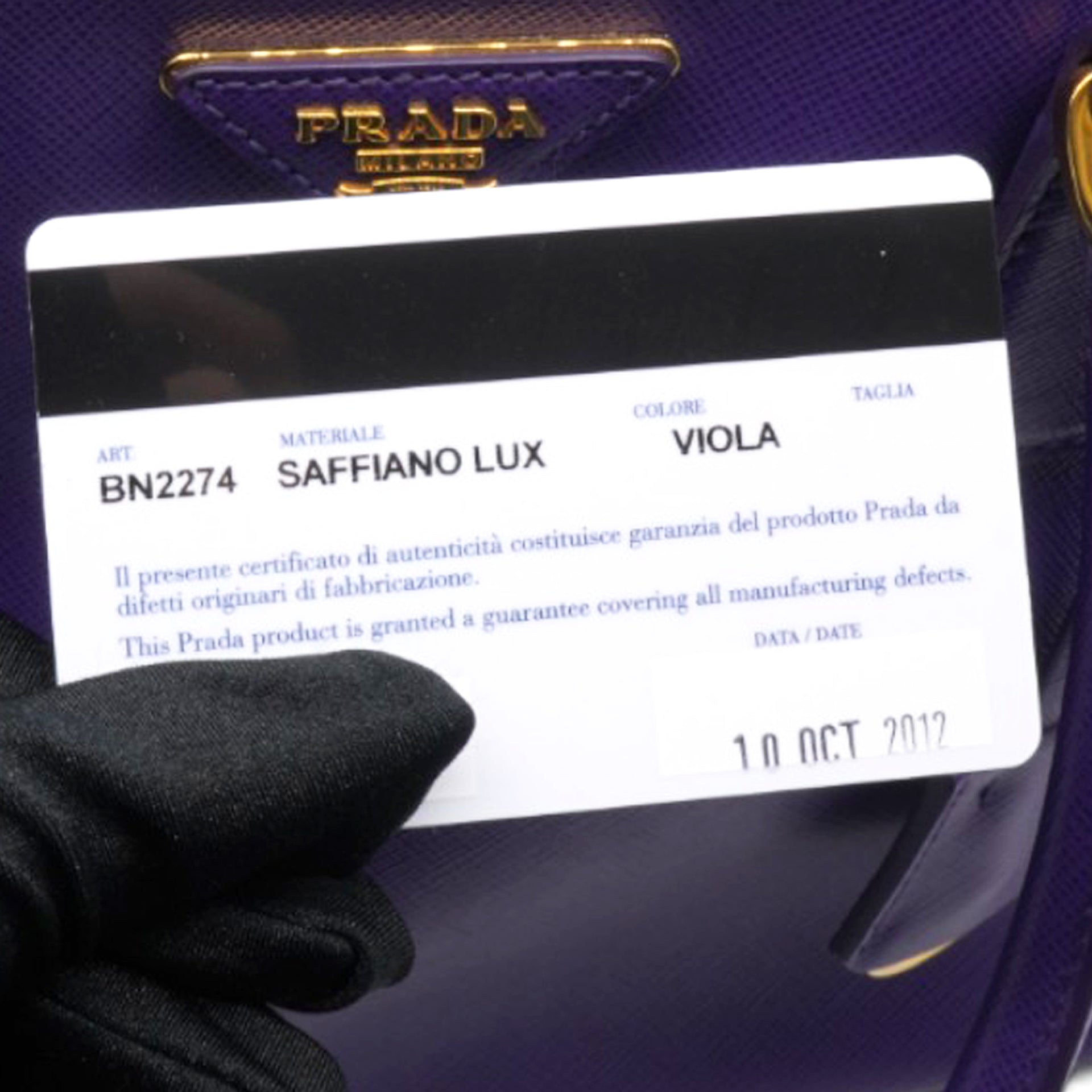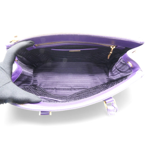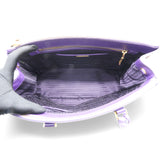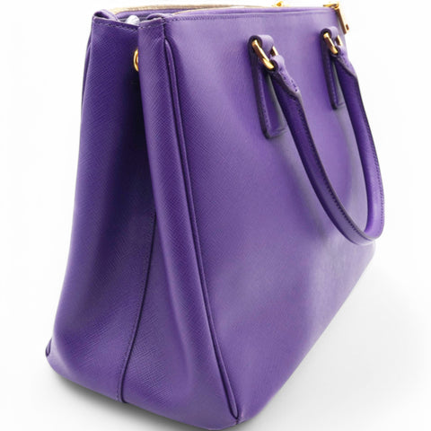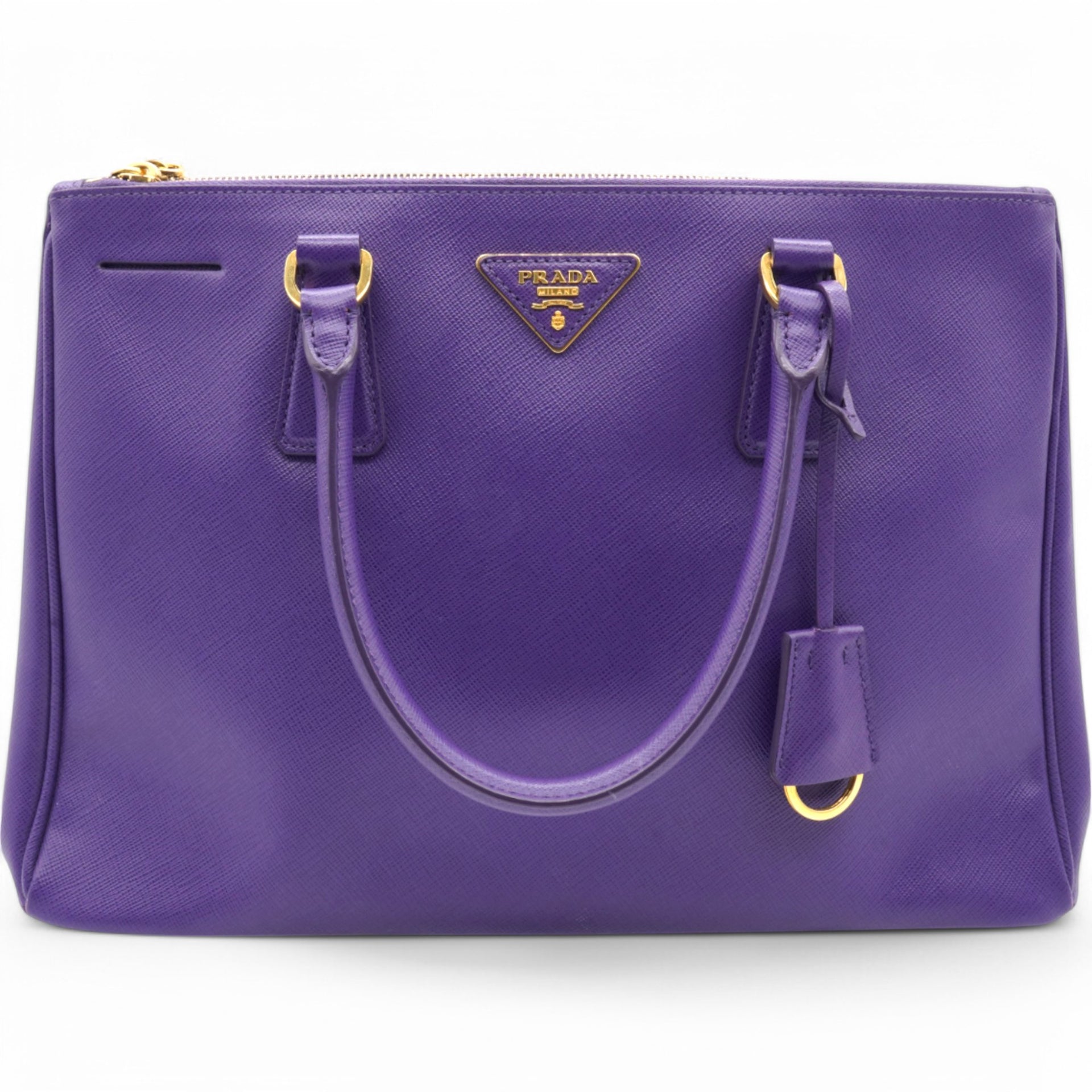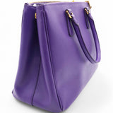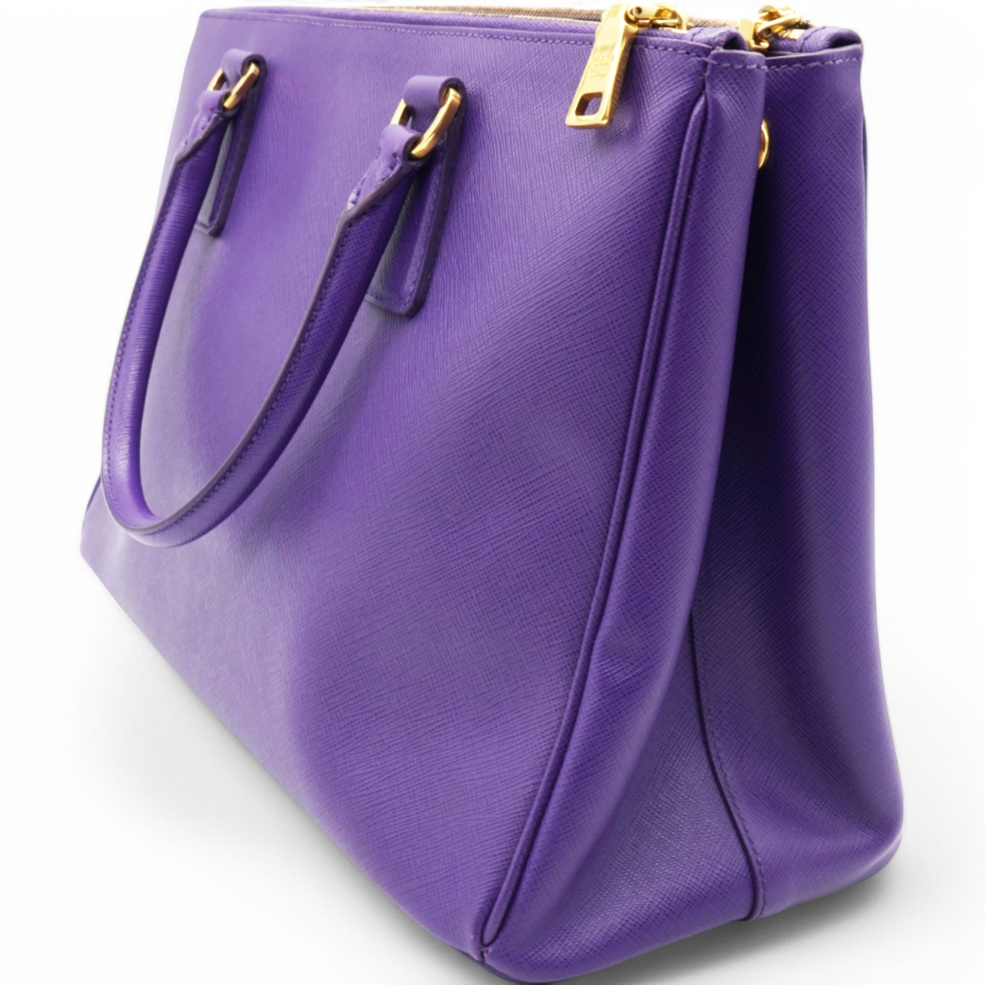 | This chic tote is crafted of violet cross-grain Saffiano leather and features rolled leather top handles with polished brass links and an optional shoulder strap with brass claps. The top features two side full-width zippered compartments and is open to a Prada jacquard monogram interior with a zipper and patch pocket. |